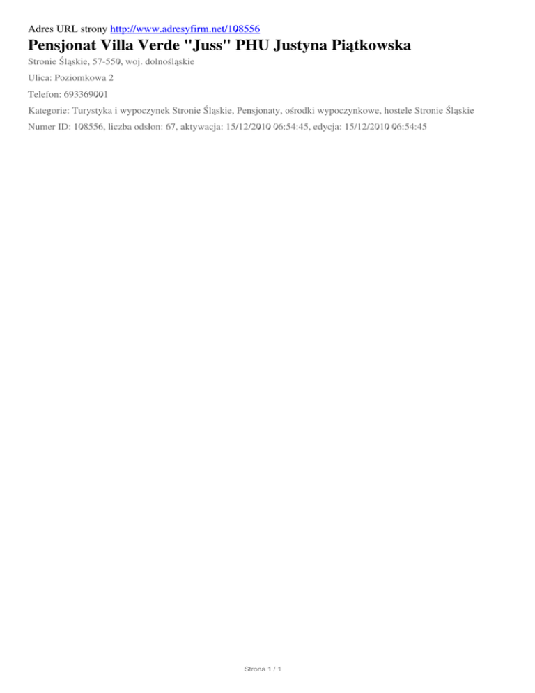 Adres URL strony http://www.adresyfirm.net/108556 Pensjonat Villa Verde "Juss" PHU Justyna Piątkowska Stronie Śląskie, 57-550, woj. dolnośląskie Ulica: Poziomkowa 2 Telefon: 693369001 Kategorie: Turystyka i wypoczynek Stronie Śląskie, Pensjonaty, ośrodki wypoczynkowe, hostele Stronie Śląskie Numer ID: 108556, liczba odsłon: 67, aktywacja: 15/12/2010 06:54:45, edycja: 15/12/2010 06:54:45 Strona 1 / 1