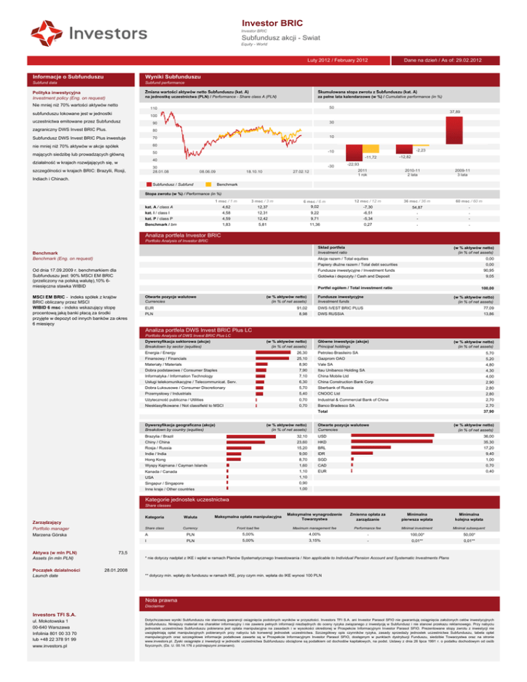 Investor BRIC Investor BRIC Subfundusz akcji - Świat Equity - World Luty 2012 / February 2012 Informacje o Subfunduszu Wyniki Subfunduszu Subfund data Subfund performance Polityka inwestycyjna Investment policy (Eng. on request) Zmiana wartości aktywów netto Subfunduszu (kat. A) na jednostkę uczestnictwa (PLN) / Performance - Share class A (PLN) Nie mniej niż 70% wartości aktywów netto Dane na dzień / As of: 29.02.2012 Skumulowana stopa zwrotu z Subfunduszu (kat. A) za pełne lata kalendarzowe (w %) / Cumulative performance (in %) 50 110 37,89 subfunduszu lokowane jest w jednostki 100 uczestnictwa emitowane przez Subfundusz 90 zagraniczny DWS Invest BRIC Plus. 80 Subfundusz DWS Invest BRIC Plus inwestuje 70 nie mniej niż 70% aktywów w akcje spółek 60 mających siedzibę lub prowadzących główną 50 30 10 -2,23 -10 -11,72 40 działalność w krajach rozwijających się, w -30 30 28.01.08 szczególności w krajach BRIC: Brazylii, Rosji, 08.06.09 18.10.10 -12,82 -22,93 2011 1 rok 27.02.12 2010-11 2 lata 2009-11 3 lata 60 msc / 60 m Indiach i Chinach. Subfundusz / Subfund Benchmark Stopa zwrotu (w %) / Performance (in %) 1 msc / 1 m 3 msc / 3 m 36 msc / 36 m 4,62 12,37 6 msc / 6 m 9,02 12 msc / 12 m kat. A / class A -7,30 54,87 kat. I / class I 4,58 12,31 9,22 -6,51 - - kat. P / class P 4,59 12,42 9,71 -5,34 - - Benchmark / bm 1,83 5,81 11,36 0,27 - - - Analiza portfela Investor BRIC Portfolio Analysis of Investor BRIC Skład portfela Investment ratio Benchmark Benchmark (Eng. on request) (w % aktywów netto) (in % of net assets) Akcje razem / Total equities 0,00 Papiery dłużne razem / Total debt securities Od dnia 17.09.2009 r. benchmarkiem dla Subfunduszu jest: 90% MSCI EM BRIC (przeliczony na polską walutę),10% 6miesięczna stawka WIBID 0,00 Fundusze inwestycyjne / Investment funds 90,95 Gotówka i depozyty / Cash and Deposit 9,05 Portfel ogółem / Total investment ratio MSCI EM BRIC - indeks spółek z krajów BRIC obliczany przez MSCI WIBID 6 msc - indeks wskazujący stopę procentową jaką banki płacą za środki przyjęte w depozyt od innych banków za okres 6 miesięcy Otwarte pozycje walutowe Currencies 100,00 (w % aktywów netto) (in % of net assets) Fundusze inwestycyjne Investment funds (w % aktywów netto) (in % of net assets) EUR 91,02 DWS IVEST BRIC PLUS 77,09 PLN 8,98 DWS RUSSIA 13,86 Analiza portfela DWS Invest BRIC Plus LC Portfolio Analysis of DWS Invest BRIC Plus LC Dywersyfikacja sektorowa (akcje) Breakdown by sector (equities) (w % aktywów netto) (in % of net assets) Główne inwestycje (akcje) Principal holdings (w % aktywów netto) (in % of net assets) Energia / Energy 26,30 Petroleo Brasileiro SA 5,70 Finansowy / Financials 25,10 Gazprom OAO 5,20 Materiały / Materials 8,90 Vale SA 4,80 Dobra podstawowe / Consumer Staples 7,90 Itau Unibanco Holding SA 4,30 Informatyka / Information Technology 7,10 China Mobile Ltd 4,00 Usługi telekomunikacyjne / Telecommunicat. Serv. 6,30 China Construction Bank Corp 2,90 Dobra Luksusowe / Consumer Discretionary 5,70 Sberbank of Russia 2,80 Przemysłowy / Industrials 5,40 CNOOC Ltd 2,80 Użyteczność publiczna / Utilities 0,70 Industrial & Commercial Bank of China 2,70 Niesklasyfikowane / Not classifield to MSCI 0,70 Banco Bradesco SA 2,70 Total Dywersyfikacja geograficzna (akcje) Breakdown by country (equities) (w % aktywów netto) (in % of net assets) 37,90 Otwarte pozycje walutowe Currencies (w % aktywów netto) (in % of net assets) Brazylia / Brazil 32,10 USD 36,00 Chiny / China 23,60 HKD 35,30 Rosja / Russia 15,20 BRL 17,20 Indie / India 9,00 IDR 9,40 Hong Kong 8,70 SGD 1,00 Wyspy Kajmana / Cayman Islands 1,60 CAD 0,70 Kanada / Canada 1,10 EUR 0,40 USA 1,10 Singapur / Singapore 0,90 Inne kraje / Other countries 1,00 Kategorie jednostek uczestnictwa Share classes Zarządzający Portfolio manager Marzena Górska Aktywa (w mln PLN) Assets (in mln PLN) Początek działalności Launch date Kategoria Waluta Maksymalna opłata manipulacyjna Maksymalne wynagrodzenie Towarzystwa Zmienna opłata za zarządzanie Minimalna pierwsza wpłata Minimalna kolejna wpłata Share class Currency Front load fee Maximum management fee Performance fee Minimal investment Minimal subsequent A PLN 5,00% 4,00% - 100,00* 50,00* I PLN 5,00% 3,15% - 0,01** 0,01** 73,5 * nie dotyczy nadpłat z IKE i wpłat w ramach Planów Systematycznego Inwestowania / Non applicable to Individual Pension Account and Systematic Investments Plans 28.01.2008 ** dotyczy min. wpłaty do funduszu w ramach IKE, przy czym min. wpłata do IKE wynosi 100 PLN Nota prawna Disclaimer Investors TFI S.A. ul. Mokotowska 1 00-640 Warszawa Infolinia 801 00 33 70 lub +48 22 378 91 99 www.investors.pl Dotychczasowe wyniki Subfunduszu nie stanowią gwarancji osiągnięcia podobnych wyników w przyszłości. Investors TFI S.A. ani Investor Parasol SFIO nie gwarantują osiągnięcia założonych celów inwestycyjnych Subfunduszu. Niniejszy materiał ma charakter informacyjny i nie zawiera pełnych informacji niezbędnych do oceny ryzyka związanego z inwestycją w Subfundusz i nie stanowi przekazu reklamowego. Przy nabyciu jednostek uczestnictwa Subfunduszu pobierana jest opłata manipulacyjna na zasadach i w wysokości określonej w Prospekcie Informacyjnym Investor Parasol SFIO. Prezentowane stopy zwrotu z inwestycji nie uwzględniają opłat manipulacyjnych pobieranych przy nabyciu lub konwersji jednostek uczestnictwa. Szczegółowy opis czynników ryzyka, zasady sprzedaży jednostek uczestnictwa Subfunduszu, tabela opłat manipulacyjnych oraz szczegółowe informacje podatkowe zawarte są w Prospekcie Informacyjnym Investor Parasol SFIO, dostępnym w punktach dystrybucji Funduszu, siedzibie Towarzystwa oraz na stronie www.investors.pl. Zyski osiągnięte z inwestycji w jednostki uczestnictwa Subfunduszu obciążone są podatkiem od dochodów kapitałowych, na podst. Ustawy z dnia 26 lipca 1991 r. o podatku dochodowym od osób fizycznych, (Dz. U. 00.14.176 z późniejszym