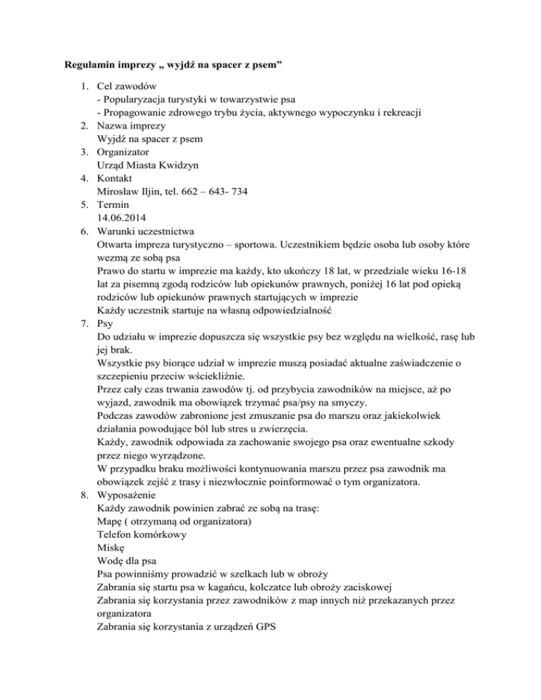 Regulamin imprezy „ wyjdź na spacer z psem” 1. Cel zawodów - Popularyzacja turystyki w towarzystwie psa - Propagowanie zdrowego trybu życia, aktywnego wypoczynku i rekreacji 2. Nazwa imprezy Wyjdź na spacer z psem 3. Organizator Urząd Miasta Kwidzyn 4. Kontakt Mirosław Iljin, tel. 662 – 643- 734 5. Termin 14.06.2014 6. Warunki uczestnictwa Otwarta impreza turystyczno – sportowa. Uczestnikiem będzie osoba lub osoby które wezmą ze sobą psa Prawo do startu w imprezie ma każdy, kto ukończy 18 lat, w przedziale wieku 16-18 lat za pisemną zgodą rodziców lub opiekunów prawnych, poniżej 16 lat pod opieką rodziców lub opiekunów prawnych startujących w imprezie Każdy uczestnik startuje na własną odpowiedzialność 7. Psy Do udziału w imprezie dopuszcza się wszystkie psy bez względu na wielkość, rasę lub jej brak. Wszystkie psy biorące udział w imprezie muszą posiadać aktualne zaświadczenie o szczepieniu przeciw wściekliźnie. Przez cały czas trwania zawodów tj. od przybycia zawodników na miejsce, aż po wyjazd, zawodnik ma obowiązek trzymać psa/psy na smyczy. Podczas zawodów zabronione jest zmuszanie psa do marszu oraz jakiekolwiek działania powodujące ból lub stres u zwierzęcia. Każdy, zawodnik odpowiada za zachowanie swojego psa oraz ewentualne szkody przez niego wyrządzone. W przypadku braku możliwości kontynuowania marszu przez psa zawodnik ma obowiązek zejść z trasy i niezwłocznie poinformować o tym organizatora. 8. Wyposażenie Każdy zawodnik powinien zabrać ze sobą na trasę: Mapę ( otrzymaną od organizatora) Telefon komórkowy Miskę Wodę dla psa Psa powinniśmy prowadzić w szelkach lub w obroży Zabrania się startu psa w kagańcu, kolczatce lub obroży zaciskowej Zabrania się korzystania przez zawodników z map innych niż przekazanych przez organizatora Zabrania się korzystania z urządzeń GPS Wyposażenie zawodników może być sprawdzane przez sędziego przed startem. 9. Przybliżony program zawodów 9:00 Zapisy 10:00 Start 13:00 Zakończenie imprezy 10. Dystans Trasa będzie liczyć ok. 5 km 11. Trasa Start i miejsce: Miłosna, Miejsce rekreacyjne przy Cyganówce