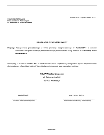 Katowice, dn. 10 października 2011 r. UNIWERSYTET ŚLĄSKI Dział Zamówień Publicznych Ul. Bankowa 12, 40-007 Katowice INFORMACJA O ZAWARCIU UMOWY Dotyczy: Postępowania prowadzonego w trybie przetargu nieograniczonego nr RU/DW/75/11 o wartości zamówienia nie przekraczającej kwoty stanowiącej równowartość kwoty 193.000 € na dostawę mebli akademickich. Informujemy, iż w dniu 22 września 2011 r. została zawarta umowa z Wykonawcą, którego oferta zgodnie z kryterium oceny ofert określonym w Specyfikacji Istotnych Warunków Zamówienia została uznana za najkorzystniejszą PHUP Wiesław Zajączek ul. Zdunowska 201 63-700 Krotoszyn mgr Łukasz Motyka Aneta Knapik ………………………………………… Sekretarz Komisji Przetargowej …………………………………………………… Przewodniczący Komisji Przetargowej Strona 1 z 1