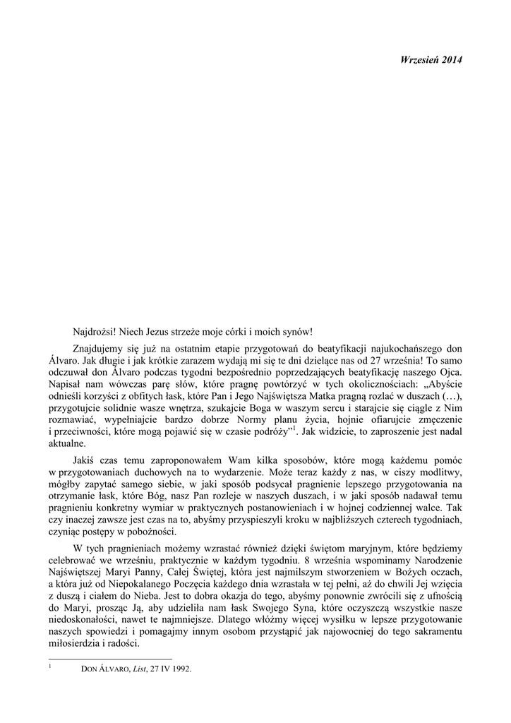 Wrzesień 2014 Najdrożsi! Niech Jezus strzeże moje córki i moich synów! Znajdujemy się już na ostatnim etapie przygotowań do beatyfikacji najukochańszego don Álvaro. Jak długie i jak krótkie zarazem wydają mi się te dni dzielące nas od 27 września! To samo odczuwał don Álvaro podczas tygodni bezpośrednio poprzedzających beatyfikację naszego Ojca. Napisał nam wówczas parę słów, które pragnę powtórzyć w tych okolicznościach: „Abyście odnieśli korzyści z obfitych łask, które Pan i Jego Najświętsza Matka pragną rozlać w duszach (…), przygotujcie solidnie wasze wnętrza, szukajcie Boga w waszym sercu i starajcie się ciągle z Nim rozmawiać, wypełniajcie bardzo dobrze Normy planu życia, hojnie ofiarujcie zmęczenie i przeciwności, które mogą pojawić się w czasie podróży”1. Jak widzicie, to zaproszenie jest nadal aktualne. Jakiś czas temu zaproponowałem Wam kilka sposobów, które mogą każdemu pomóc w przygotowaniach duchowych na to wydarzenie. Może teraz każdy z nas, w ciszy modlitwy, mógłby zapytać samego siebie, w jaki sposób podsycał pragnienie lepszego przygotowania na otrzymanie łask, które Bóg, nasz Pan rozleje w naszych duszach, i w jaki sposób nadawał temu pragnieniu konkretny wymiar w praktycznych postanowieniach i w hojnej codziennej walce. Tak czy inaczej zawsze jest czas na to, abyśmy przyspieszyli kroku w najbliższych czterech tygodniach, czyniąc postępy w pobożności. W tych pragnieniach możemy wzrastać również dzięki świętom maryjnym, które będziemy celebrować we wrześniu, praktycznie w każdym tygodniu. 8 września wspominamy Narodzenie Najświętszej Maryi Panny, Całej Świętej, która jest najmilszym stworzeniem w Bożych oczach, a która już od Niepokalanego Poczęcia każdego dnia wzrastała w tej pełni, aż do chwili Jej wzięcia z duszą i ciałem do Nieba. Jest to dobra okazja do tego, abyśmy ponownie zwrócili się z ufnością do Maryi, prosząc Ją, aby udzieliła nam łask Swojego Syna, które oczyszczą wszystkie nasze niedoskonałości, nawet te najmniejsze. Dlatego włóżmy więcej wysiłku w lepsze przygotowanie naszych spowiedzi i pomagajmy innym osobom przystąpić jak najowocniej do tego sakramentu miłosierdzia i radości. 1 DON ÁLVARO, List, 27 IV 1992. 12 września przypada kolejne wspomnienie liturgiczne: Najświętszego Imienia Maryi. Jak wielką radością dla duszy jest wypowiadanie tego Imienia! Skoro imię Jezusa, jak powiedział św. Bernard, jest „miodem w ustach moich, słodką melodią w uszach, radosną uciechą w sercu”2, to samo odnosi się do imienia Maryi. W związku z tym zachęcam Was, abyśmy w najbliższych dniach włożyli więcej miłości w wypowiadanie modlitwy Zdrowaś Maryjo, zwłaszcza podczas różańca. To wezwanie słodkiego imienia wybranego przez Boga, choć powtarzane, a jednak wciąż dźwięczące na nowo, jest niczym balsam, który niweluje przeciwności; jest jak muzyka, która zachwyca uszy serca; jest też jak pokarm pełen smaku dla podniebienia. W połowie miesiąca, 15 września, będziemy wspominać Najświętszą Maryję Pannę bolesną, która iuxta crucem Iesu, pod Krzyżem Chrystusa, najściślej zjednoczyła się z ofiarą Swojego Syna i przyjęła nas jako Jej synów3. Cóż więcej mógłbym tu dodać ponad to, że do naszych modlitw powinniśmy jeszcze dodać smaczną przyprawę umartwienia? W ten sposób łatwiej będzie poruszyć naszego Pana, aby obdarzył nas Swoimi darami. Nic dziwnego zatem, że Kościół wspomina cierpienie Najświętszej Maryi Panny dzień po święcie Podwyższenia Krzyża Świętego. Nasza Matka pragnie zachęcić nas do wielkiego nabożeństwa do Chrystusa Ukrzyżowanego i do czułego i synowskiego nabożeństwa do Najświętszej Maryi Panny, Matki Boga i Matki Naszej, która stoi wyprostowana, pełna męstwa, przeszyta bólem, niemal całkowicie osamotniona, tuż obok Krzyża. Synowie moi, przemyślcie to sobie dobrze – mówi dalej św. Josemaría. Powiedzcie coś naszemu Panu i powiedzcie coś Jego Matce. Powiedzcie jej to, co powiedzielibyście Waszej własnej matce, gdybyście widzieli ją tak obrażaną i źle traktowaną, na którą wszyscy patrzą z politowaniem. A wszystko to z miłości do Jej Syna. Ona dobrowolnie pozwala się ukrzyżować wraz z Nim, doświadczając hańby i przyjmując upokorzenia4. Ponadto 15 września przypada rocznica wyboru don Álvaro na pierwszego następcę św. Josemaríi na czele Opus Dei. Zachęcam Was, abyście często odmawiali modlitwę z obrazka za wstawiennictwem don Álvaro i powierzali Mu potrzeby Kościoła, Dzieła, całego świata i wszystkich ludzi. Wobec tego podzielonego świata, wobec ludzi żyjących ze sobą w nieprzyjaźni, wobec rodzin rozdartych przez niezgodę, Boża obietnica pokoju i jedności, zwiastowana w Starym Testamencie i ostatecznie potwierdzona w Nowym, jest obietnicą pełną nadziei: wskazuje na przyszłość, którą Bóg przygotowuje nam już teraz, jak powiedział Papież Franciszek. I dodał: Jednakże obietnica ta jest nierozerwalnie związana z nakazem: poleceniem powrotu do Boga i posłuszeństwa całym sercem Jego prawu (Pwt 30, 2–3). Boże dary pojednania, jedności i pokoju są nierozerwalnie związane z łaską nawrócenia, przemiany serca, która może zmienić bieg naszego życia i historii, jako jednostek i jako narodu5. Wreszcie 24 września w niektórych miejscach obchodzi się wspomnienie Najświętszej Maryi Panny z Merced. Ten Jej wizerunek jest szczególnie związany z historią Dzieła: to przed nim wiele razy modlił się nasz Ojciec, zwłaszcza w 1946 roku, jadąc do Rzymu i wracając z Wiecznego Miasta. W jej ręce, z pomocą don Álvaro, ufnie powierzmy owoce duchowe tych dni, które nas czekają. Podobnie, jak w liście z poprzedniego miesiąca, ponownie Was proszę o to, abyście nie opuszczali tych, którzy cierpią i są prześladowani z powodu swojej wiary w wielu częściach 