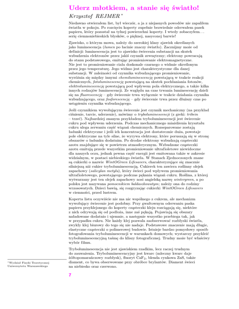 Uderz młotkiem, a stanie się światło! Krzysztof REJMER * Niedawno otwierałem list, był wieczór, a ja z niejasnych powodów nie zapaliłem światła w pokoju. Po rozcięciu koperty zupełnie bezwiednie oderwałem pasek papieru, który pozostał na tylnej powierzchni koperty. I wtedy zobaczyłem. . . serię ciemnoniebieskich błysków, o pięknej, nasyconej barwie! Zjawisko, o którym mowa, należy do szerokiej klasy zjawisk określanych jako luminescencja (lumen po łacinie znaczy światło). Zacznijmy może od definicji: luminescencja jest to zjawisko świecenia substancji na skutek wzbudzenia elektronów przez jakiś czynnik zewnętrzny; elektrony powracają do stanu podstawowego, emitując promieniowanie elektromagnetyczne. Nie jest to promieniowanie ciała doskonale czarnego o widmie określonym przez jego temperaturę. Jego widmo jest charakterystyczne dla danej substancji. W zależności od czynnika wzbudzającego promieniowanie, wyróżnia się między innymi chemiluminescencję powstającą w trakcie reakcji chemicznych, fotoluminescencję powstającą na skutek pochłaniania fotonów, elektroluminescencję powstającą pod wpływem pola elektrycznego, a także kilka innych rodzajów luminescencji. Ze względu na czas trwania luminescencję dzieli się na fluorescencję – gdy świecenie trwa wyłącznie w trakcie działania czynnika wzbudzającego, oraz fosforescencję – gdy świecenie trwa przez dłuższy czas po ustąpieniu czynnika wzbudzającego. Jeśli czynnikiem wywołującym świecenie jest czynnik mechaniczny (na przykład ciśnienie, tarcie, uderzenie), mówimy o tryboluminescencji (z greki: tribein – trzeć). Najbardziej znanym przykładem tryboluminescencji jest świecenie cukru pod wpływem uderzenia. Podczas mechanicznego miażdżenia kryształu cukru ulega zerwaniu część wiązań chemicznych. Rozseparowane zostają ładunki elektryczne i jeśli ich koncentracja jest dostatecznie duża, powstaje pole elektryczne na tyle silne, że wyrywa elektrony, które poruszają się w stronę obszarów o ładunku dodatnim. Po drodze elektrony wzbudzają cząsteczki azotu znajdujące się w powietrzu atmosferycznym. Wzbudzone cząsteczki azotu emitują przede wszystkim promieniowanie ultrafioletowe niewidoczne dla naszych oczu, jednak pewna część energii jest emitowana także w zakresie widzialnym, w postaci niebieskiego światła. W Stanach Zjednoczonych znane są cukierki o nazwie WintOGreen Lifesavers, charakteryzujące się znacznie silniejszą niż cukier tryboluminescencją. Cukierek ten zawiera roślinny olejek zapachowy (salicylan metylu), który świeci pod wpływem promieniowania ultrafioletowego, powstającego podczas pękania wiązań cukru. Roślina, z której wytwarzany jest ten olejek zapachowy nosi angielską nazwę wintergreen, a po polsku jest nazywana pomocnikiem baldaszkowatym; należy ona do rodziny wrzosowatych. Dzieci bawią, się rozgryzając cukierki WintOGreen Lifesavers w ciemności, przed lustrem. Koperta listu oczywiście nie ma nic wspólnego z cukrem, ale mechanizm wywołujący świecenie jest podobny. Przy gwałtownym oderwaniu paska papieru przyklejonego do koperty cząsteczki kleju rozciągają się, niektóre z nich odrywają się od podłoża, inne zaś pękają. Pojawiają się obszary naładowane dodatnio i ujemnie, a następnie wszystko przebiega tak, jak w przypadku cukru. Nie każdy klej pozwala zaobserwować rozbłyski światła, zwykły klej biurowy do tego się nie nadaje. Podstawowe znaczenie mają długie, elastyczne cząsteczki o polimerowej budowie. Istnieje bardzo pomysłowy sposób fotografowania tryboluminescencji w warunkach domowych; wystarczy przykleić tryboluminescencyjną taśmę do kliszy fotograficznej. Trudny może być właściwy wybór filmu. ∗ Wydział Fizyki Teoretycznej Uniwersytetu Warszawskiego Tryboluminescencja nie jest zjawiskiem rzadkim, lecz raczej trudnym do zauważenia. Tryboluminescencyjny jest kwarc (mleczny kwarc daje żółtopomarańczowy rozbłysk), fluoryt CaF2 , blenda cynkowa ZnS, także diament, co bywa obserwowane przy obróbce brylantów. Diament świeci na niebiesko oraz czerwono. 7 Często tryboluminescencja wiąże się ze zjawiskiem piezoelektryczności. Asymetryczne molekuły mają zdolność separowania elektronów podczas ściskania lub rozciągania, jednak nie wszystkie piezoelektryki są tryboluminescencyjne. I na odwrót, nie wszystkie materiały tryboluminescencyjne są piezoelektrykami. Defekty, zanieczyszczenia i nieporządek także sprzyjają tryboluminescencji, ponieważ elektrony mogą się chętnie zbierać tam, gdzie pojawiają się nieregularności sieci krystalicznej. Zaburzenie mechaniczne nie musi zrywać wiązań chemicznych, może dostarczyć energię potrzebną zgromadzonym w pobliżu defektu elektronom do pokonania bariery potencjału i przejścia do stanu podstawowego. Pierwszy opis zjawiska tryboluminescencji pochodzi od Francisa Bacona, który nocą 1605 roku, krusząc głowę cukru trzcinowego, zaobserwował świecenie, a następnie opisał to w The Advancement of Learning. W 1663 roku tryboluminescencję opisał także Robert Boyle. Po raz kolejny zjawisko to zostało odkryte w USA, kiedy powstały przemysłowe metody wytwarzania dużych kryształów cukru. Kryształy cukru przed transportem formowano w duże stożki, które były rozbijane u odbiorcy, co pozwoliło zaobserwować rozbłysk światła. Tryboluminescencja jest ciekawym zjawiskiem, jak dotąd słabiej poznanym niż inne rodzaje luminescencji. W pierwszej chwili wydaje się, że to tylko pozbawiona znaczenia ciekawostka. Jednak można wymyślić potencjalne, praktyczne zastosowania tryboluminescencji. Na przykład powłoki sygnalizujące rozbłyskiem światła mechaniczne uszkodzenie. Taki detektor mógłby wykrywać nawet niewielkie uszkodzenia, które niezauważone, mogą powiększać się i w przyszłości spowodować groźną katastrofę. Znane są doniesienia o światłach widywa