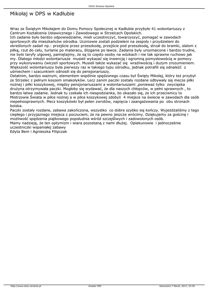 CKZiU Strzelce Opolskie Mikołaj w DPS w Kadłubie Wraz ze Świętym Mikołajem do Domu Pomocy Społecznej w Kadłubie przybyło 41 wolontariuszy z Centrum Kształcenia Ustawicznego i Zawodowego w Strzelcach Opolskich. Ich zadanie było bardzo odpowiedzialne, mieli uczestniczyć, towarzyszyć, pomagać w zawodach sportowych dla mieszkańców ośrodka. Uczniowie zostali podzieleni na zespoły i przydzieleni do określonych zadań np.: przejście przez przeszkodę, przejście pod przeszkodą, strzał do bramki, slalom z piłką, rzut do celu, turlanie po materacu, ślizganie po ławce. Zadania były urozmaicone i bardzo trudne, nie było taryfy ulgowej, pamiętajmy, że są to często osoby na wózkach i nie tak sprawne ruchowo jak my. Dlatego młodzi wolontariusze musieli wykazać się inwencją i ogromną pomysłowością w pomocy przy wykonywaniu ćwiczeń sportowych. Musieli także wykazać się wrażliwością i dużym zrozumieniem. Większość wolontariuszy była pierwszy raz w takiego typu ośrodku, jednak potrafili się odnaleźć z uśmiechem i szacunkiem odnosili się do pensjonariuszy. Ostatnim, bardzo ważnym, elementem wspólnie spędzonego czasu był Święty Mikołaj, który też przybył ze Strzelec z pełnym koszem smakołyków. Lecz zanim paczki zostały rozdane odbywały się mecze piłki nożnej i piłki koszykowej, między pensjonariuszami a wolontariuszami ,ponieważ tylko zwycięska drużyna otrzymywała paczki. Mogłoby się wydawać, że dla naszych chłopców, w pełni sprawnych , to bardzo łatwe zadanie. Jednak tu czekała ich niespodzianka, bo okazało się, że ich przeciwnicy to Mistrzowie Świata w piłce nożnej a w piłce koszykowej zdobyli 4 miejsce na świecie w zawodach dla osób niepełnosprawnych. Mecz koszykówki był pełen zwrotów, napięcia i zaangażowania po obu stronach boiska. Paczki zostały rozdane, zabawa zakończona, wszystko co dobre szybko się kończy. Wyjeżdżaliśmy z tego ciepłego i przyjaznego miejsca z poczuciem, że na pewno jeszcze wrócimy. Dziękujemy za gościnę i możliwość spędzenia piątkowego popołudnia wśród szczęśliwych i zadowolonych osób. Mamy nadzieję, że ten optymizm i wiara pozostaną z nami dłużej. Opiekunowie i jednocześnie uczestniczki wspaniałej zabawy Edyta Bem i Agnieszka Filipczak http://www.ckziu-strzelce.pl Kreator PDF Utworzono 7 March, 2017, 23:55