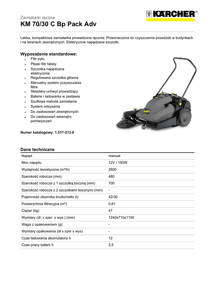 Zamiatarki ręczne KM 70/30 C Bp Pack Adv Lekka, kompaktowa zamiatarka prowadzona ręcznie. Przeznaczona do czyszczenia posadzek w budynkach i na terenach zewnętrznych. Elektrycznie napędzane szczotki. Wyposażenie standardowe: • • • • • • • • • • • Filtr pyłu Płaski filtr falisty Szczotka napędzana elektrycznie Regulowana szczotka główna Manualny system oczyszczania filtra Składany uchwyt prowadzący Baterie i ładowarka w zestawie Szuflowa metoda zamiatania System odsysania Do zastosowań zewnętrznych Do zastosowań wewnątrz pomieszczeń Numer katalogowy: 1.517-213.0 Dane techniczne Napęd manual Moc napędu 12V / 150W Wydajność teoretyczna (m²/h) 2800 Szerokość robocza (mm) 480 Szerokość robocza z 1 szczotką boczną (mm) 700 Szerokość robocza z 2 szczotkami bocznymi (mm) - Pojemność zbiornika brutto/netto (l) 42/30 Powierzchnia filtracyjna (m²) 0,61 Ciężar (kg) 47 Wymiary (dł. x szer. x wys.) (mm) 1240x710x1150 Waga z opakowaniem (g) - Wymiary opakowania (dł x szer x wys) - Czas ładowania akumulatora h 12 Czas pracy baterii h 2,5 Szczegóły Opis Zamiatarka najlepiej sprawdzają się na małych powierzchniach, gdzie konieczna jest łatwość manewrowania. Zamiatarka charakteryzuje się cichą pracą, trwałą konstrukcją i wyjątkową łatwością obsługi. Regulacja położenia walcowej szczotki głównej względem podłoża umożliwia dopasowanie jej wysokości do nierówności i rodzaju czyszczonej powierzchni. Szczotka boczna posiada bezstopniową regulację siły docisku. Zwiększa szerokość roboczą urządzenia oraz umożliwia zamiatanie przy ścianach i krawężnikach. Ten model urządzenia posiada zasilanie bateryjne i elektrycznie napędzaną szczotkę główną i boczną. Wyróżnia się ponad to funkcją odsysania, która umożliwia niemal bezpyłowe zamiatanie. Urządzenie wyposażone jest dodatkowo w płaski, falisty filtr poliestrowy. Niewielkie gabaryty ułatwiają manewrowanie oraz przechowywanie urządzenia. Składany uchwyt prowadzący i możliwość ustawienia zamiatarki w pozycji pionowej sprawiają, że zajmuje ona wyjątkowo niewielką przestrzeń. Cechy i zalety Regulowany uchwyt prowadzący Idealna ergonomia pracy dzięki 3 różnym pozycjom uchwytu prowadzącego. Możliwość złożenia w celu oszczędzenia miejsca zajmowanego przez zamiatarkę. Koncepcja obsługi EASY Operation Regulowana wysokość szczotki względem podłoża. Łatwe w transporcie Uchwyty transportowe. Funkcja odsysania (tylko wersja Adv) Może być wyłączone na czas Funkcja odsysania pyłu. Opcjonalne wyposażenie Baterie trakcyjne Bateria Numer katalogowy 6.654-202.0 Pozostałe zestawy montażowe Chwytak Do zbierania większych śmieci poza trasą zamiatania. Numer katalogowy 2.640-908.0 Płaskie filtry faliste Filtr filcowy Filcowy wkład do filtra. Numer katalogowy 5.731-625.0 Płaskie filtry faliste - papier Płaski filtr falisty Klasa pyłu M Numer katalogowy 6.904-367.0 Standardowe szczotki boczne Szczotka Odporna na wilgoć uniwersalna szczecina, o długiej trwałości, do każdego rodzaju powierzchni, o średnicy 330 mm. Numer katalogowy 6.966-005.0 Szczotki walcowe - twarde Szczotka główna Walcowa szczotka przeznaczona do usuwania uciążliwych zabrudzeń z powierzchni na zewnętrz obiektów. Odporna na wilgoć, twarda, długość: 480 mm. Numer katalogowy 6.903-999.0 Szczotki walcowe odporne na wilgoć Szczotka główna Odporna na wilgoć walcowa szczotka główna z naturalną, miękką szczeciną. Zamiata drobny kurz i pył. Przeznaczona do wszystkich rodzajów powierzchni wewnątrz jak i na zewnątrz, długość: 480 mm. Numer katalogowy 6.903-995.0 Szczotki walcowe, antystatyczne Walec zamiatajacy antystatyczny Numer katalogowy 6.907-023.0 Ładowarki Ładowarka Numer katalogowy 6.654-203.0