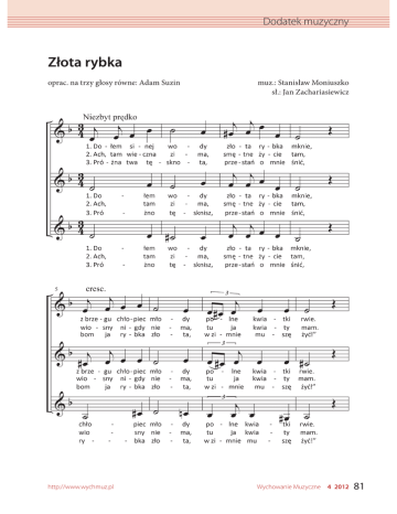 Dodatek muzyczny oprac. na trzy głosy równe: Adam Suzin muz.: Stanisław Moniuszko sł.: Jan Zachariasiewicz http://www.wychmuz.pl Wychowanie Muzyczne 4 2012 81 Dodatek muzyczny Dołem sinej wody złota rybka mknie, z brzegu chłopiec młody polne kwiatki rwie. ,,Wypłyń, rybko złota, wypłyń z zimnych fal, w sercu mym tęsknota, nadzieja, żal. Ach, tam wieczna zima, smętne życie tam, wiosny nigdy nie ma, tu ja kwiaty mam!” ,,Nęcisz mnie daremnie niczym kwiatek twój, zimna dusza we mnie, zimna krew jak zdrój. Próżna twa tęsknota! Przestań o mnie śnić, bom ja rybka złota, w zimnie muszę żyć!” Westchnął chłopiec młody, lecz nie płakał, nie, dołem zimnej wody w dal rybka mknie. 82 Wychowanie Muzyczne 4 2012 http://www.wychmuz.pl