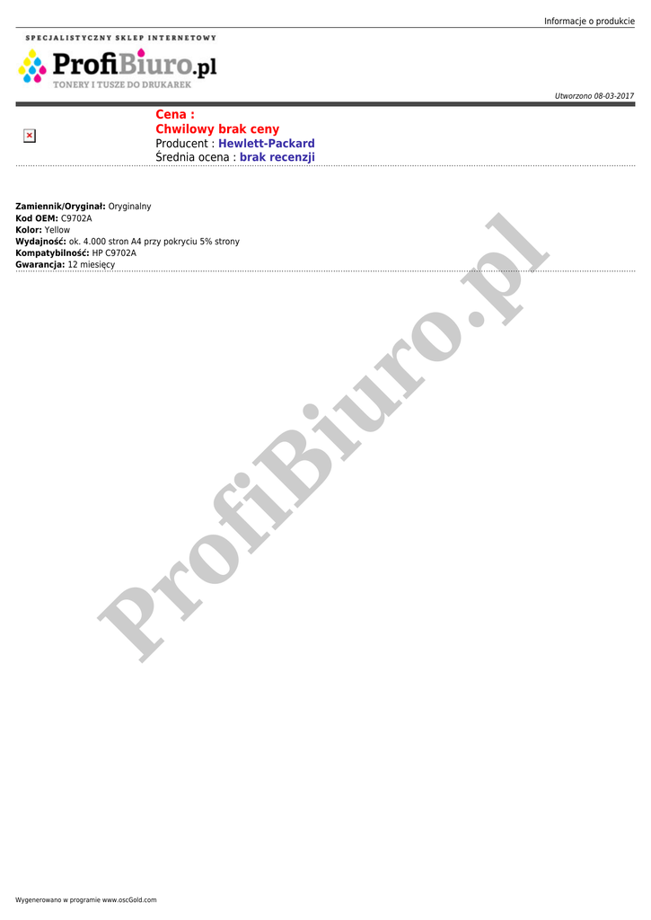 Informacje o produkcie Utworzono 08-03-2017 Cena : Chwilowy brak ceny Producent : Hewlett-Packard Średnia ocena : brak recenzji Pr of iB iu r o. pl Zamiennik/Oryginał: Oryginalny Kod OEM: C9702A Kolor: Yellow Wydajność: ok. 4.000 stron A4 przy pokryciu 5% strony Kompatybilność: HP C9702A Gwarancja: 12 miesięcy Wygenerowano w programie www.oscGold.com
