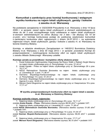 Warszawa, dnia 27.08.2012 r. Komunikat o zamknięciu prac komisji konkursowej i wstępnym wyniku konkursu na najem lokali użytkowych, garaży i boksów z zasobu m.st. Warszawy Na podstawie zarządzenia nr 3323/2009 Prezydenta m.st. Warszawy z dnia 14 lipca 2009 r. w sprawie: zasad najmu lokali użytkowych w domach wielolokalowych na okres do lat 3 oraz szczegółowego trybu oddawania w najem lokali użytkowych w domach wielolokalowych na okres dłuższy niż 3 lata i nie dłuższy niż 10 lat (z późn. zm.) komisja konkursowa podaje do publicznej wiadomości komunikat o zamknięciu konkursów ofert, ogłoszonych z dniem 24.07.2012 r. na wyłonienie najemców n/wym. lokali użytkowych, garaży i boksów z zasobu m. st. Warszawy na terenie Dzielnicy Bielany. Komisja, w składzie określonym Zarządzeniem nr 146/2012 Burmistrza Dzielnicy Bielany m.st. Warszawy z dnia 30 maja 2012 r. w sprawie: powołania Komisji do przeprowadzenia i rozstrzygnięcia konkursów ofert na najem lokali użytkowych z zasobu Miasta Stołecznego Warszawy ustaliła: Komisja uznała za prawidłowe i kompletne oferty złożone przez: 1. Kwiat Kobiecości Ogólnopolska Organizacja Na Rzecz Walki z Rakiem Szyjki Macicy na najem lokalu użytkowego przy ul. Perzyńskiego 14 o pow. 51,44 m2 2. Anetę Kazała - Press na najem lokalu użytkowego przy ul. Żeromskiego 29 o pow. 19,11 m2 3. NZOZ Rehmedicon Dominka Borowska na najem lokalu użytkowego przy ul. Lisowskiej 23 o pow. 71,38 m2 4. Damiana Słupskiego-Kartaczowskiego na najem lokalu użytkowego przy ul. Perzyńskiego 14 o pow. 51,44 m2 5. Damiana Słupskiego-Kartaczowskiego na najem lokalu użytkowego przy ul. Przy Agorze 6 o pow. 30,00 m2 6. Merson Karol Długozima na najem lokalu użytkowego przy ul. Kasprowicza 18 o pow. 17,71 m2 W wyniku przeprowadzonych konkursów ofert na najem lokali z zasobu m.st. Warszawy w Dzielnicy Bielany: Komisja wyłoniła n/wym. najemców: 1. Najemcą lokalu użytkowego przy ul. Żeromskiego 29 o pow. 19,11 m2 została Aneta Kazała – Press. Oferowana stawka czynszu 86,00 zł/m2 + podatek VAT. 2. Najemcą lokalu użytkowego przy ul. Lisowskiej 23 o pow. 71,38 m2 został NZOZ Rehmedicon Dominika Borowska. Oferowana stawka czynszu 31,60 zł/m2 + podatek VAT. 3. Najemcą lokalu użytkowego przy ul. Perzyńskiego 14 o pow. 51,44 m2 został Damian Słupski-Kartaczowski. Oferowana stawka czynszu 58,05 zł/m2 + podatek VAT. 4. Najemcą lokalu użytkowego przy ul. Kasprowicza 18 o pow. 17,71 m2 został Merson Karol Długozima. Oferowana stawka czynszu 36,10 zł/m2 + podatek VAT. 1 Konkurs ofert na najem: 1. lokal w budynku przy ul. Przy Agorze 6 o pow. 30,00 m2 został zamknięty bez wyłonienia najemcy z uwagi na fakt, iż oferent, który zostałby jego najemcą w pierwszej kolejności wybrał inny lokal, na który także złożył ofertę. Konkursy ofert na najem: 1. lokal w budynku przy al. Zjednoczenia 1 o pow. 101,00 m2 2. lokal w budynku przy ul. Jarzębskiego 8 o pow. 18,56 m2 3. lokal w pawilonie przy ul. Kasprowicza 16 o pow. 36,58 m2 4. lokal w pawilonie przy ul. Kasprowicza 16 o pow. 75,37 m2 5. lokal w pawilonie przy ul. Kasprowicza 16 o pow. 131,26 m2 6. lokal w pawilonie przy ul. Kasprowicza 18 o pow. 85,80 m2 7. lokal w budynku przy ul. Magiera 25 o pow. 11,58 m2 8. lokal w pawilonie przy ul. Wrzeciono 41 o pow. 35,18 m2 9. garaż nr 14 w zespole wolnostojącym przy ul. Antycznej o pow. 15,08 m2 10. garaż nr 1 w zespole wolnostojącym przy ul. Lisowskiej 21 o pow. 18,60 m2 11. garaż nr 6 w budynku przy ul. Magiera 15 o pow. 16,90 m2 12. garaż nr 5 w budynku przy ul. Marymonckiej 153 o pow. 13,40 m2 13. garaż nr 3 w zespole wolnostojącym przy ul. Schroegera 93/97 o pow. 16,52 m2 14. boksy o numerach 3, 4, 9 w budynku przy ul. Broniewskiego 54 o pow. 3,21 m2, 3,80 m2 15. boks nr 9 w budynku przy ul. Marymonckiej 35 o pow. 3,36 m2 16. boks w budynku przy ul. Nałkowskiej 15 o pow. 3,22 m2 17. boks nr 6 w budynku przy ul. Oczapowskiego 10 o pow. 3,50 m2 zostały zamknięte bez wyłonienia najemcy z powodu braku ofert. Na podstawie § 12 załącznika nr 1 do Zarządzenia nr 3323/2009 Prezydenta m. st. Warszawy z dnia 14 lipca 2009 r. w sprawie zasad najmu lokali użytkowych j.w. w terminie 3 dni roboczych od dnia wywieszenia niniejszego komunikatu uczestnik konkursu może wnieść do Burmistrza Dzielnicy Bielany m. st. Warszawy skargę na czynności związane z przeprowadzeniem konkursu. Burmistrz rozpatruje skargę w terminie 3 dni roboczych od dnia jej otrzymania. Po rozpatrzeniu skargi Burmistrz zawiadamia skarżącego i zarządza o niezwłocznym wywieszeniu na okres 3 dni roboczych na tablicy ogłoszeń dzielnicy informacji o sposobie rozstrzygnięcia skargi. Przewodnicząca komisji 2