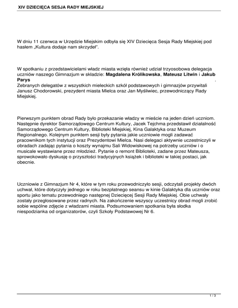 XIV DZIECIĘCA SESJA RADY MIEJSKIEJ W dniu 11 czerwca w Urzędzie Miejskim odbyła się XIV Dziecięca Sesja Rady Miejskiej pod hasłem „Kultura dodaje nam skrzydeł”. W spotkaniu z przedstawicielami władz miasta wzięła również udział trzyosobowa delegacja uczniów naszego Gimnazjum w składzie: Magdalena Królikowska, Mateusz Litwin i Jakub Parys . Zebranych delegatów z wszystkich mieleckich szkół podstawowych i gimnazjów przywitali Janusz Chodorowski, prezydent miasta Mielca oraz Jan Myśliwiec, przewodniczący Rady Miejskiej. Pierwszym punktem obrad Rady było przekazanie władzy w mieście na jeden dzień uczniom. Następnie dyrektor Samorządowego Centrum Kultury, Jacek Tejchma przedstawił działalność Samorządowego Centrum Kultury, Biblioteki Miejskiej, Kina Galaktyka oraz Muzeum Regionalnego. Kolejnym punktem sesji były pytania jakie uczniowie mogli zadawać pracownikom tych instytucji oraz Prezydentowi Mielca. Nasi delegaci aktywnie uczestniczyli w obradach zadając pytania o koszty wynajmu Sali Widowiskowej na potrzeby uczniów i o musicale wystawiane przez młodzież. Pytanie o remont Biblioteki, zadane przez Mateusza, sprowokowało dyskusję o przyszłości tradycyjnych książek i biblioteki w takiej postaci, jak obecnie. Uczniowie z Gimnazjum Nr 4, które w tym roku przewodniczyło sesji, odczytali projekty dwóch uchwał, które dotyczyły jednego w roku bezpłatnego seansu w kinie Galaktyka dla uczniów oraz sportu jako tematu przewodniego następnej Dziecięcej Sesji Rady Miejskiej. Obie uchwały zostały przegłosowane przez radnych. Na zakończenie wszyscy uczestnicy obrad mogli zrobić sobie wspólne zdjęcie z władzami miasta. Podsumowaniem spotkania była słodka niespodzianka od organizatorów, czyli Szkoły Podstawowej Nr 6. 1/3 XIV DZIECIĘCA SESJA RADY MIEJSKIEJ 2/3 XIV DZIECIĘCA SESJA RADY MIEJSKIEJ Powrót do strony głównej 3/3