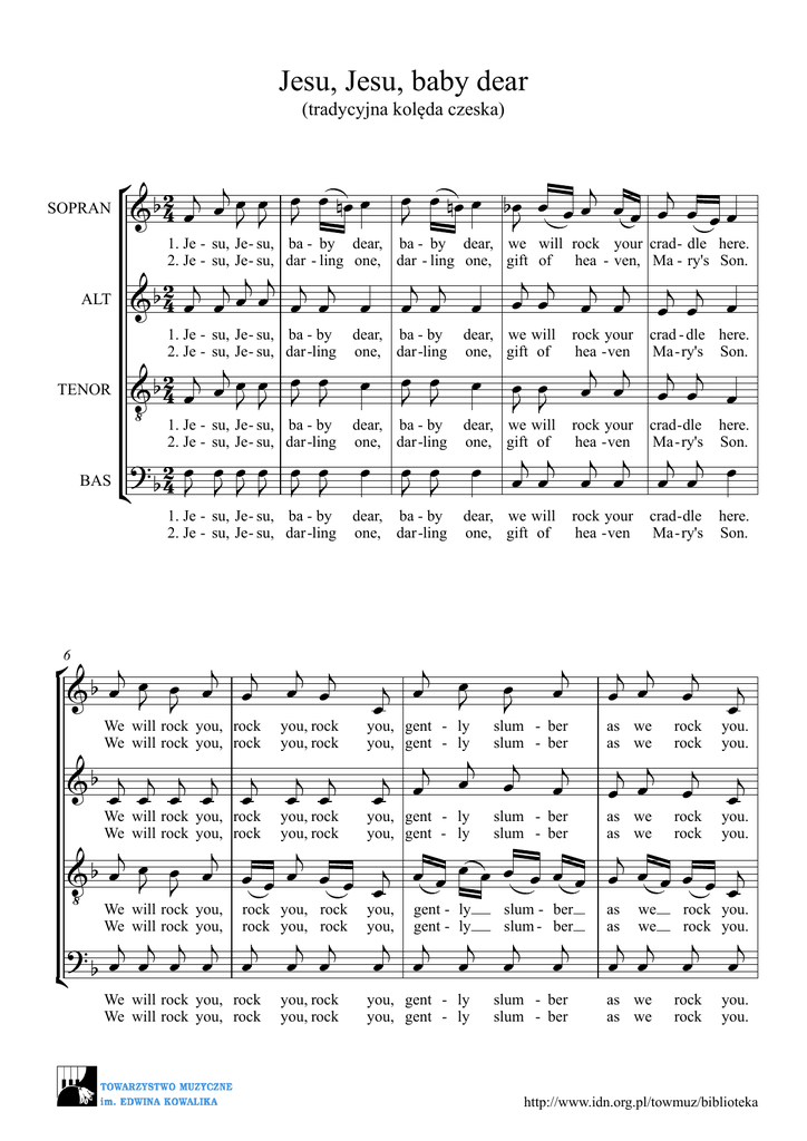 Jesu, Jesu, baby dear (tradycyjna kolęda czeska) SOPRAN ° 2 j jœ œ œ œ œ & b 4 œ œ J J J nœ œ œ nœ œ bœ œ œ œj œ œj œ J œ œœ J 1. Je - su, Je - su, ba - by dear, ba - by dear, we will rock your crad - dle here. 2. Je - su, Je - su, dar - ling one, dar - ling one, gift of hea - ven, Ma - ry's Son. ALT TENOR BAS 2 j j œj œj j j b & 4œ œ œ œ œ j j œ œ œ j j œ œ 2 j œj œ œ œ œ b & 4œ J J J J ‹ 1. Je - su, Je- su, ba - by œ œ J J œ œ J J j j œ œ j j œ œ œ 1. Je - su, Je - su, ba - by 2. Je - su, Je - su, dar -ling dear, ba - by one, dar -ling dear, we will one, gift of rock your hea - ven crad - dle here. Ma - ry's Son. 2. Je - su, Je - su, dar -ling dear, ba - by one, dar -ling dear, we will one, gift of rock your hea - ven crad - dle Ma - ry's here. Son. 1. Je - su, Je - su, ba - by 2. Je - su, Je - su, dar -ling dear, ba - by one, dar -ling dear, we will one, gift of rock your hea - ven crad - dle Ma - ry's here. Son. ? 2œ œ œ œ œ œ ¢ b4 J J J J J J ° j œ j j b œ & œ J J œ œ 6 We will rock you, rock We will rock you, rock &b j j j j j œ œ œ œ œ We will rock you, rock We will rock you, rock j j œ œ you, rock you, rock j j œ œ you, rock you, rock œ œ œ œ J J œ œ j j œ œ œ J j œj œ j œ you, gent - ly you, gent - ly you, gent - ly you, gent - ly j j œ œ œ J j j œ œ j j œ œ j œ slum - ber slum - ber j œ j œ slum - ber slum - ber j j œ œ œ j j œ œ œ j j œ œ as we as we j œj œ as we as we j œ rock rock j œ rock rock j œ you. you. j œ you. you. j œ j j j œ œ œ œ œ b œ œ œ œ j œ œ œ œ œ j & œ œ œ œ œ J J œ œ œ œ ‹ We will rock you, rock you, rock you, gent - ly slum - ber as we rock you. We will rock you, rock you, rock ? œj œj œj œj œj ¢ b We will rock you, rock We will rock you, rock j j œ œ you, rock you, rock you, gent - ly j j œ œ j œ you, gent - ly you, gent - ly slum - ber j œ j œ slum - ber slum - ber as we j j œ œ as we as we rock you. j œ j œ rock rock you. you. http://www.idn.org.pl/towmuz/biblioteka ° j œj œ œ b & œ J J 2 10 Je - su, Je - su, Je - su, Je - su, j j j j &b œ œ œ œ Je - su, Je - su, Je - su, Je - su, j œj œ œ b & œ J J ‹ Je - su, Je - su, œ œ nœ œ J bœ J j œ œ œ œ œ œj œ œ œ j j œ œ j œ j œ j œ j œ do do not not do not do not œ œ J J fear, fear, œ fear, fear, œ Je - su, Je - su, do not do not fear, fear, Je - su, Je - su, Je - su, Je - su, do not do not fear, fear, ? œ œ œ œ ¢ bJ J J J œ œ J J œ we we we we who who who who œ œ œ J we we who who we we who who j œ j œ love love j œ love love you you you you j œ œ œ love love j œ love love you you j œ you you will will j œ will will be be be be j œ œ œ will will j œ will will near. near. œ near. near. œ be be near. near. be be near. near. j œ œ http://www.idn.org.pl/towmuz/biblioteka