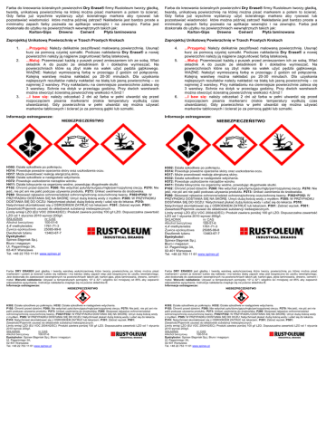 Farba do kreowania ścieralnych powierzchni Dry Erase® firmy Rustoleum tworzy gładką, twardą, unikatową powierzchnię na której można pisać markerem a potem to ścierać. Gdy farba już wyschnie wystarczy użyć ścieralnego markera aby rysować lub pozostawiać wiadomości które można później zetrzeć! Nakładanie jest bardzo proste a minimalny zapach farby pozwala na aplikacje wewnątrz i na zewnątrz. Farba jest doskonała do użytku na powierzchniach wewnętrznych takich jak: Karton-Gips Drewno Cement Płyta laminowana Farba do kreowania ścieralnych powierzchni Dry Erase® firmy Rustoleum tworzy gładką, twardą, unikatową powierzchnię na której można pisać markerem a potem to ścierać. Gdy farba już wyschnie wystarczy użyć ścieralnego markera aby rysować lub pozostawiać wiadomości które można później zetrzeć! Nakładanie jest bardzo proste a minimalny zapach farby pozwala na aplikacje wewnątrz i na zewnątrz. Farba jest doskonała do użytku na powierzchniach wewnętrznych takich jak: Karton-Gips Drewno Cement Płyta laminowana Zaprojektuj Unikatową Powierzchnię w Trzech Prostych Krokach Zaprojektuj Unikatową Powierzchnię w Trzech Prostych Krokach 1. 2. 3. ...Przygotuj: Należy delikatnie zeszlifować malowaną powierzchnię. Usunąć kurz za pomocą czystej szmatki. Podczas nakładania Dry Erase® a nowej powierzchni należy ją najpierw zagruntować farbą lateksową. ...Maluj: Przemieszać każdą z puszek przed zmieszaniem ich ze sobą. Wlać składnik A do puszki ze składnikiem B i dokładnie wymieszać. Na powierzchniach które są zbyt małe na wałek użyć pędzla gąbkowego. WAŻNE: Nałożyć wymieszaną farbę w przeciągu 2 godzin od połączenia. Kolejną warstwę można nakładać po 20-30 minutach. Dla uzyskania najlepszych rezultatów należy nakładać na białą lub jasną powierzchnię – co najmniej 2 warstwy. Przy nakładaniu na ciemniejsze powierzchnie zaleca się 3 warstwy. Schnie na dotyk w przeciągu godziny. Przy dwóch warstwach można stworzyć ścieralną powierzchnię wielkości 4,5m2 ! ...I baw się: należy odczekać 2 dni aż farba w pełni utwardzi się przed rozpoczęciem pisania markerami (niskie temperatury wydłużą czas utwardzania). Gdy powierzchnia w pełni utwardzi się można używać markerów tablicowych i ścierać je za pomocą gąbki lub szmatki. Informacje ostrzegawcze: 4. 5. 6. ...Przygotuj: Należy delikatnie zeszlifować malowaną powierzchnię. Usunąć kurz za pomocą czystej szmatki. Podczas nakładania Dry Erase® a nowej powierzchni należy ją najpierw zagruntować farbą lateksową. ...Maluj: Przemieszać każdą z puszek przed zmieszaniem ich ze sobą. Wlać składnik A do puszki ze składnikiem B i dokładnie wymieszać. Na powierzchniach które są zbyt małe na wałek użyć pędzla gąbkowego. WAŻNE: Nałożyć wymieszaną farbę w przeciągu 2 godzin od połączenia. Kolejną warstwę można nakładać po 20-30 minutach. Dla uzyskania najlepszych rezultatów należy nakładać na białą lub jasną powierzchnię – co najmniej 2 warstwy. Przy nakładaniu na ciemniejsze powierzchnie zaleca się 3 warstwy. Schnie na dotyk w przeciągu godziny. Przy dwóch warstwach można stworzyć ścieralną powierzchnię wielkości 4,5m2 ! ...I baw się: należy odczekać 2 dni aż farba w pełni utwardzi się przed rozpoczęciem pisania markerami (niskie temperatury wydłużą czas utwardzania). Gdy powierzchnia w pełni utwardzi się można używać markerów tablicowych i ścierać je za pomocą gąbki lub szmatki. Informacje ostrzegawcze: NIEBEZPIECZEŃSTWO NIEBEZPIECZEŃSTWO H302: Działa szkodliwie po połknięciu. H314: Powoduje poważne oparzenia skóry oraz uszkodzenia oczu. H317: Może powodować reakcję alergiczną skóry. H332: Działa szkodliwie w następstwie wdychania. H372: Powoduje uszkodzenie narządów wzroku H411: Działa toksycznie na organizmy wodne, powodując długotrwałe skutki. P102: Chronić przed dziećmi. P260: Nie wdychać pyłu/dymu/gazu/mgły/par/rozpylonej cieczy. P270: Nie jeść, nie pić ani nie palić podczas używania produktu. P273: Unikać uwolnienia do środowiska. P280: Stosować rękawice ochronne/odzież ochronną/ochronę oczu/ochronę twarzy. P302+P352: W PRZYPADKU DOSTANIA SIĘ NA SKÓRĘ: Umyć dużą ilością wody z mydłem. P305: W PRZYPADKU DOSTANIA SIĘ DO OCZU: Natychmiast płukać dużą ilością wody i udać się do lekarza. P310: Natychmiast skontaktować się z OŚRODKIEM ZATRUĆ lub lekarzem. P391: Zebrać wyciek. P501: Zawartość/Pojemnik usuwać do składowisk substancji niebezpiecznych. Limity emisji LZO (EU VOC 2004/42/EC): Produkt zawiera poniżej 100 g/l LZO. Dopuszczalna zawartość LZO od 1 stycznia 2010 wynosi 200g/l. SKŁADNIK nr CAS Alkohol benzylowy 100-51-6 4,4'-methylenebis 1761-71-3 Żywica epoksydowa 25085-99-8 Dwutlenek tytanu 13463-67-7 Dystrybutor: Spinex-Stępniak Sp.j. Biuro i magazyn: Ul. Paganiniego 3A, 02-401 Warszawa Tel. +48 22 753 11 61 www.spinex.pl H302: Działa szkodliwie po połknięciu. H314: Powoduje poważne oparzenia skóry oraz uszkodzenia oczu. H317: Może powodować reakcję alergiczną skóry. H332: Działa szkodliwie w następstwie wdychania. H372: Powoduje uszkodzenie narządów wzroku H411: Działa toksycznie na organizmy wodne, powodując długotrwałe skutki. P102: Chronić przed dziećmi. P260: Nie wdychać pyłu/dymu/gazu/mgły/par/rozpylonej cieczy. P270: Nie jeść, nie pić ani nie palić podczas używania produktu. P273: Unikać uwolnienia do środowiska. P280: Stosować rękawice ochronne/odzież ochronną/ochronę oczu/ochronę twarzy. P302+P352: W PRZYPADKU DOSTANIA SIĘ NA SKÓRĘ: Umyć dużą ilością wody z mydłem. P305: W PRZYPADKU DOSTANIA SIĘ DO OCZU: Natychmiast płukać dużą ilością wody i udać się do lekarza. P310: Natychmiast skontaktować się z OŚRODKIEM ZATRUĆ lub lekarzem. P391: Zebrać wyciek. P501: Zawartość/Pojemnik usuwać do składowisk substancj