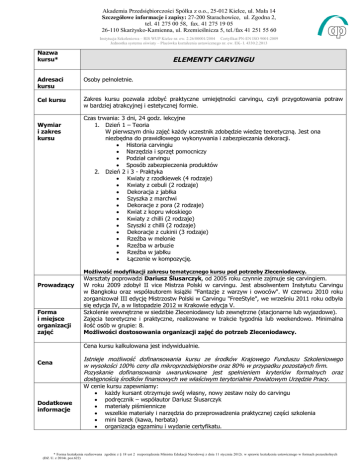 Akademia Przedsiębiorczości Spółka z o.o., 25-012 Kielce, ul. Mała 14 Szczegółowe informacje i zapisy: 27-200 Starachowice, ul. Zgodna 2, tel. 41 275 00 58, fax. 41 275 19 05 26-110 Skarżysko-Kamienna, ul. Rzemieślnicza 5, tel./fax 41 251 55 60 Instytucja Szkoleniowa – RIS WUP Kielce nr. ew. 2.26/00001/2004 Certyfikat PN-EN ISO 9001:2009 Jednostka systemu oświaty – Placówka kształcenia ustawicznego nr. ew. EK- I. 4330.2.2013 Nazwa kursu* ELEMENTY CARVINGU Adresaci kursu Osoby pełnoletnie. Cel kursu Zakres kursu pozwala zdobyć praktyczne umiejętności carvingu, czyli przygotowania potraw w bardziej atrakcyjnej i estetycznej formie. Wymiar i zakres kursu Czas trwania: 3 dni, 24 godz. lekcyjne 1. Dzień 1 – Teoria W pierwszym dniu zajęć każdy uczestnik zdobędzie wiedzę teoretyczną. Jest ona niezbędna do prawidłowego wykonywania i zabezpieczania dekoracji. Historia carvingiu Narzędzia i sprzęt pomocniczy Podział carvingu Sposób zabezpieczenia produktów 2. Dzień 2 i 3 - Praktyka Kwiaty z rzodkiewek (4 rodzaje) Kwiaty z cebuli (2 rodzaje) Dekoracja z jabłka Szyszka z marchwi Dekoracje z pora (2 rodzaje) Kwiat z kopru włoskiego Kwiaty z chilli (2 rodzaje) Szyszki z chilli (2 rodzaje) Dekoracje z cukinii (3 rodzaje) Rzeźba w melonie Rzeźba w arbuzie Rzeźba w jabłku Łączenie w kompozycję. Możliwość modyfikacji zakresu tematycznego kursu pod potrzeby Zleceniodawcy. Prowadzący Forma i miejsce organizacji zajęć Warsztaty poprowadzi Dariusz Ślusarczyk, od 2005 roku czynnie zajmuje się carvingiem. W roku 2009 zdobył II vice Mistrza Polski w carvingu. Jest absolwentem Instytutu Carvingu w Bangkoku oraz współautorem książki "Fantazje z warzyw i owoców". W czerwcu 2010 roku zorganizował III edycję Mistrzostw Polski w Carvingu "FreeStyle", we wrześniu 2011 roku odbyła się edycja IV, a w listopadzie 2012 w Krakowie edycja V. Szkolenie wewnętrzne w siedzibie Zleceniodawcy lub zewnętrzne (stacjonarne lub wyjazdowe). Zajęcia teoretyczne i praktyczne, realizowane w trakcie tygodnia lub weekendowo. Minimalna ilość osób w grupie: 8. Możliwości dostosowania organizacji zajęć do potrzeb Zleceniodawcy. Cena kursu kalkulowana jest indywidualnie. Cena Dodatkowe informacje Istnieje możliwość dofinansowania kursu ze środków Krajowego Funduszu Szkoleniowego w wysokości 100% ceny dla mikroprzedsiębiorstw oraz 80% w przypadku pozostałych firm. Pozyskanie dofinansowania uwarunkowane jest spełnieniem kryteriów formalnych oraz dostępnością środków finansowych we właściwym terytorialnie Powiatowym Urzędzie Pracy. W cenie kursu zapewniamy: każdy kursant otrzymuje swój własny, nowy zestaw noży do carvingu podręcznik – współautor Dariusz Ślusarczyk materiały piśmiennicze wszelkie materiały i narzędzia do przeprowadzenia praktycznej części szkolenia mini barek (kawa, herbata) organizacja egzaminu i wydanie certyfikatu. * Forma kształcenia realizowana zgodnie z § 18 ust 2 rozporządzenia Ministra Edukacji Narodowej z dnia 11 stycznia 2012r. w sprawie kształcenia ustawicznego w formach pozaszkolnych (DZ. U. z 2014r. poz.622)