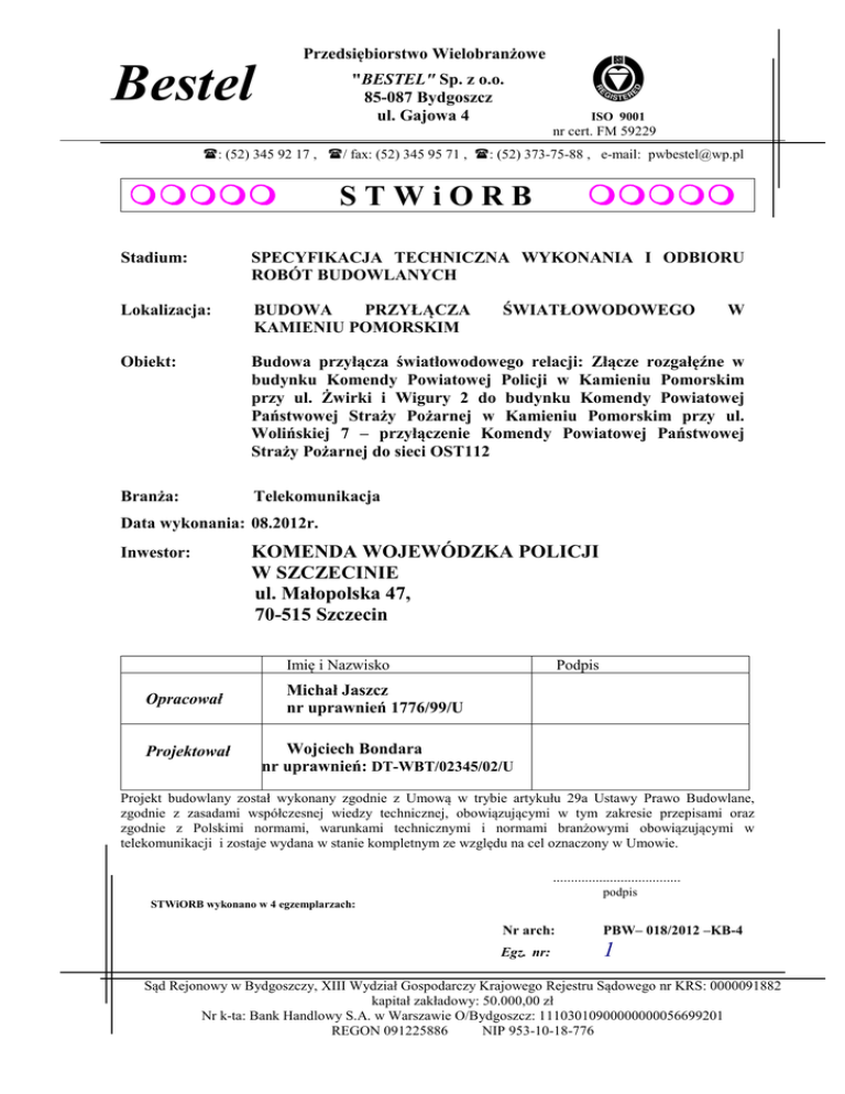 Przedsiębiorstwo Wielobranżowe Bestel "BESTEL" Sp. z o.o. 85-087 Bydgoszcz ul. Gajowa 4 ISO 9001 nr cert. FM 59229 : (52) 345 92 17 , / fax: (52) 345 95 71 , : (52) 373-75-88 , e-mail: [email protected] STWiORB Stadium: SPECYFIKACJA TECHNICZNA WYKONANIA I ODBIORU ROBÓT BUDOWLANYCH Lokalizacja: BUDOWA PRZYŁĄCZA KAMIENIU POMORSKIM Obiekt: Budowa przyłącza światłowodowego relacji: Złącze rozgałęźne w budynku Komendy Powiatowej Policji w Kamieniu Pomorskim przy ul. Żwirki i Wigury 2 do budynku Komendy Powiatowej Państwowej Straży Pożarnej w Kamieniu Pomorskim przy ul. Wolińskiej 7 – przyłączenie Komendy Powiatowej Państwowej Straży Pożarnej do sieci OST112 Branża: Telekomunikacja ŚWIATŁOWODOWEGO W Data wykonania: 08.2012r. Inwestor: KOMENDA WOJEWÓDZKA POLICJI W SZCZECINIE ul. Małopolska 47, 70-515 Szczecin Imię i Nazwisko Opracował Projektował Podpis Michał Jaszcz nr uprawnień 1776/99/U Wojciech Bondara nr uprawnień: DT-WBT/02345/02/U Projekt budowlany został wykonany zgodnie z Umową w trybie artykułu 29a Ustawy Prawo Budowlane, zgodnie z zasadami współczesnej wiedzy technicznej, obowiązującymi w tym zakresie przepisami oraz zgodnie z Polskimi normami, warunkami technicznymi i normami branżowymi obowiązującymi w telekomunikacji i zostaje wydana w stanie kompletnym ze względu na cel oznaczony w Umowie. .................................... podpis STWiORB wykonano w 4 egzemplarzach: Nr arch: PBW– 018/2012 –KB-4 Egz. nr: 1 Sąd Rejonowy w Bydgoszczy, XIII Wydział Gospodarczy Krajowego Rejestru Sądowego nr KRS: 0000091882 kapitał zakładowy: 50.000,00 zł Nr k-ta: Bank Handlowy S.A. w Warszawie O/Bydgoszcz: 11103010900000000056699201 REGON 091225886 NIP 953-10-18-776 Przedsiębiorstwo Wielobranżowe Bestel "BESTEL" Sp. z o.o. 85-087 Bydgoszcz ul. Gajowa 4 ISO 9001 nr cert. FM 59229 : (52) 345 92 17 , / fax: (52) 345 95 71 , : (52) 373-75-88 , e-mail: [email protected] SPIS TREŚCI A. BUDOWA URZĄDZEŃ TELEKOMUNIKACYJNYCH ......................................................................3 A.1 BUDOWA RUROCIĄGU TELEKOMUNIKACYJNEGO Z RUR Z TWORZYW SZTUCZNYCH ...... 3 A.2 BUDOWA LINII OPTOTELEKOMUNIKACYJNEJ ……………………………................................. 23 Sąd Rejonowy w Bydgoszczy, XIII Wydział Gospodarczy Krajowego Rejestru Sądowego nr KRS: 0000091882 kapitał zakładowy: 50.000,00 zł Nr k-ta: Bank Handlowy S.A. w Warszawie O/Bydgoszcz: 11103010900000000056699201 REGON 091225886 NIP 953-10-18-776 Przedsiębiorstwo Wielobranżowe Bestel "BESTEL" Sp. z o.o. 85-087 Bydgoszcz ul. Gajowa 4 ISO 9001 nr cert. FM 59229 : (52) 345 92 17 , / fax: (52) 345 95 71 , : (52) 373-75-88 , e-mail: [email protected] A. BUDOWA URZĄDZEŃ TELEKOMUNIKACYJNYCH A.1 BUDOWA SZTUCZNYCH RUROCIĄGU TELEKOMUNIKACYJNEGO Z RUR Z TWORZYW 1. WSTĘP 1.1. Przedmiot STWiORB Przedmiotem niniejszej Specyfikacji Technicznej Wykonania i Odbioru Robót Budowlanych (STWiORB) są wymagania dotyczące wykonania i odbioru robót związanych z budową rurociągu telekomunikacyjnego objętych niniejszym kontraktem. 1.2. Zakres stosowania STWiORB Specyfikacja Techniczna Wykonania i Odbioru Robót Budowlanych (STWiORB) stosowana jest jako dokument przetargowy i kontraktowy przy zlecaniu i realizacji robót wymienionych w pkt. 1.1. 1.3. Zakres robót objętych STWiORB Roboty, których dotyczy STWiORB obejmują wszystkie czynności umożliwiające i mające na celu wykonanie rurociągu telekomunikacyjnego. W zakres tych robót wchodzą: - wykonanie wykopu pod studnie kablowe, - wykonanie i zasypanie wykopu pod rury, - budowa studni kablowych, - ułożenie rur, - ułożenie rur stalowych pomiędzy studniami, 1.4. Określenia podstawowe Określenia podane w niniejszej STWiORB są zgodne z obowiązującymi normami oraz z określeniami podanymi w STWiORB DM.00.00.00. „Wymagania ogólne”. 1.4.1. Kanalizacja kablowa - zespół ciągów podziemnych z wbudowanymi studniami przeznaczony do prowadzenia kabli telekomunikacyjnych. 1.4.2. Kanalizacja pierwotna - kanalizacja kablowa, do której wciąga się kable telekomunikacyjne lub rury kanalizacji wtórnej. 1.4.3. Kanalizacja wtórna - zespół rur polietylenowych lub innych, o nie gorszych właściwościach zaciąganych do otworów kanalizacji pierwotnej, stanowiących dodatkowe zabezpieczenie kabli optotelekomunikacyjnych i innych. 1.4.4. Kanalizacja magistralna - kanalizacja kablowa wielootworowa przeznaczona dla kabli linii magistralnych, międzycentralowych, międzymiastowych okręgowych i pośrednich. 1.4.5. Kanalizacja rozdzielcza - kanalizacja kablowa jedno- lub dwuotworowa przeznaczona dla kabli linii rozdzielczych. 1.4.6. Kanalizacja specjalna - kanalizacja pierwotna z rur stalowych, wypełnionych rurami z tworzyw sztucznych, przeznaczona dla kabli na terenie stacji elektroenergetycznych i w ich Sąd Rejonowy w Bydgoszczy, XIII Wydział Gospodarczy Krajowego Rejestru Sądowego nr KRS: 0000091882 kapitał zakładowy: 50.000,00 zł Nr k-ta: Bank Handlowy S.A. w Warszawie O/Bydgoszcz: 11103010900000000056699201 REGON 091225886 NIP 953-10-18-776 Przedsiębiorstwo Wielobranżowe Bestel "BESTEL" Sp. z o.o. 85-087 Bydgoszcz ul. Gajowa 4 ISO 9001 nr cert. FM 59229 : (52) 345 92 17 , / fax: (52) 345 95 71 , : (52) 373-75-88 , e-mail: [email protected] bezpośrednim sąsiedztwie, elektroenergetycznych na kable. ograniczająca niebezpieczne oddziaływanie urządzeń 1.4.7. Blok kanalizacji kablowej - blok betonowy z jednym lub wieloma otworami stosowany do zestawiania ciągów kanalizacji kablowej. 1.4.8. Ciąg kanalizacji - bloki kanalizacji kablowej lub rury ułożone w wykopie jeden za drugim i połączone pojedynczo lub w zestawach pozwalających uzyskać potrzebną liczbę otworów kanalizacji. 1.4.9. Rurociąg kablowy - ciąg rur polietylenowych lub innych o nie gorszych właściwościach oraz zasobników złączowych układanych bezpośrednio w ziemi i stanowiących osłonę ochronną dla kabli światłowodowych. 1.4.