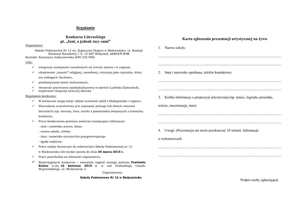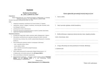 Regulamin Konkursu Literackiego pt. „Inni, a jednak tacy sami” Organizator: Szkoła Podstawowa Nr 12 im. Zygmunta Glogera w Białymstoku, ul. Komisji Edukacji Narodowej 1 A, 15-687 Białystok, tel.85-679 38 80 Kontakt: Katarzyna Andryszewska (600 232 980) Cele: Karta zgłoszenia prezentacji artystycznej na żywo 1. Nazwa szkoły. ....................................................................................................................................... ....................................................................................................................................... integracja mniejszości narodowych na terenie miasta i w regionie, ukazywanie „inności” religijnej, narodowej, etnicznej jako czynnika, który 2. Imię i nazwisko opiekuna, telefon kontaktowy. ma wzbogacić duchowo, przełamywanie barier kulturowych, tworzenie przestrzeni międzykulturowej w mieście Ludwika Zamenhofa, wspieranie ekspresji twórczej dziecka. Regulamin konkursu: ....................................................................................................................................... ....................................................................................................................................... 3. Krótka informacja o propozycji artystycznej (np. taniec, legenda, piosenka, W konkursie mogą wziąć udział uczniowie szkół z Białegostoku i regionu. Warunkiem uczestnictwa jest napisanie jednego lub dwóch utworów literackich (np. wiersza, listu, kartki z pamiętnika) związanych z tematyką konkursu. Praca konkursowa powinna zawierać następujące informacje: wiersz, inscenizacja, inne). ....................................................................................................................................... ....................................................................................................................................... - imię i nazwisko autora, klasa 4. - nazwa szkoły, telefon - imię i nazwisko nauczyciela przygotowującego - zgodę rodziców. Prace należy dostarczyć do sekretariatu Szkoły Podstawowej nr 12 Uwagi. (Prezentacja nie może przekraczać 10 minut). Informacje o wykonawcach. ....................................................................................................................................... w Białymstoku lub wysłać pocztą do dnia 30 marca 2015 r. Prace przechodzą na własność organizatora. ....................................................................................................................................... Rozstrzygnięcie konkursu – wręczenie nagród nastąpi podczas Festiwalu Kultur w dn. 16 kwietnia 2015 r. w sali Podlaskiego Urzędu Wojewódzkiego, ul. Mickiewicza 3. Organizatorzy: Szkoła Podstawowa Nr 12 w Białymstoku Podpis osoby zgłaszającej Regulamin Karta zgłoszenia stoiska kulturowego Konkursu Twórczości Plastycznej Dzieci pt. „Inni, a jednak tacy sami” • Celem konkursu jest: przełamywanie barier kulturowych, językowych, integracja mniejszości narodowych mieszkających na terenie miasta i regionu, wzbudzanie zainteresowania dzieci historią i kulturą wielu narodowości zamieszkujących w Białymstoku i regionie, Tworzenie przestrzeni międzykulturowej w mieście Ludwika Zamenhofa, pobudzanie aktywności twórczej, prezentacja ekspresji i wypowiedzi plastycznej. • Warunki uczestnictwa: w konkursie biorą udział uczniowie szkół podstawowych (klasy 0-III), każdy uczeń wykonuje jedną pracę w dowolnie wybranej technice plastycznej, każda praca powinna być oprawiona, czytelnie podpisana i przygotowana do ekspozycji do pracy powinna być dołączona zgoda rodziców. -imię i nazwisko, -wiek autora, -adres szkoły lub placówki, telefon, -imię i nazwisko nauczyciela, pod którego kierunkiem praca została wykonana. Termin nadsyłania prac upływa 30 marca 2015 r. 1. Nazwa szkoły. ....................................................................................................................................... ....................................................................................................................................... 2. Imię i nazwisko opiekuna, telefon kontaktowy. ....................................................................................................................................... ....................................................................................................................................... 3. Krótka informacja o propozycji artystycznej (np. pamiątki, stroje regionalne, potrawy, inne). ....................................................................................................................................... ....................................................................................................................................... Prace należy wysłać na adres: Szkoła Podstawowa nr 12 im. Zygmunta Glogera ul. Komisji Edukacji Narodowej 1A 15-687 Białystok Tel.85-6793880 4. Uwagi. ....................................................................................................................................... ....................................................................................................................................... • Rozstrzygnięcie konkursu – wręczenie nagród nastąpi podczas Festiwalu Kultur w dn. 16 kwietnia 2015 r. w sali Podlaskiego Urzędu Wojewódzkiego, ul Mickiewicza 3. Organizatorzy: Szkoła Podstawowa Nr 12 w Białymstoku Podpis osoby zgłaszającej