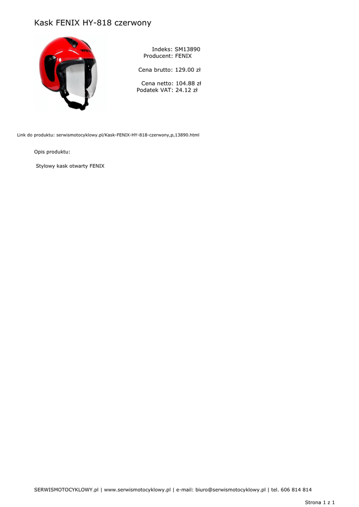 Kask FENIX HY-818 czerwony Indeks: SM13890 Producent: FENIX Cena brutto: 129.00 zł Cena netto: 104.88 zł Podatek VAT: 24.12 zł Link do produktu: serwismotocyklowy.pl/Kask-FENIX-HY-818-czerwony,p,13890.html Opis produktu: Stylowy kask otwarty FENIX SERWISMOTOCYKLOWY.pl | www.serwismotocyklowy.pl | e-mail: [email protected] | tel. 606 814 814 Strona 1 z 1
