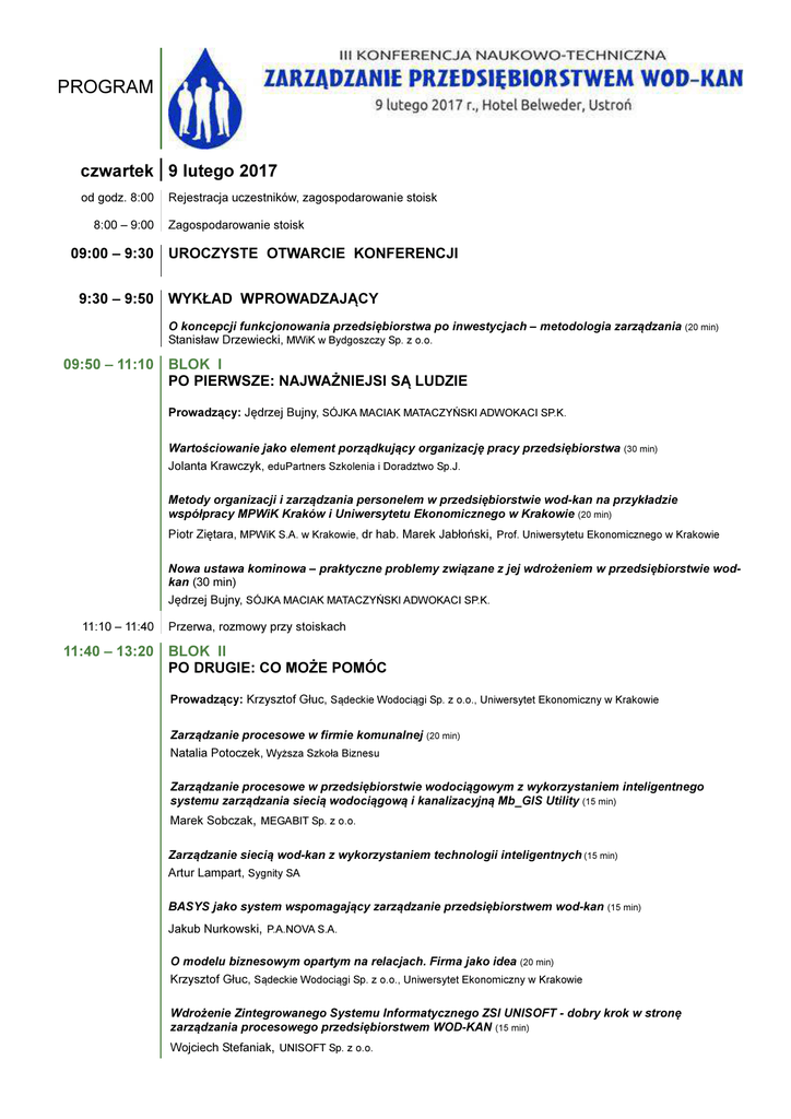 PROGRAM czwartek 9 lutego 2017 od godz. 8:00 8:00 – 9:00 Rejestracja uczestników, zagospodarowanie stoisk Zagospodarowanie stoisk 09:00 – 9:30 UROCZYSTE OTWARCIE KONFERENCJI 9:30 – 9:50 WYKŁAD WPROWADZAJĄCY O koncepcji funkcjonowania przedsiębiorstwa po inwestycjach – metodologia zarządzania (20 min) Stanisław Drzewiecki, MWiK w Bydgoszczy Sp. z o.o. 09:50 – 11:10 BLOK I PO PIERWSZE: NAJWAŻNIEJSI SĄ LUDZIE Prowadzący: Jędrzej Bujny, SÓJKA MACIAK MATACZYŃSKI ADWOKACI SP.K. Wartościowanie jako element porządkujący organizację pracy przedsiębiorstwa (30 min) Jolanta Krawczyk, eduPartners Szkolenia i Doradztwo Sp.J. Metody organizacji i zarządzania personelem w przedsiębiorstwie wod-kan na przykładzie współpracy MPWiK Kraków i Uniwersytetu Ekonomicznego w Krakowie (20 min) Piotr Ziętara, MPWiK S.A. w Krakowie, dr hab. Marek Jabłoński, Prof. Uniwersytetu Ekonomicznego w Krakowie Nowa ustawa kominowa – praktyczne problemy związane z jej wdrożeniem w przedsiębiorstwie wodkan (30 min) Jędrzej Bujny, SÓJKA MACIAK MATACZYŃSKI ADWOKACI SP.K. 11:10 – 11:40 Przerwa, rozmowy przy stoiskach 11:40 – 13:20 BLOK II PO DRUGIE: CO MOŻE POMÓC Prowadzący: Krzysztof Głuc, Sądeckie Wodociągi Sp. z o.o., Uniwersytet Ekonomiczny w Krakowie Zarządzanie procesowe w firmie komunalnej (20 min) Natalia Potoczek, Wyższa Szkoła Biznesu Zarządzanie procesowe w przedsiębiorstwie wodociągowym z wykorzystaniem inteligentnego systemu zarządzania siecią wodociągową i kanalizacyjną Mb_GIS Utility (15 min) Marek Sobczak, MEGABIT Sp. z o.o. Zarządzanie siecią wod-kan z wykorzystaniem technologii inteligentnych (15 min) Artur Lampart, Sygnity SA BASYS jako system wspomagający zarządzanie przedsiębiorstwem wod-kan (15 min) Jakub Nurkowski, P.A.NOVA S.A. O modelu biznesowym opartym na relacjach. Firma jako idea (20 min) Krzysztof Głuc, Sądeckie Wodociągi Sp. z o.o., Uniwersytet Ekonomiczny w Krakowie Wdrożenie Zintegrowanego Systemu Informatycznego ZSI UNISOFT - dobry krok w stronę zarządzania procesowego przedsiębiorstwem WOD-KAN (15 min) Wojciech Stefaniak, UNISOFT Sp. z o.o. 13:20 – 14:20 Obiad 14:20 – 16:10 BLOK III PO TRZECIE:JAK EFEKTYWNIE ZARZĄDZAĆ MAJĄTKIEM Prowadzący: Karolina Skalska-Józefowicz, EY Asset Management jako narzędzie efektywnego zarządzania majątkiem w przedsiębiorstwie wodociągowym (20 min) Marek Borkowski, Aquanet SA Mapa jako podstawowy system zarządzania przedsiębiorstwem wod-kan - GEOSECMA forArcGIS (15 min) Marcin Paź, Esri Polska Sp. z o.o. Maksymalizacja korzyści z wdrożenia systemu zarządzania majątkiem - najlepsze światowe praktyki i podejście EY (20 min) Karolina Skalska-Józefowicz, EY Optymalizacja kosztów i efektywność operacyjna w zarządzaniu majątkiem z wykorzystaniem systemu SAP – atrybuty nowoczesnego rozwiązania S&T dla przedsiębiorstw wodnokanalizacyjnych (20 min) Andrzej Chabrzyk, S&T Services Polska Sp. z o.o. Zarządzanie ryzykiem prawnym w sektorze wod-kan (15 min) Bartłomiej Jankowski, WKB Wierciński, Kwieciński, Baehr Sp.k. Jakie są jasne i ciemne strony pozyskiwania dofinansowania (20 min) Janusz Adamek, Sądeckie Wodociągi Sp. z o.o. 16:10 – 16:40 Przerwa, rozmowy przy stoiskach 16:40 – 17:40 WYKŁAD SPECJALNY Biznes na tak – Jerzy Engel o zarządzaniu i kształtowaniu kultury sukcesu (60 min) Jerzy Engel, były selekcjoner reprezentacji Polski w piłce nożnej - Tożsamość firmy – współtworzenie organizacyjnej kultury sukcesu - Wpływ polityki motywacyjnej na morale zespołu - Personal Branding, czyli wygrywa zawsze zespół, przegrywa zazwyczaj manager 17:40 – 19:00 Demontaż stoisk 19:00 – 24:00 KOLACJA – KULIG 18:55 Zbiórka przed hotelem 19:00 Wyjazd z Hotelu Belweder 19:30-20:15 Poczęstunek Karczma Kubalonka Adres: Kubalonka 1277, 43-470 Istebna 20.15-21.30 Kulig 21:30-23:30 Kolacja przy akompaniamencie górskiej kapeli w Karczmie Kubalonka 23:30 Wyjazd autokaru do Hotelu Belweder *Organizator zastrzega sobie prawo do zmian w programie.