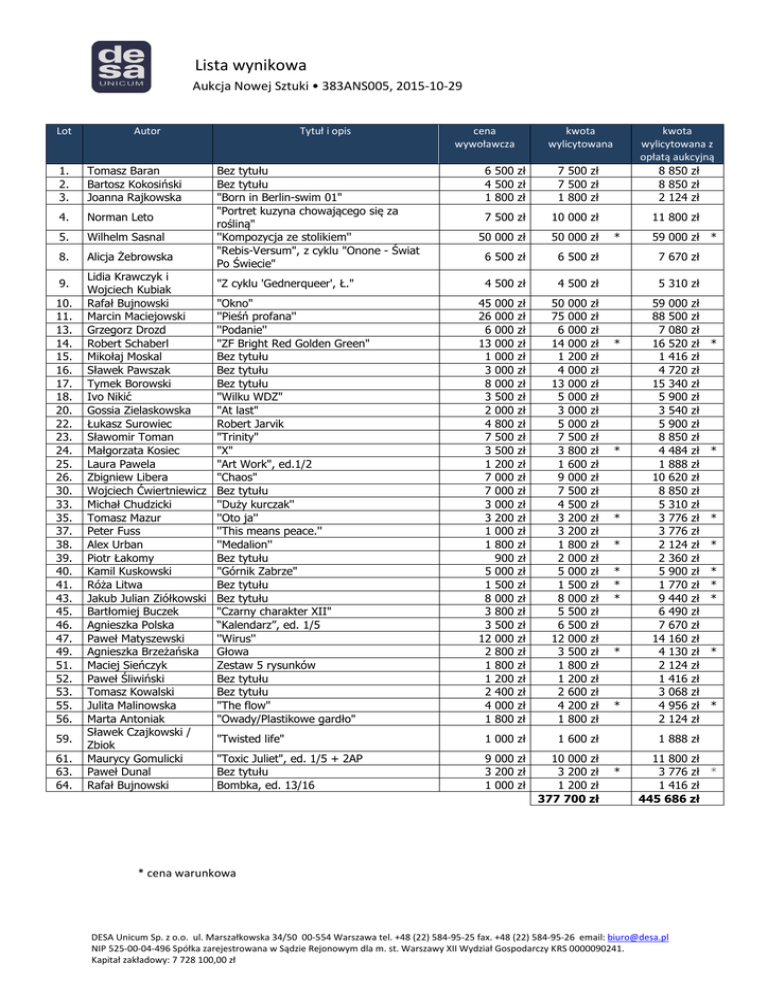 Lista wynikowa Aukcja Nowej Sztuki • 383ANS005, 2015-10-29 Lot Autor 1. 2. 3. Tomasz Baran Bartosz Kokosiński Joanna Rajkowska 4. Norman Leto 5. Wilhelm Sasnal 8. Alicja Żebrowska 9. 10. 11. 13. 14. 15. 16. 17. 18. 20. 22. 23. 24. 25. 26. 30. 33. 35. 37. 38. 39. 40. 41. 43. 45. 46. 47. 49. 51. 52. 53. 55. 56. 59. 61. 63. 64. Lidia Krawczyk i Wojciech Kubiak Rafał Bujnowski Marcin Maciejowski Grzegorz Drozd Robert Schaberl Mikołaj Moskal Sławek Pawszak Tymek Borowski Ivo Nikić Gossia Zielaskowska Łukasz Surowiec Sławomir Toman Małgorzata Kosiec Laura Pawela Zbigniew Libera Wojciech Ćwiertniewicz Michał Chudzicki Tomasz Mazur Peter Fuss Alex Urban Piotr Łakomy Kamil Kuskowski Róża Litwa Jakub Julian Ziółkowski Bartłomiej Buczek Agnieszka Polska Paweł Matyszewski Agnieszka Brzeżańska Maciej Sieńczyk Paweł Śliwiński Tomasz Kowalski Julita Malinowska Marta Antoniak Sławek Czajkowski / Zbiok Maurycy Gomulicki Paweł Dunal Rafał Bujnowski Tytuł i opis Bez tytułu Bez tytułu "Born in Berlin-swim 01" "Portret kuzyna chowającego się za rośliną" ''Kompozycja ze stolikiem'' "Rebis-Versum", z cyklu "Onone - Świat Po Świecie" "Z cyklu 'Gednerqueer', Ł." "Okno" ''Pieśń profana'' ''Podanie'' "ZF Bright Red Golden Green" Bez tytułu Bez tytułu Bez tytułu "Wilku WDZ" "At last" Robert Jarvik "Trinity" "X" "Art Work", ed.1/2 "Chaos" Bez tytułu ''Duży kurczak'' ''Oto ja'' ''This means peace.'' ''Medalion'' Bez tytułu "Górnik Zabrze" Bez tytułu Bez tytułu "Czarny charakter XII" “Kalendarz”, ed. 1/5 ''Wirus'' Głowa Zestaw 5 rysunków Bez tytułu Bez tytułu "The flow" "Owady/Plastikowe gardło" cena wywoławcza 6 500 zł 4 500 zł 1 800 zł 7 500 zł 7 500 zł 1 800 zł kwota wylicytowana z opłatą aukcyjną 8 850 zł 8 850 zł 2 124 zł 7 500 zł 10 000 zł 11 800 zł 50 000 zł 50 000 zł 6 500 zł 6 500 zł 7 670 zł 4 500 zł 4 500 zł 5 310 zł 45 26 6 13 1 3 8 3 2 4 7 3 1 7 7 3 3 1 1 5 1 8 3 3 12 2 1 1 2 4 1 000 zł 000 zł 000 zł 000 zł 000 zł 000 zł 000 zł 500 zł 000 zł 800 zł 500 zł 500 zł 200 zł 000 zł 000 zł 000 zł 200 zł 000 zł 800 zł 900 zł 000 zł 500 zł 000 zł 800 zł 500 zł 000 zł 800 zł 800 zł 200 zł 400 zł 000 zł 800 zł kwota wylicytowana 50 75 6 14 1 4 13 5 3 5 7 3 1 9 7 4 3 3 1 2 5 1 8 5 6 12 3 1 1 2 4 1 000 000 000 000 200 000 000 000 000 000 500 800 600 000 500 500 200 200 800 000 000 500 000 500 500 000 500 800 200 600 200 800 zł zł zł zł zł zł zł zł zł zł zł zł zł zł zł zł zł zł zł zł zł zł zł zł zł zł zł zł zł zł zł zł "Twisted life" 1 000 zł 1 600 zł "Toxic Juliet", ed. 1/5 + 2AP Bez tytułu Bombka, ed. 13/16 9 000 zł 3 200 zł 1 000 zł 10 000 zł 3 200 zł 1 200 zł 377 700 zł * * * * * * * * * * 59 000 zł * 59 88 7 16 1 4 15 5 3 5 8 4 1 10 8 5 3 3 2 2 5 1 9 6 7 14 4 2 1 3 4 2 000 500 080 520 416 720 340 900 540 900 850 484 888 620 850 310 776 776 124 360 900 770 440 490 670 160 130 124 416 068 956 124 zł zł zł zł zł zł zł zł zł zł zł zł zł zł zł zł zł zł zł zł zł zł zł zł zł zł zł zł zł zł zł zł * * * * * * * * * 1 888 zł * 11 800 zł 3 776 zł * 1 416 zł 445 686 zł * cena warunkowa DESA Unicum Sp. z o.o. ul. Marszałkowska 34/50 00-554 Warszawa tel. +48 (22) 584-95-25 fax. +48 (22) 584-95-26 email: [email protected] NIP 525-00-04-496 Spółka zarejestrowana w Sądzie Rejonowym dla m. st. Warszawy XII Wydział Gospodarczy KRS 0000090241. Kapitał zakładowy: 7 728 100,00 zł