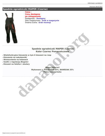 Informacje o produkcie Utworzono 08-03-2017 Spodnie ogrodniczki MAPER (Czarne) Cena : Ceny dostępne po zalogowaniu rg Dostępność : Dostępny Stan magazynowy : brak w magazynie Średnia ocena : brak recenzji ● ● ● ● ● po l.o Spodnie ogrodniczki MAPER (Czarne) Kolor Czarno/ Pomarańczowe Wielofunkcyjne kieszenie w tym 6 kieszeni na rzep Kieszenie na nakolanniki Wzmocnienie na kolanach Szelki z regulacją długości Kieszeń na felefon i okulary da na Waga:260g/m2 Wykonane z: POLIESTER 65%, BAWEŁNA 35% Pełna rozmiarówka Wygenerowano w programie www.oscGold.com