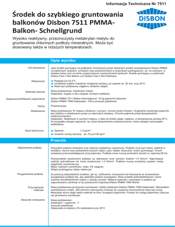 Informacja Techniczna Nr 7511 Środek do szybkiego gruntowania balkonów Disbon 7511 PMMABalkon- Schnellgrund Wysoko reaktywny, przezroczysty metakrylan metylu do gruntowania chłonnych podłoży mineralnych. Może być stosowany także w niższych temperaturach. Opis wyrobu Cel stosowania Właściwości Materiały bazowe Opakowanie/Wielkości pojemników Kolory Składowanie Dane techniczne Jako środek gruntujący na podłożach mineralnych przed ułożeniem powłok posadzkowych Disbon PMMA na balkonach, tarasach, schodach oraz powierzchniach w budynkach parkingowych, np. na rampach, w obrębie łuków oraz na silnie uczęszczanych nawierzchniach jezdnych. Środek gruntujący w systemach Disbon Fast´n´flex Balkon und Disbon Fast´n´flex Parkhaus. ■ Reaguje już od 3°C ■ Umożliwia szybkie nałożenie następnej warstwy, po upływie ok. 30 min. przy 20°C ■ Może być poddawany ciągłemu działaniu wilgoci Masa podstawowa: metakrylan metylu Katalizator: bogaty w tlen związek na bazie nadtlenku Disbon PMMA 7511 Balkon-Schnellgrund: 10 kg pojemniki blaszane Disbon PMMA 7588 Katalysator: 100 g woreczki plastikowe Przezroczysty Masa podstawowa: W miejscu chłodnym i suchym, chronić przed mrozem. Oryginalnie zamknięty pojemnik jest stabilny w składowaniu przez co najmniej 6 miesięcy. Chronić pojemnik przed bezpośrednim nasłonecznieniem. Katalizator: Składować w suchym miejscu, z dala od źródeł ciepła i zapłonu, w temperaturze poniżej 30°C. W przypadku silnego nagrzania, np. przez bezpośrednie nasłonecznienie, może nastąpić samozapłon katalizatora. ■ Gęstość: 1,4 g/cm³. ■ Grubość suchej warstwy: ok. 70 µm/100 g/m² Przerób Odpowiednie podłoża Wszystkie podłoża mineralne oraz chłonne wykładziny ceramiczne. Podłoże musi być nośne, stabilne w kształcie, mocne oraz pozbawione luźnych części, pyłu, olejów, tłuszczów, ścieru gumowego i innych substancji przeciwdziałających przyczepności. Podłoża nowe muszą pochodzić sprzed co najmniej 28 dni. Wytrzymałość powierzchni podłoża na oderwanie musi wynosić średnio 1,5 N/mm². Najmniejsza wartość jednostkowa nie może przekroczyć 1,0 N/mm². Podłoża muszą wcześniej uzyskać swoją wilgotność wyrównawczą: Beton i jastrych cementowy: maks. 6% wagowo Wilgoć podciąganą należy wykluczyć. Przygotowanie podłoża Przyrządzanie materiału Stosunek zmieszania Za pomocą odpowiednich środków, jak np. szlifowanie, śrutowanie lub frezowanie ze śrutowaniem przygotować podłoże tak, aby spełniało podane wymagania. Stare powłoki jednoskładnikowe i luźne warstwy dwuskładnikowe należy z zasady usuwać. Miejsca wyłamań i uszkodzeń w podłożu po zagruntowaniu zamknąć w licu powierzchni zaprawą Disbon PMMA 7595 Mörtel. Masę podstawową gruntownie rozmieszać i dodać katalizator Disbon PMMA 7588 Katalysator. Mieszadłem wolnobieżnym (maks. 400 obr/min) intensywnie mieszać do uzyskania równomiernej masy bez smug. Mieszanie winno objąć także materiał na dnie i brzegach pojemnika. Przelać do innego pojemnika i jeszcze raz gruntownie wymieszać. Masa podstawowa : Katalizator 1 pojemnik : 3 woreczki plastikowe Odpowiada to dodaniu 3% katalizatora przy 20°C Informacja Techniczna Nr 7511 Temperatura podłoża w °C; dozowanie katalizatora Disbon PMMA 7588 Katalysator w % (wartości orientacyjne) °C 3 5 10 15 20 25 30 35 Dodatek w% 6 6 4 4 3 2 2 2 Sposób nanoszenia W zależności od zastosowania wałkiem odpornym na rozpuszczalniki z włosiem krótkim lub o średniej długości albo pędzlem (tylko obróbka detali). Konstrukcja powłoki Wymieszany materiał nakładać na powierzchnię wałkiem lub pędzlem i rozwałkować równomiernie sposobem krzyżowym. Materiał należy nanosić tak, aby tworzył widoczną błonę Wskazówka: Materiał nie może być posypywany ani wypełniany piaskiem kwarcowym. Do szpachlowań cyklinowanych stosuje się warstwę rozpływną Disbon PMMA 7577 Verlaufschicht. Inne konstrukcje systemowe patrz instrukcje dla systemów Disbon Fast´n´Flex Balkon (do balkonów) i Disbon Fast´n´Flex Parkhaus (do parkingów w budynkach). Zużycie ok. 400 g/m² Czas urabialności Ok. 10 min. przy 20°C Warunki przerobu Temperatura materiału, powietrza w otoczeniu i podłoża: Min. 3°C, maks. 35°C. Względna wilgotność powietrza nie może przekraczać 90%. Temperatura podłoża powinna być zawsze co najmniej o 3°C wyższa od temperatury rosy. Czasy oczekiwania Schnięcie/czas schnięcia Czyszczenie narzędzi Czasy oczekiwania między czynnościami roboczymi powinny przy 20°C wynosić co najmniej 30 minut i maks. 2 godziny. Wyższe temperatury skracają, a niższe wydłużają podane czasy oczekiwania. W razie dłuższych czasów oczekiwania należy powierzchnię uszorstnić i reaktywować rozcieńczalnikiem Disbon HS 8344 PMMA-Verdünnung. Po dostatecznym czasie odpowietrzenia, wynoszącym co najmniej 2 godziny, można nakładać następną warstwę. Przy 20°C i po dodaniu 3% katalizatora powierzchnia po 30 minutach nadaje się do chodzenia i jest odporna na deszcz, a po 2 godzinach jest utwardzona. Natychmiast po użyciu i przy dłuższych przerwach w pracy - za pomocą rozcieńczalnika Disbon HS 8344 PMMA-Verdünnung. Wskazówki: Ekspertyzy Wskazówki dotyczące zagrożeń/ Porady dotyczące bezpieczeństwa (stan w chwili składania do druku) Usuwanie odpadów Wartość graniczna UE dla zawartości VOC Giscode Dane szczegółowe Najnowsze informacje na żądanie Ciecz i pary są łatwo zapalne. Powoduje podrażnienia skóry. Może wywołać alergiczne reakcje skórne. Powoduje poważne podrażnienie oczu. Może wywołać podrażnienie dróg oddechowych. Trzymać z dala od żaru/ iskier/ otwartego ognia/ gorących powierzchni. Nie palić. Przedsięwziąć środki przeciwdziałania ładunkom elektrostatycznym. Nosić rękawice ochronne/ odzież ochronną/ ochronę oczu/ ochronę twarzy. W RAZIE ZETKNIĘCIA Z OCZAMI: Przez kilka minut