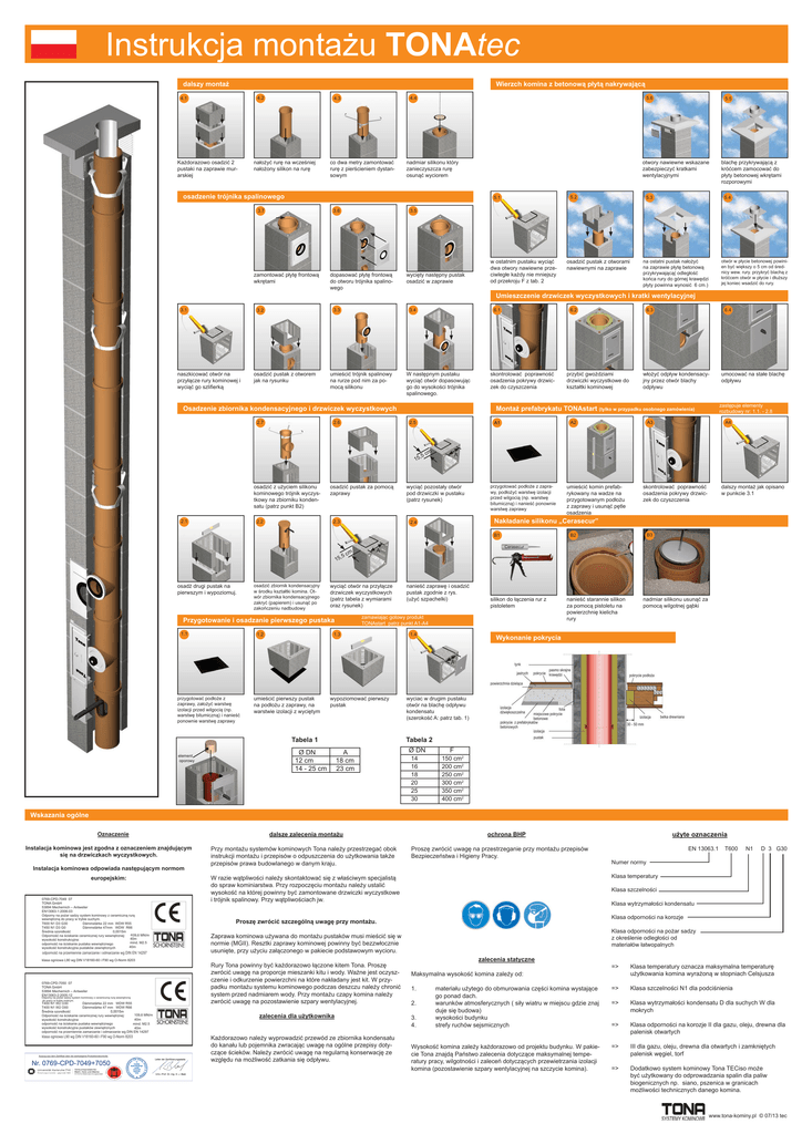 Instrukcja montażu TONAtec dalszy montaż Wierzch komina z betonową płytą nakrywającą 4.2 4.1 Każdorazowo osadzić 2 pustaki na zaprawie murarskiej 4.4 4.3 nałożyć rurę na wcześniej nałożony silikon na rurę co dwa metry zamontować rurę z pierścieniem dystansowym 5.6 nadmiar silikonu który zanieczyszcza rurę osunąć wyciorem osadzenie trójnika spalinowego otwory nawiewne wskazane zabezpieczyć kratkami wentylacyjnymi 5.1 3.7 3.6 zamontować płytę frontową wkrętami 5.5 5.2 5.3 blachę przykrywającą z króćcem zamocować do płyty betonowej wkrętami rozporowymi 5.4 3.5 dopasować płytę frontową do otworu trójnika spalinowego wycięty następny pustak osadzić w zaprawie w ostatnim pustaku wyciąć dwa otwory nawiewne przeciwległe każdy nie mniejszy od przekroju F z tab. 2 osadzić pustak z otworami nawiewnymi na zaprawie na ostatni pustak nałożyć na zaprawie płytę betonową przykrywającą( odległość końca rury do górnej krawędzi płyty powinna wynosić 6 cm.) otwór w płycie betonowej powinien być większy o 5 cm od średnicy wew. rury. przykryć blachą z króćcem otwór w płycie i dłuższy jej koniec wsadzić do rury. Umieszczenie drzwiczek wyczystkowych i kratki wentylacyjnej 3.1 3.3 3.2 naszkicować otwór na przyłącze rury kominowej i wyciąć go szlifierką osadzić pustak z otworem jak na rysunku 6.1 3.4 umieścić trójnik spalinowy na rurze pod nim za pomocą silikonu W następnym pustaku wyciąć otwór dopasowując go do wysokości trójnika spalinowego. Osadzenie zbiornika kondensacyjnego i drzwiczek wyczystkowych 2.7 2.6 2.5 A1 ,5 2.1 2.2 osadzić pustak za pomocą zaprawy 2.3 cm wyciąć pozostały otwór pod drzwiczki w pustaku (patrz rysunek) przygotować podłoże z zaprawy, podłożyć warstwę izolacji przed wilgocią (np. warstwę bitumiczną) i nanieść ponownie warstwę zaprawy osadź drugi pustak na pierwszym i wypoziomuj. osadzić zbiornik kondensacyjny w środku kształtki komina. Otwór zbiornika kondensacyjnego zakryć (papierem) i usunąć po zakończeniu nadbudowy cm 1.1 1.2 zastępuje elementy rozbudowy nr: 1.1. - 2.8 A3 A4 umieścić komin prefabrykowany na wadze na przygotowanym podłożu z zaprawy i usunąć pętle osadzenia skontrolować poprawność osadzenia pokrywy drzwiczek do czyszczenia dalszy montaż jak opisano w punkcie 3.1 B3 B2 A wyciąć otwór na przyłącze drzwiczek wyczystkowych (patrz tabela z wymiarami oraz rysunek) nanieść zaprawę i osadzić pustak zgodnie z rys. (użyć szpachelki) silikon do łączenia rur z pistoletem zamawiając gotowy produkt TONAstart patrz punkt A1-A4 Przygotowanie i osadzanie pierwszego pustaka A2 umocować na stałe blachę odpływu Nakładanie silikonu „Cerasecur” B1 ,5 włożyć odpływ kondensacyjny przez otwór blachy odpływu A 2.4 15 przybić gwoździami drzwiczki wyczystkowe do kształtki kominowej 6.4 Montaż prefabrykatu TONAstart (tylko w przypadku osobnego zamówienia) 15 osadzić z użyciem silikonu kominowego trójnik wyczystkowy na zbiorniku kondensatu (patrz punkt B2) skontrolować poprawność osadzenia pokrywy drzwiczek do czyszczenia 6.3 6.2 1.3 1.4 nanieść starannie silikon za pomocą pistoletu na powierzchnię kielicha rury nadmiar silikonu usunąć za pomocą wilgotnej gąbki Wykonanie pokrycia A przygotować podłoże z zaprawy, założyć warstwę izolacji przed wilgocią (np. warstwę bitumiczną) i nanieść ponownie warstwę zaprawy umieścić pierwszy pustak na podłożu z zaprawy, na warstwie izolacji z wyciętym wypoziomować pierwszy pustak Tabela 1 element oporowy Ø DN 12 cm 14 - 25 cm wyciac w drugim pustaku otwór na blachę odpływu kondensatu (szerokość A: patrz tab. 1) Tabela 2 A 18 cm 23 cm Ø DN 14 16 18 20 25 30 F 150 cm2 200 cm2 250 cm2 300 cm2 350 cm2 400 cm2 Wskazania ogólne Oznaczenie Instalacja kominowa jest zgodna z oznaczeniem znajdującym się na drzwiczkach wyczystkowych. Instalacja kominowa odpowiada następującym normom europejskim: dalsze zalecenia montażu Przy montażu systemów kominowych Tona należy przestrzegać obok instrukcji montażu i przepisów o odpuszczenia do użytkowania także przepisów prawa budowlanego w danym kraju. Proszę zwrócić uwagę na przestrzeganie przy montażu przepisów Bezpieczeństwa i Higieny Pracy. N1 D 3 G30 Numer normy Klasa wytrzymałości kondensatu Klasa odporności na korozje Klasa odporności na pożar sadzy z określenie odległości od materiałów łatwopalnych Zaprawa kominowa używana do montażu pustaków musi mieścić się w normie (MGII). Resztki zaprawy kominowej powinny być bezzwłocznie usunięte, przy użyciu załączonego w pakiecie podstawowym wycioru. Każdorazowo należy wyprowadzić przewód ze zbiornika kondensatu do kanału lub pojemnika zwracając uwagę na ogólne przepisy dotyczące ścieków. Należy zwrócić uwagę na regularną konserwację ze względu na możliwość zatkania się odpływu. T600 Klasa szczelności Proszę zwrócić szczególną uwagę przy montażu. zalecenia dla użytkownika EN 13063.1 Klasa temperatury W razie wątpliwości należy skontaktować się z właściwym specjalistą do spraw kominiarstwa. Przy rozpoczęciu montażu należy ustalić wysokość na której powinny być zamontowane drzwiczki wyczystkowe i trójnik spalinowy. Przy wątpliwościach jw. Rury Tona powinny być każdorazowo łączone kitem Tona. Proszę zwrócić uwagę na proporcje mieszanki kitu i wody. Ważne jest oczyszczenie i odkurzenie powierzchni na które nakładany jest kit. W przypadku montażu systemu kominowego podczas deszczu należy chronić system przed nadmiarem wody. Przy montażu czapy komina należy zwrócić uwagę na pozostawienie szpary wentylacyjnej. użyte oznaczenia ochrona BHP zalecenia statyczne => Klasa temperatury oznacza maksymalna temperaturę użytkowania komina wyrażoną w stopniach Celsjusza materiału użytego do obmurowania części komina wystające go ponad dach. warunków atmosferycznych ( siły