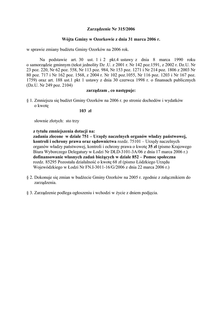 Zarządzenie Nr 315/2006 Wójta Gminy w Ozorkowie z dnia 31 marca 2006 r. w sprawie zmiany budżetu Gminy Ozorków na 2006 rok. Na podstawie art. 30 ust. 1 i 2 pkt.4 ustawy z dnia 8 marca 1990 roku o samorządzie gminnym (tekst jednolity Dz .U. z 2001 r. Nr 142 poz.1591, z 2002 r. Dz.U. Nr 23 poz. 220, Nr 62 poz. 558, Nr 113 poz. 984, Nr 153 poz. 1271 i Nr 214 poz. 1806 z 2003 Nr 80 poz. 717 i Nr 162 poz. 1568, z 2004 r. Nr 102 poz.1055, Nr 116 poz. 1203 i Nr 167 poz. 1759) oraz art. 188 ust.1 pkt 1 ustawy z dnia 30 czerwca 1998 r. o finansach publicznych (Dz.U. Nr 249 poz. 2104) zarządzam , co następuje: § 1. Zmniejsza się budżet Gminy Ozorków na 2006 r. po stronie dochodów i wydatków o kwotę 103 zł słownie złotych: sto trzy z tytułu zmniejszenia dotacji na: zadania zlecone w dziale 751 – Urzędy naczelnych organów władzy państwowej, kontroli i ochrony prawa oraz sądownictwa rozdz. 75101 – Urzędy naczelnych organów władzy państwowej, kontroli i ochrony prawa o kwotę 35 zł (pismo Krajowego Biura Wyborczego Delegatury w Łodzi Nr DŁD-3101-3A/06 z dnia 17 marca 2006 r.) dofinansowanie własnych zadań bieżących w dziale 852 – Pomoc społeczna rozdz. 85295 Pozostała działalność o kwotę 68 zł (pismo Łódzkiego Urzędu Wojewódzkiego w Łodzi Nr FN.I-3011-16/G/2006 z dnia 22 marca 2006 r.) § 2. Dokonuje się zmian w budżecie Gminy Ozorków na 2005 r. zgodnie z załącznikiem do zarządzenia. § 3. Zarządzenie podlega ogłoszeniu i wchodzi w życie z dniem podjęcia. Załącznik do Zarządzenia Nr 315/2006 Wójta Gminy w Ozorkowie z dnia 31 marca 2006 r. Zestawienie zmian w budżecie Gminy Ozorków na 2006 r. Dz. Rozdz. § 751 75101 2010 4300 852 85295 2030 3110 Treść Urzędy naczelnych organów władzy państwowej, kontroli i ochrony prawa oraz sądownictwa Urzędy naczelnych organów władzy państwowej, kontroli i ochrony prawa Dotacje celowe otrzymane z budżetu państwa na realizacje zadań bieżących z zakresu administracji rządowej oraz innych zadań zleconych gminie (związkom gmin) ustawami Zakup usług pozostałych Pomoc społeczna Pozostała działalność Dotacje celowe otrzymane z budżetu państwa na realizacje własnych zadań bieżących gmin (związków gmin) Świadczenia społeczne Ogółem Dochody Wydatki 35 35 35 35 35 68 68 68 103 35 68 68 68 103
