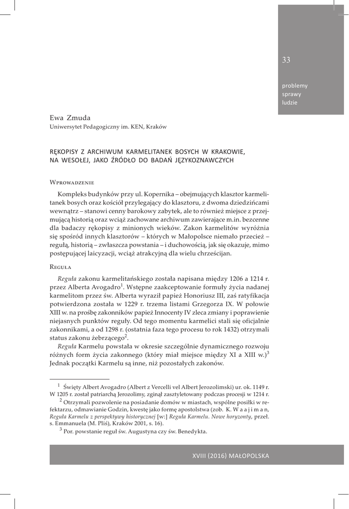 Rękopisy z archiwum karmelitanek bosych w Krakowie, na Wesołej, jako źródło... 33 problemy sprawy ludzie Ewa Zmuda Uniwersytet Pedagogiczny im. KEN, Kraków RĘKOPISY Z ARCHIWUM KARMELITANEK BOSYCH W KRAKOWIE, NA WESOŁEJ, JAKO ŹRÓDŁO DO BADAŃ JĘZYKOZNAWCZYCH Wprowadzenie Kompleks budynków przy ul. Kopernika – obejmujących klasztor karmelitanek bosych oraz kościół przylegający do klasztoru, z dwoma dziedzińcami wewnątrz – stanowi cenny barokowy zabytek, ale to również miejsce z przejmującą historią oraz wciąż zachowane archiwum zawierające m.in. bezcenne dla badaczy rękopisy z minionych wieków. Zakon karmelitów wyróżnia się spośród innych klasztorów – których w Małopolsce niemało przecież – regułą, historią – zwłaszcza powstania – i duchowością, jak się okazuje, mimo postępującej laicyzacji, wciąż atrakcyjną dla wielu chrześcijan. Reguła Reguła zakonu karmelitańskiego została napisana między 1206 a 1214 r. przez Alberta Avogadro1. Wstępne zaakceptowanie formuły życia nadanej karmelitom przez św. Alberta wyraził papież Honoriusz III, zaś ratyfikacja potwierdzona została w 1229 r. trzema listami Grzegorza IX. W połowie XIII w. na prośbę zakonników papież Innocenty IV zleca zmiany i poprawienie niejasnych punktów reguły. Od tego momentu karmelici stali się oficjalnie zakonnikami, a od 1298 r. (ostatnia faza tego procesu to rok 1432) otrzymali status zakonu żebrzącego2. Reguła Karmelu powstała w okresie szczególnie dynamicznego rozwoju różnych form życia zakonnego (który miał miejsce między XI a XIII w.)3 Jednak początki Karmelu są inne, niż pozostałych zakonów. 1 Święty Albert Avogadro (Albert z Vercelli vel Albert Jerozolimski) ur. ok. 1149 r. W 1205 r. został patriarchą Jerozolimy, zginął zasztyletowany podczas procesji w 1214 r. 2 Otrzymali pozwolenie na posiadanie domów w miastach, wspólne posiłki w refektarzu, odmawianie Godzin, kwestę jako formę apostolstwa (zob. K. W a a j i m a n, Reguła Karmelu z perspektywy historycznej [w:] Reguła Karmelu. Nowe horyzonty, przeł. s. Emmanuela (M. Pliś), Kraków 2001, s. 16). 3 Por. powstanie reguł św. Augustyna czy św. Benedykta. XVIII (2016) maŁopolska 34 Ewa Zmuda W odróżnieniu od innych zakonów, karmelici nie mają wielkiej charyzmatycznej postaci jako swego fundatora. Trudno jest także wskazać dokładną datę ich powstania4. Powstawanie zakonu karmelitańskiego można podzielić na trzy fazy5: fazę pustelników (kilku pielgrzymów zamieszkało na górze Karmel, wybrali przełożonego, „przebywali w osobnych celach, rozmyślali nad słowem Bożym, oddawali się modlitwie i pracy w milczeniu”)6; fazę pustelników żyjących we wspólnocie na górze Karmel oraz fazę braci żebrzących w Europie (górę Karmel zaczęli opuszczać w 1238 r.) 7. Ślady tych etapów powstawania widać w samej Regule, która przedstawia „trzy koncepcje życia zakonnego: eremicką, cenobicką i żebraczą”8. Jak zauważają badacze, w Regule widoczne są ślady tradycji biblijnej, ale także tradycji monastycznych (ślady starożytnych reguł monastycznych), zwłaszcza Reguły św. Augustyna 9. Spoglądając zaś na kształt gatunkowy Reguły Karmelu, należy zaznaczyć, że posiada cechy listu10. Jak zauważa z kolei o. Kees Waajiman, „choć jego Reguła jest krótsza od innych reguł monastycznych tamtego okresu, to dzięki swej zwięzłości posiada wyrazistość poematu – kilka warstw znaczeniowych równocześnie nakłada się na siebie”11. Karmelitanki w Krakowie... Karmelitanki bose zostały sprowadzone do Polski przez swoich współbraci (którzy od 1605 r. mieli swój klasztor w Krakowie)12, a koszty całego przedsię4 J. Z i e l i ń s k i, Tajemnice góry Karmel. U karmelitańskich źródeł, Kraków 2002, s. 1. Zob. K. W a a j i m a n, dz. cyt., s. 13; por. też C. C i c c o n e t t i, Historia Reguły [w:] Droga Alberta, Rzym – Barrington 1989, s. 23–49. 6 K. W a a j i m a n, dz. cyt., s. 13. 7 Napływ islamu uniemożliwił karmelitom dalszy pobyt na górze Karmel. 8 K. W a a j i m a n, dz. cyt., s. 14. 9 Por. G. H e l e w a, Słowo Boże a Reguła Karmelu [w:] Reguła Karmelu. Nowe horyzonty, przeł. s. Emmanuela (M. Pliś), Kraków 2001, s. 24–51; K. W a a j i m a n, dz. cyt., s. 7–23. 10 Zgodnie ze schematem: prologus, exordium, narratio, petitio, conclusio. 11 K. W a a j i m a n, dz. cyt., s. 7. Waajiman następująco podsumowuje swoje uwagi na temat reguły: „Z punktu widzenia literackiego Reguła jest listem; z perspektywy historycznej – jest dokumentem epoki, w której powstał Zakon Karmelitański; z perspektywy prawa – jest zapisem dialogu, toczącego się pomiędzy władzą kościelną a grupą pustelników szukających potwierdzenia swego stylu życia; z perspektywy wewnątrztekstowej Reguła ukazuje związek pomiędzy różnymi tradycjami monastycznymi. I wreszcie z punktu widzenia duchowości, Reguła stanowi duchową strukturę, której poszczególne elementy są tak ze sobą połączone, że wytyczają duchową drogę prowadzącą do Boga” – tamże, s. 20–21. 12 Jak zauważa C. Gil: „Nie znamy okoliczności, kto i kiedy pierwszy wyszedł z tą inicjatywą. Najstarszy jej ślad znajduje się w aktach definitorium generalnego 5 XVIII (2016) maŁopolska Rękopisy z archiwum karmelitanek bosych w Krakowie, na Wesołej, jako źródło... wzięcia wzięła na siebie Konstancja z Myszkowskich Bużeńska13 z Mirowa. Fundacja tego klasztoru miała ogromne znaczenie nie tylko dla regionu, choćby ze względu na to, że był on w Krakowie jednym z pierwszych powstałych w duchu reformy trydenckiej. W maju 1612 r. do Krakowa przybyły fundatorki14 (o które poproszono w Belgii, ponieważ belgijskie klasztory zostały założone przez uczennice św. Teresy) i jeszcze w tym samym roku do klasztoru wstąpiły pierwsze trzy Polki. Był to początek zakonu karmelitanek w Polsce, który od tego cza