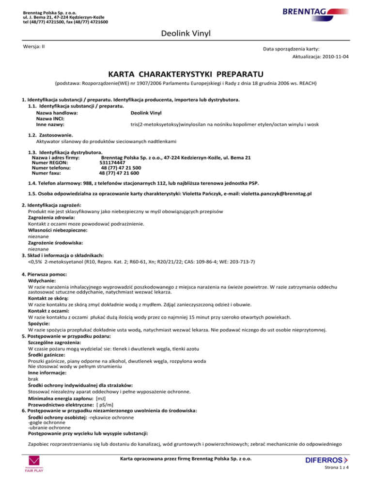 Brenntag Polska Sp. z o.o. ul. J. Bema 21, 47-224 Kędzierzyn-Koźle tel (48/77) 4721500, fax (48/77) 4721600 Deolink Vinyl Wersja: II Data sporządzenia karty: __________ Aktualizacja: 2010-11-04 KARTA CHARAKTERYSTYKI PREPARATU (podstawa: Rozporządzenie(WE) nr 1907/2006 Parlamentu Europejskiegi i Rady z dnia 18 grudnia 2006 ws. REACH) 1. Identyfikacja substancji / preparatu. Identyfikacja producenta, importera lub dystrybutora. 1.1. Identyfikacja substancji / preparatu. Nazwa handlowa: Deolink Vinyl Nazwa INCI: Inne nazwy: tris(2-metoksyetoksy)winylosilan na nośniku kopolimer etylen/octan winylu i wosk 1.2. Zastosowanie. Aktywator silanowy do produktów sieciowanych nadtlenkami 1.3. Identyfikacja dystrybutora. Nazwa i adres firmy: Brenntag Polska Sp. z o.o., 47-224 Kedzierzyn-Koźle, ul. Bema 21 Numer REGON: 531174447 Numer telefonu: 48 (77) 47 21 500 Numer faxu: 48 (77) 47 21 600 1.4. Telefon alarmowy: 988, z telefonów stacjonarnych 112, lub najbliższa terenowa jednostka PSP. 1.5. Osoba odpowiedzialna za opracowanie karty charakterystyki: Violetta Pańczyk, e-mail: [email protected] 2. Identyfikacja zagrożeń: Produkt nie jest sklasyfikowany jako niebezpieczny w myśl obowiązujących przepisów Zagrożenia zdrowia: Kontakt z oczami moze powodować podrazżnienie. Własności niebezpieczne: nieznane Zagrożenie środowiska: nieznane 3. Skład i informacja o składnikach: <0,5% 2-metoksyetanol (R10, Repro. Kat. 2; R60-61, Xn; R20/21/22; CAS: 109-86-4; WE: 203-713-7) 4. Pierwsza pomoc: Wdychanie: W razie narażenia inhalacyjnego wyprowadzić poszkodowanego z miejsca narażenia na świeże powietrze. W razie zatrzymania oddechu zastosować sztuczne oddychanie, natychmiast wezwać lekarza. Kontakt ze skórą: W razie kontaktu ze skórą zmyć dokładnie wodą z mydłem. Zdjąć zanieczyszczoną odzież i obuwie. Kontakt z oczami: W razie kontaktu z oczami płukać dużą ilością wody przez co najmniej 15 minut przy szeroko otwartych powiekach. Spożycie: W razie spożycia przepłukać dokładnie usta wodą, natychmiast wezwać lekarza. Nie podawać niczego do ust osobie nieprzytomnej. 5. Postępowanie w przypadku pożaru: Szczególne zagrożenia: W czasie pożaru mogą wydzielać sie: tlenek i dwutlenek węgla, tlenki azotu Środki gaśnicze: Proszki gaśnicze, piany odporne na alkohol, dwutlenek węgla, rozpylona woda Nie stosować wody w pełnym strumieniu Inne informacje: brak Środki ochrony indywidualnej dla strażaków: Stosować niezależny aparat oddechowy i pełne wyposażenie ochronne. Minimalna energia zapłonu: [mJ] Przewodnictwo elektryczne: [ pS/m] 6. Postępowanie w przypadku niezamierzonego uwolnienia do środowiska: Środki ochrony osobistej: -rękawice ochronne -gogle ochronne -ubranie ochronne Postępowanie przy wycieku lub wysypie substancji: Zapobiec rozprzestrzenianiu się lub dostaniu do kanalizacj, wód gruntowych i powierzchniowych; zebrać mechanicznie do odpowiedniego Karta opracowana przez firmę Brenntag Polska Sp. z o.o. Strona 1 z 4 Brenntag Polska Sp. z o.o. ul. J. Bema 21, 47-224 Kędzierzyn-Koźle tel (48/77) 4721500, fax (48/77) 4721600 Deolink Vinyl pojemnika, przekazać do usunięcia. 7. Postępowanie z substancją / preparatem i magazynowanie: Magazynowanie: Przechowywać w szczelnie zamkniętych oryginalnych pojemnikach w suchych, chłodnych i dobrze wentylowanych pomieszczeniach. Chronić przed wilgotnym powietrzem i wodą. Nie składować razem z utleniaczami. Postępowanie z substancją lub preparatem: Należy zapewnić dobrą wentylację pomieszczeń (wentylacja wyciągowa) i miejsca pracy; nie używać w pobliżu otwartego ognia, źródeł zapłonu. Unikać wdychania pyłu/oparów oraz kontaktu ze skórą, oczami i ubraniem 8. Kontrola narażenia i środki ochrony indywidualnej: Stosowane środki ochrony osobistej powinny spełniać wymogi Rozporządzenia Ministra Gospodarki z dnia 21 grudnia 2005 r. w sprawie zasadniczych wymagań dla środków ochrony indywidualnej (Dz.U. Nr 259, poz. 2173). Ochrona dróg oddechowych: ochrona dróg oddechowych Ochrona oczu: szczelne okulary lub gogle ochronne Ochrona rąk: rękawice ochronne z butylu, neoprenu, nitrylu (NBR), PVC Techniczne środki ochronne: wentylacja pomieszczeń/wentylacja wyciągowa Inne wyposażenie ochronne: ubranie ochronne Kontrola zagrożenia: Najwyższe dopuszczalne stężenia: dla 2-metoksyetanolu: NDS = 3mg/m3 NDSCh - nie ustalono (wg Rozporządzenia MIPS z dn. 6 czerwca 2014, Dz.U. 2014, poz.817) Zalecenia dotyczące procedury monitoringu zawartości składników niebezpiecznych w powietrzu – metodyka pomiarów: -Rozporządzenie Ministra Zdrowia z dnia 20 kwietnia 2005 r. w sprawie badań i pomiarów czynników szkodliwych dla zdrowia w środowisku pracy (Dz.U. Nr 73, poz.645) -PN-89/Z-01001/06. Ochrona czystości powietrza. Nazwy, określenia i jednostki. Terminologia dotycząca badań jakości powietrza na stanowiskach pracy. -PN Z-04008-7:2002. Ochrona czystości powietrza. Pobieranie próbek. Zasady pobierania próbek powietrza w środowisku pracy i interpretacja wyników. -PN-EN-689: 2002. Powietrze na stanowiskach pracy – wytyczne oceny narażenia inhalacyjnego na czynniki chemiczne przez porównanie z wartościami dopuszczalnymi i strategia pomiarowa. Uwaga: Gdy stężenie substancji jest ustalone i znane, doboru środków ochrony indywidualnej należy dokonywać z uwzględnieniem stężenia substancji występującego na danym stanowisku pracy, czasu ekspozycji oraz czynności wykonywanych przez pracownika. W sytuacji awaryjnej, jeżeli stężenie substancji na stanowisku pracy nie jest znane, stosować środki ochrony indywidualnej o najwyższej zalecanej klasie ochrony. Pracodawca jest obowiązany zapewnić, aby stosowane środki ochrony indywidualnej oraz odzież i obuwie robocze posiadały właściwości ochronne i użytkowe oraz zapewnić odpowiednie ich pranie, konserwacje, naprawę i odkażanie. Zalecane badania wstępne i okresowe pracowników należy prze