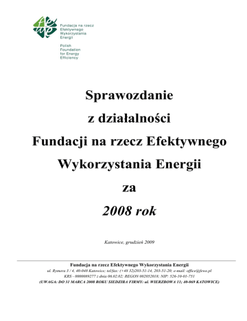 Sprawozdanie z działalności Fundacji na rzecz Efektywnego Wykorzystania Energii za 2008 rok Katowice, grudzień 2009 Fundacja na rzecz Efektywnego Wykorzystania Energii ul. Rymera 3 / 4, 40-048 Katowice; tel/fax: (+48 32)203-51-14, 203-51-20; e-mail: [email protected] KRS - 0000089277 z dnia 06.02.02; REGON 002052018; NIP: 526-10-01-751 (UWAGA: DO 31 MARCA 2008 ROKU SIEDZIBA FIRMY: ul. WIERZBOWA 11; 40-069 KATOWICE) SPIS TREŚCI I. CELE I ROZWÓJ ORGANIZACYJNY FEWE I.A. Podstawowe informacje o celach i zadaniach FEWE I.B. Rozwój organizacyjny FEWE I.B.1. Rozwój instytucjonalny FEWE I.B.2. Organizacja FEWE I.B.3. Sprawy kadrowe FEWE 3 3 4 4 6 6 II. DZIAŁALNOŚĆ MERYTORYCZNA FEWE II.A. Działalność statutowa II.A.1 Analizy i studia w zakresie polityki energetycznej i ekologicznej II.A.2 Promocja energooszczędnych technologii i urządzeń II.A.3 Edukacja ekologiczna II.A.4 Inne II.B. Działalność gospodarcza II.B.1 Forma działalności II.B.2 Zwięzły opis działalności II.B.3 Projekty prowadzone przez FEWE w ramach działalności gospodarczej w 2008r 8 8 8 14 16 16 20 20 20 21 III. FINANSE III.A. Wynik finansowy za 2008 rok III.B. Przychody i źródła ich pochodzenia III.C. Koszty działalności FEWE III.D. Pozostałe informacje finansowe III.E. Informacje o rozliczeniach fundacji z budżetem i przeprowadzonych kontrolach 33 33 33 34 35 36 IV. ZAŁĄCZNIKI Uchwały Zarządu Fundacji Raport roczny z działalności FEWE za rok 2008 I CELE I ROZWÓJ ORGANIZACYJNY FEWE I.A. Podstawowe informacje o celach i zadaniach FEWE Fundacja na rzecz Efektywnego Wykorzystania Energii (FEWE) powstała pod koniec 1990 roku jako organizacja prywatna, niezależna, której celem jest osiągnięcie efektywniejszej energetycznie gospodarki. Nadrzędnym celem FEWE jest rozwój gospodarczy kraju i zapewnienie ochrony środowiska poprzez promocję efektywnego wykorzystania energii. Od 1999 roku FEWE powierzono również misję tworzenia nowych miejsc pracy. Pomysłodawcami i pierwszymi sponsorami były instytucje ze Stanów Zjednoczonych: Battelle Memorial Institute / Pacific Northwest Laboratories, Environmental Protection Agency jak również World Wildlife Fund for Nature, Agency for International Development i Department of Energy. Pomysł spotkał się z poparciem rządu polskiego. Stopniowo FEWE i jej działalność zyskiwała zainteresowanie i wsparcie wśród krajów europejskich: Francji, Danii, Holandii, Austrii, Wielkiej Brytanii, Niemiec oraz organizacji międzynarodowych. Zadaniem FEWE jest kształtowanie świadomości zarówno decydentów kreujących politykę energetyczną, jak i producentów, dystrybutorów, oraz końcowych użytkowników energii. FEWE prowadzi działalność głównie poprzez: T analizy i studia w zakresie polityki energetycznej i ochrony środowiska; T promocję energooszczędnych technologii i urządzeń; T szkolenie i projekty demonstracyjne; T edukację społeczeństwa. Statutowe cele i zadania FEWE przedstawiają się następująco: T kreowanie i popieranie oszczędnego i efektywnego wykorzystania energii w gospodarce; T przenoszenie doświadczeń innych krajów związanych z oszczędnym i efektywnym wykorzystaniem energii; T udział w realizacji prac i projektów o charakterze międzynarodowym, związanych z rozwiązywaniem globalnych problemów ekologicznych; T inicjowanie i współtworzenie zasad polityki w zakresie efektywnego wykorzystania energii; T nawiązywanie i wspieranie międzynarodowych kontaktów w celu poprawy ekologicznej sytuacji kraju; T wspieranie i inspirowanie w zakresie statutowych celów Fundacji: organizacji społecznych i politycznych, administracji państwowej i samorządu terytorialnego, ruchów ekologicznych oraz innych grup związanych z działalnością gospodarczą; T zorganizowanie Centrum badawczego, którego zadaniem będzie: a. wykonywanie niezależnych badań i analiz, a także formułowanie zasad polityki w zakresie efektywnego wykorzystania energii w Polsce i w innych krajach Europy Centralnej; b. podejmowanie działań mających na celu poprawę środowiska naturalnego i warunków życia człowieka. Podstawowe informacje o FEWE i jej działalności są prezentowane w Internecie: www.fewe.pl 3 Raport roczny z działalności FEWE za rok 2008 I.B. Rozwój organizacyjny FEWE I.B.1. Rozwój instytucjonalny FEWE Poniżej przedstawiono najważniejsze wydarzenia związane z rozwojem instytucjonalnym FEWE. 21.09.1990 Powołanie Fundacji na rzecz Efektywnego Wykorzystania Energii aktem notarialnym nr rep. III - 20887/90 sporządzonym w Państwowym Biurze Notarialnym w Warszawie 30.10.1990 Zatwierdzenie Fundacji przez Ministra Ochrony Środowiska, Zasobów Naturalnych i Leśnictwa 21.12.1990 Rejestracja FEWE w Sądzie Rejonowym dla Warszawy-Pragi, Wydział Cywilny, wpis do rejestru fundacji pod pozycją RF I 949 07.02.1991 Wpis FEWE do systemu identyfikacji podmiotów gospodarki narodowej REGON po numerem 002052018 02. 03.1991 Otwarcie biur w Warszawie i w Katowicach 08.04.1991 Oficjalne otwarcie FEWE; inauguracyjne spotkanie Rady Fundacji 01.12.1991 Powołanie przy Fundacji Centrum Informacji: Metan Pokładów Węgla Zadaniem Centrum Informacji: Metan Pokładów Węgla (Coalbed Methane Clearinghouse) było zbieranie i rozpowszechnianie informacji dotyczących intensyfikacji pozyskiwania i wykorzystania metanu z pokładów węgla. Centrum organizowało szkolenia, konferencje promujące metan jako źródło energii, wydawało specjalistyczny biuletyn (w języku polskim i angielskim), zorganizowało tematyczną bibliotekę, opracowało studia wykonalności dla kopalń. Centrum Informacji działało do grudnia 1995 roku. 01.10.1992 Otwarcie tymczasowego Centrum Fundacji w Krakowie 08.1993 Rejestracja i rozpoczęcie działalności gospodarczej 18.02.1994 Oficjalne otwarcie centrum Fundacji w Krakowie (powiązane ze zmianą tymczasowego adresu centrum) Centrum krakowskie było odpowiedzialne przede wszystkim za działalność szkoleniową, 