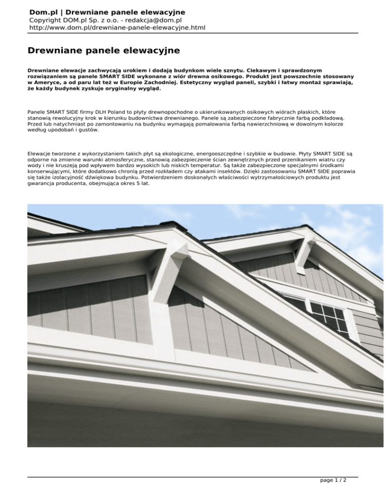 Dom.pl | Drewniane panele elewacyjne Copyright DOM.pl Sp. z o.o. - [email protected] http://www.dom.pl/drewniane-panele-elewacyjne.html Drewniane panele elewacyjne Drewniane elewacje zachwycają urokiem i dodają budynkom wiele sznytu. Ciekawym i sprawdzonym rozwiązaniem są panele SMART SIDE wykonane z wiór drewna osikowego. Produkt jest powszechnie stosowany w Ameryce, a od paru lat też w Europie Zachodniej. Estetyczny wygląd paneli, szybki i łatwy montaż sprawiają, że każdy budynek zyskuje oryginalny wygląd. Panele SMART SIDE firmy DLH Poland to płyty drewnopochodne o ukierunkowanych osikowych wiórach płaskich, które stanowią rewolucyjny krok w kierunku budownictwa drewnianego. Panele są zabezpieczone fabrycznie farbą podkładową. Przed lub natychmiast po zamontowaniu na budynku wymagają pomalowania farbą nawierzchniową w dowolnym kolorze według upodobań i gustów. Elewacje tworzone z wykorzystaniem takich płyt są ekologiczne, energooszczędne i szybkie w budowie. Płyty SMART SIDE są odporne na zmienne warunki atmosferyczne, stanowią zabezpieczenie ścian zewnętrznych przed przenikaniem wiatru czy wody i nie kruszeją pod wpływem bardzo wysokich lub niskich temperatur. Są także zabezpieczone specjalnymi środkami konserwującymi, które dodatkowo chronią przed rozkładem czy atakami insektów. Dzięki zastosowaniu SMART SIDE poprawia się także izolacyjność dźwiękowa budynku. Potwierdzeniem doskonałych właściwości wytrzymałościowych produktu jest gwarancja producenta, obejmująca okres 5 lat. page 1 / 2 Dom.pl | Drewniane panele elewacyjne Copyright DOM.pl Sp. z o.o. - [email protected] http://www.dom.pl/drewniane-panele-elewacyjne.html (SMART SIDE na elewacji domu w stylu tradycyjnym. fot. DLH Poland) Płyta SMART SIDE 11mm x 2440 x 1220mm 49 zł/m2 brutto Importer: DLH Poland www.dlh.pl page 2 / 2