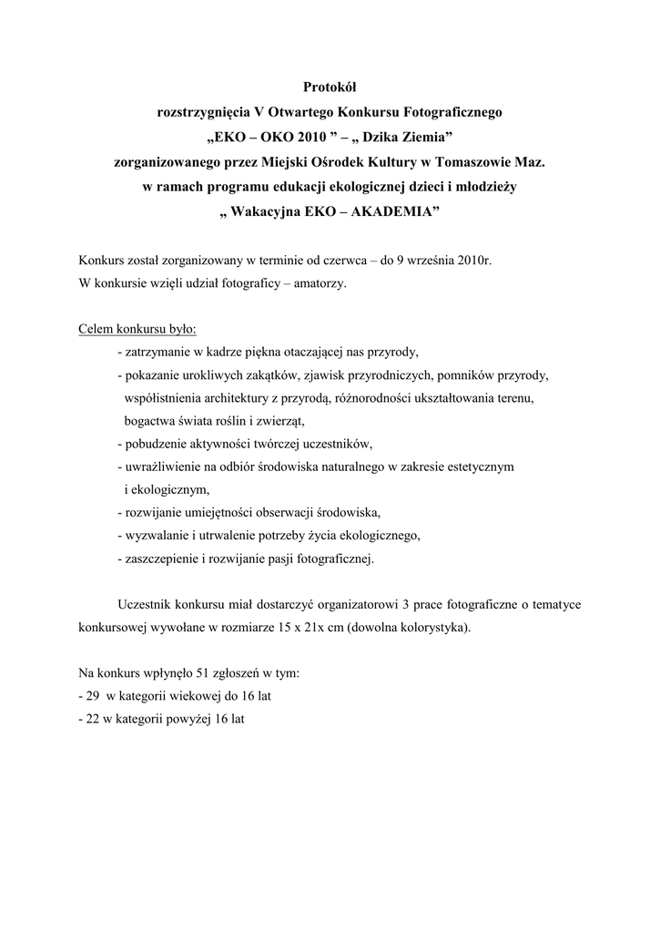 Protokół rozstrzygnięcia V Otwartego Konkursu Fotograficznego „EKO – OKO 2010 ” – „ Dzika Ziemia” zorganizowanego przez Miejski Ośrodek Kultury w Tomaszowie Maz. w ramach programu edukacji ekologicznej dzieci i młodzieży „ Wakacyjna EKO – AKADEMIA” Konkurs został zorganizowany w terminie od czerwca – do 9 września 2010r. W konkursie wzięli udział fotograficy – amatorzy. Celem konkursu było: - zatrzymanie w kadrze piękna otaczającej nas przyrody, - pokazanie urokliwych zakątków, zjawisk przyrodniczych, pomników przyrody, współistnienia architektury z przyrodą, różnorodności ukształtowania terenu, bogactwa świata roślin i zwierząt, - pobudzenie aktywności twórczej uczestników, - uwrażliwienie na odbiór środowiska naturalnego w zakresie estetycznym i ekologicznym, - rozwijanie umiejętności obserwacji środowiska, - wyzwalanie i utrwalenie potrzeby życia ekologicznego, - zaszczepienie i rozwijanie pasji fotograficznej. Uczestnik konkursu miał dostarczyć organizatorowi 3 prace fotograficzne o tematyce konkursowej wywołane w rozmiarze 15 x 21x cm (dowolna kolorystyka). Na konkurs wpłynęło 51 zgłoszeń w tym: - 29 w kategorii wiekowej do 16 lat - 22 w kategorii powyżej 16 lat W dniu 14 września 2010r. w siedzibie Ośrodka Jury dokonało oceny prac konkursowych i przyznało nagrody i wyróżnienia. Skład Jury: Czesław Abratkiewicz - Przewodniczący Jury artysta fotografik Anna Cichawa - inspektor Wydziału Inżyniera Miasta Urzędu Miasta w Tomaszowie Maz. Anna Modzelewska - fotograf Justyna Kołodziejska - sekretarz jury W kategorii wiekowej do 16 lat: I nagroda - Tomasz Kocik (zdj. „Rzeka kamienna”) II nagroda - Adrianna Ziółek (zdj. „Motylem jestem”) III nagroda - Maja Pinczewska (zdj. Hmn…dopiero się czesałem) Wyróżnienia: Olga Andrzejewska (zdj. „Nadpilickie Wschody Słońca”) Iga Macińska (zdj. „Stokrotne Wdzięki”) Natalia Rakowiecka (zdj. „Ostatnie blaski słońca”) W kategorii wiekowej powyżej 16 lat: I nagroda - Marcin Małkiewicz (zdj. „W płomieniach”) II nagroda - Anna Macińska (zdj. „Zapomnienie 2”) III nagroda - Miłosz Cieciura (zdj. „Maculinea teleius (Modraszek telejus)”) Wyróżnienia: Lidia Urbańska – Ptak (zdj. „Kwitnąco”) Mikołaj Marcinkowski (zdj. „Cykl zalew”) Monika Urbańska – Domaradzka (zdj. „W drodze”) Na wystawie prezentowane są zdjęcia wszystkich uczestników konkursu. Wystawa czynna będzie od 14 października do 30 listopada 2010r. w siedzibie MOK przy ul. Browarnej 7. Fundatorem nagród w konkursie był Miejski Ośrodek Kultury w Tomaszowie Mazowieckim przy współudziale środków z Wojewódzkiego Funduszu Ochrony Środowiska i Gospodarki Wodnej w Łodzi.