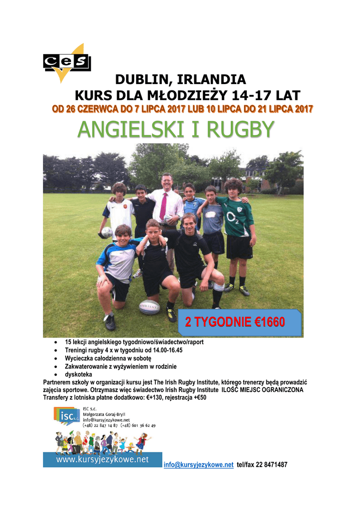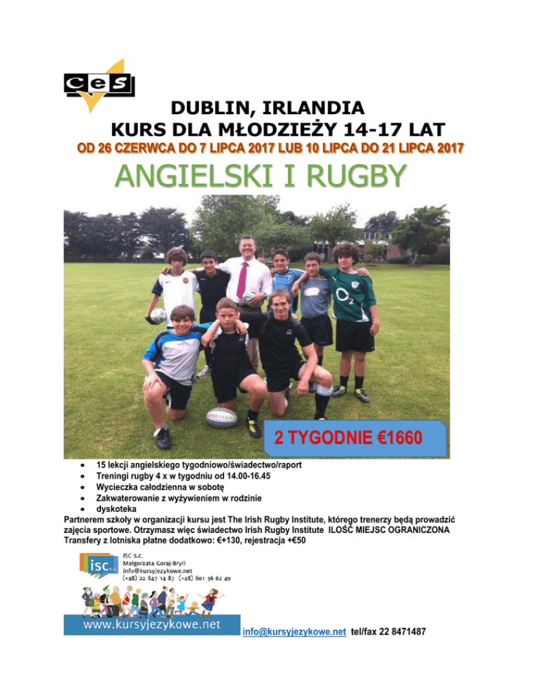 DUBLIN, IRLANDIA KURS DLA MŁODZIEŻY 14-17 LAT ANGIELSKI I RUGBY 2 TYGODNIE €1660 15 lekcji angielskiego tygodniowo/świadectwo/raport Treningi rugby 4 x w tygodniu od 14.00-16.45 Wycieczka całodzienna w sobotę Zakwaterowanie z wyżywieniem w rodzinie dyskoteka Partnerem szkoły w organizacji kursu jest The Irish Rugby Institute, którego trenerzy będą prowadzić zajęcia sportowe. Otrzymasz więc świadectwo Irish Rugby Institute ILOŚĆ MIEJSC OGRANICZONA Transfery z lotniska płatne dodatkowo: €+130, rejestracja +€50 [email protected] tel/fax 22 8471487