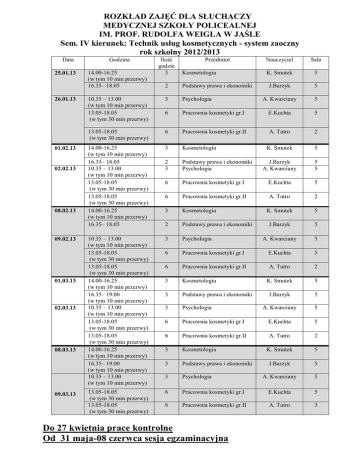 ROZKŁAD ZAJĘĆ DLA SŁUCHACZY MEDYCZNEJ SZKOŁY POLICEALNEJ IM. PROF. RUDOLFA WEIGLA W JAŚLE Sem. IV kierunek: Technik usług kosmetycznych - system zaoczny rok szkolny 2012/2013 Data 25.01.13 26.01.13 01.02.13 02.02.13 08.02.13 09.02.13 01.03.13 02.03.13 08.03.13 09.03.13 Godzina 14.00-16.25 (w tym 10 min przerwy) 16.35– 18.05 Ilość godzin 3 Przedmiot Kosmetologia Nauczyciel Sala K. Smutek 5 J.Barzyk 5 A. Kwarciany 5 2 Podstawy prawa i ekonomiki 10.35 – 13.00 (w tym 10 min przerwy) 13.05-18.05 (w tym 30 min przerwy) 3 Psychologia 6 Pracownia kosmetyki gr.I E.Kuchta 5 13.05-18.05 (w tym 30 min przerwy) 6 Pracownia kosmetyki gr.II A. Tutro 2 14.00-16.25 (w tym 10 min przerwy) 16.35– 18.05 10.35 – 13.00 (w tym 10 min przerwy) 13.05-18.05 (w tym 30 min przerwy) 13.05-18.05 (w tym 30 min przerwy) 14.00-16.25 (w tym 10 min przerwy) 16.35– 18.05 3 Kosmetologia K. Smutek 5 2 3 Podstawy prawa i ekonomiki Psychologia J.Barzyk A. Kwarciany 5 5 6 Pracownia kosmetyki gr.I E.Kuchta 5 6 Pracownia kosmetyki gr.II A. Tutro 2 3 Kosmetologia K. Smutek 5 2 Podstawy prawa i ekonomiki J.Barzyk 5 10.35 – 13.00 (w tym 10 min przerwy) 13.05-18.05 (w tym 30 min przerwy) 13.05-18.05 (w tym 30 min przerwy) 14.00-16.25 (w tym 10 min przerwy) 16.35– 19.00 (w tym 10 min przerwy) 10.35 – 13.00 (w tym 10 min przerwy) 13.05-18.05 (w tym 30 min przerwy) 13.05-18.05 (w tym 30 min przerwy) 14.00-16.25 (w tym 10 min przerwy) 16.35– 19.00 (w tym 10 min przerwy) 10.35 – 13.00 (w tym 10 min przerwy) 3 Psychologia A. Kwarciany 5 6 Pracownia kosmetyki gr.I E.Kuchta 5 6 Pracownia kosmetyki gr.II A. Tutro 2 3 Kosmetologia K. Smutek 5 3 Podstawy prawa i ekonomiki J.Barzyk 5 3 Psychologia A. Kwarciany 5 6 Pracownia kosmetyki gr.I E.Kuchta 5 6 Pracownia kosmetyki gr.II A. Tutro 2 3 Kosmetologia K. Smutek 5 3 Podstawy prawa i ekonomiki J.Barzyk 5 3 Psychologia A. Kwarciany 5 13.05-18.05 (w tym 30 min przerwy) 13.05-18.05 (w tym 30 min przerwy) 6 Pracownia kosmetyki gr.I E.Kuchta 5 6 Pracownia kosmetyki gr.II A. Tutro 3 Do 27 kwietnia prace kontrolne Od 31 maja-08 czerwca sesja egzaminacyjna