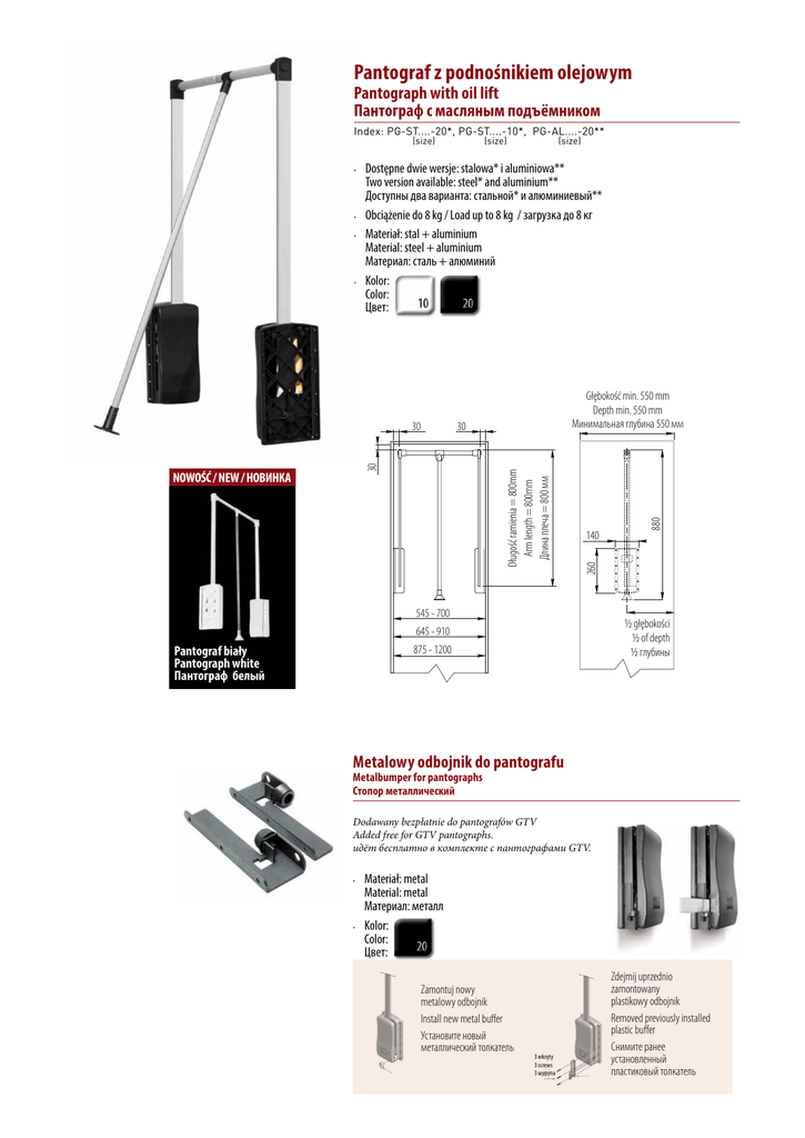 Pantograf z podnośnikiem olejowym Pantograph with oil lift Пантограф с масляным подъëмником Index: PG-ST....-20*, PG-ST....-10*, PG-AL....-20** (size) (size) (size) Dostępne dwie wersje: stalowa* i aluminiowa** Two version available: steel* and aluminium** Доступны два варианта: стальной* и алюминиевый** • Obciążenie do 8 kg / Load up to 8 kg / загрузка до 8 кг • Materiał: stal + aluminium Material: steel + aluminium Материал: сталь + алюминий • Kolor: Color: Цвет: • 545 - 700 ½ głębokości ½ of depth ½ глубины 645 - 910 875 - 1200 Pantograf biały Pantograph white Пантограф белый 880 30 Długość ramienia = 800mm Arm length = 800mm Длина плеча = 800 мм 140 260 30 30 NOWOŚĆ / NEW / НОВИНКА Głębokość min. 550 mm Depth min. 550 mm Минимальная глубина 550 мм Metalowy odbojnik do pantografu Metalbumper for pantographs Стопор металлический Dodawany bezpłatnie do pantografów GTV Added free for GTV pantographs. идёт бесплатно в комплекте с пантографами GTV. Materiał: metal Material: metal Материал: металл • Kolor: Color: Цвет: • Zamontuj nowy metalowy odbojnik Install new metal buffer Установите новый металлический толкатель 3 wkręty 3 screws 3 шурупа Zdejmij uprzednio zamontowany plastikowy odbojnik Removed previously installed plastic buffer Снимите ранее установленный пластиковый толкатель