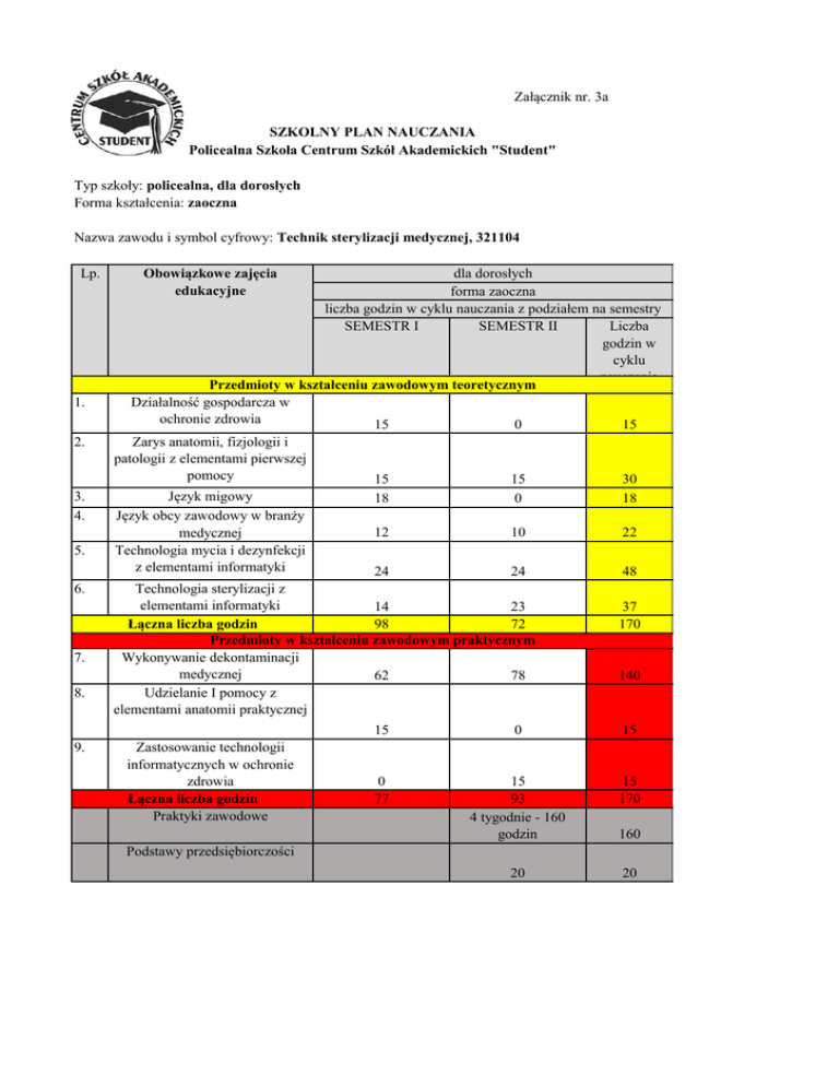 Załącznik nr. 3a SZKOLNY PLAN NAUCZANIA Policealna Szkoła Centrum Szkół Akademickich "Student" Typ szkoły: policealna, dla dorosłych Forma kształcenia: zaoczna Nazwa zawodu i symbol cyfrowy: Technik sterylizacji medycznej, 321104 Lp. 1. 2. 3. 4. 5. 6. 7. 8. 9. dla dorosłych forma zaoczna liczba godzin w cyklu nauczania z podziałem na semestry SEMESTR I SEMESTR II Liczba godzin w cyklu nauczania Przedmioty w kształceniu zawodowym teoretycznym Działalność gospodarcza w ochronie zdrowia 15 0 15 Obowiązkowe zajęcia edukacyjne Zarys anatomii, fizjologii i patologii z elementami pierwszej pomocy Język migowy Język obcy zawodowy w branży medycznej Technologia mycia i dezynfekcji z elementami informatyki 15 18 15 0 30 18 12 10 22 24 24 Technologia sterylizacji z elementami informatyki 14 23 Łączna liczba godzin 98 72 Przedmioty w kształceniu zawodowym praktycznym Wykonywanie dekontaminacji medycznej 62 78 Udzielanie I pomocy z elementami anatomii praktycznej Zastosowanie technologii informatycznych w ochronie zdrowia Łączna liczba godzin Praktyki zawodowe 48 37 170 140 15 0 15 0 77 15 93 4 tygodnie - 160 godzin 15 170 20 20 160 Podstawy przedsiębiorczości