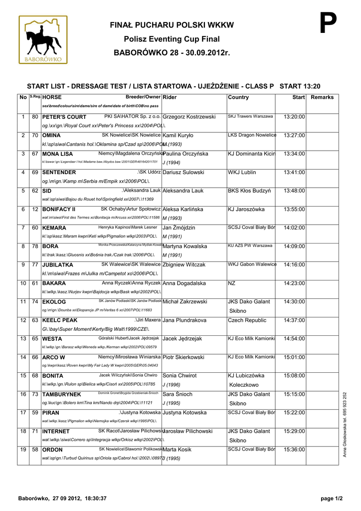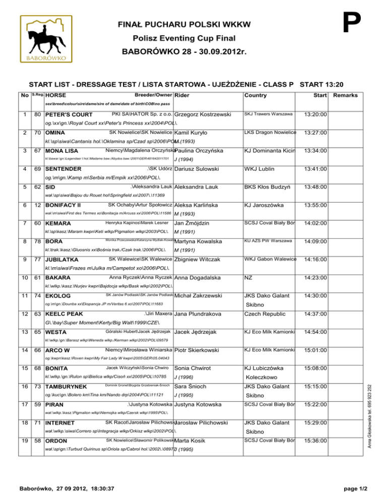 P FINAŁ PUCHARU POLSKI WKKW Polisz Eventing Cup Final BABORÓWKO 28 - 30.09.2012r. START LIST - DRESSAGE TEST / LISTA STARTOWA - UJEŻDŻENIE - CLASS P START 13:20 No S.Reg. Breeder/Owner Rider HORSE Country Start Remarks sex\breed\colour\sire\dame/sire of dame\date of birth\COB\no pass 1 80 PETER'S COURT PKI SA\HATOR Sp. z o.o. Grzegorz Kostrzewski SKJ Trawers Warszawa 13:20:00 LKS Dragon Nowielice 13:27:00 KJ Dominanta Kicin 13:34:00 WKJ Lublin 13:41:00 BKS Kłos Budzyń 13:48:00 KJ Jaroszówka 13:55:00 SCSJ Coval Biały Bór 14:02:00 KU AZS PW Warszawa 14:09:00 WKJ Gabon Walewice 14:16:00 NZ 14:23:00 JKS Dako Galant 14:30:00 og.\xx\gn.\Royal Court xx\Peter's Princess xx\2004\POL\. 2 70 OMINA SK Nowielice\SK Nowielice Kamil Kuryło kl.\sp\siwa\Cantanis hol.\Oklamina sp/Czad sp\2006\POL\. M (1993) 3 67 MONA LISA Niemcy\Magdalena OrczyńskaPaulina Orczyńska kl.\bawar.\gn.\Legendaer I hol.\Madame baw./Abydos baw.\2001\GER\481642011701 4 J (1994) .\SK Udórz Dariusz Sulowski 69 SENTENDER og.\m\gn.\Kamp m\Serbia m/Empik xx\2006\POL\. 5 .\Aleksandra Lauk Aleksandra Lauk 62 SID wał.\sp\siwa\Bajou du Rouet hol\Springfield xx\2007\.\11369 6 12 BONIFACY II SK Ochaby\Artur Społowicz Aleksa Karlińska wał.\m\siwa\First des Termes xo\Bonitacja m/Arcuss xx\2006\POL\11586 7 60 KEMARA Henryka Kapinos\Marek Lesner kl.\sp\kasz.\Maram kwpn\Keti wlkp/Pigmalion wlkp\2003\POL\. 8 78 BORA 77 JUBILATKA Jan Żmójdzin M (1991) Monika Przeczewska\Katarzyna Mydlak-Kowalsk Martyna Kowalska kl.\trak.\kasz.\Gluosnis xx\Bośnia trak./Czak trak.\2006\POL\. 9 M (1993) M (1991) SK Walewice\SK Walewice Zbigniew Witczak kl.\m\siwa\Frazes m\Julka m/Campetot xo\2006\POL\. 10 61 BAKARA Anna Ryczek\Anna Ryczek Anna Dogadalska kl.\wlkp.\kasz.\Nurjev kwpn\Bajdocja wlkp/Bask wlkp\2002\POL\. 11 74 EKOLOG SK Janów Podlaski\SK Janów Podlaski Michał Zakrzewski og.\m\gn.\Dounba xx\Ekspancja JP m/Veritas 6 xo\2007\POL\11683 12 Skibno .\Jiri Maxera Jana Plundrakova 63 KEELC PEAK Czech Republic 14:37:00 KJ Eco Milk Kamionki 14:54:00 KJ Eco Milk Kamionki 15:01:00 KJ Lubiczówka 15:08:00 G\.\bay\Super Moment\Kerty/Big Walt\1999\CZE\. 13 65 WESTA Góralski Hubert\Jacek Jędrzejak Jacek Jędrzejak kl.\wlkp.\gn.\Barasz wlkp\Weneda wlkp./Kerman wlkp\2002\POL\09579 14 66 ARCO W Niemcy\Mirosława Winiarska Piotr Skierkowski og.\kwpn\kasz.\Roven kwpn\My Fair Lady W kwpn\2005\GER\05.04043 68 BONITA Jacek Wilczyński\Sonia Chwiro kl.\wlkp.\gn.\Rulon sp\Bielica wlkp/Cisoń xx\2005\POL\10785 16 73 TAMBURYNEK Dominik Gronet\Brygida Grzebieniak-Śnioch og.\kuc\gn.\Bolero km\Tina km/Nando drp\2004\POL\11121 17 Sonia Chwirot J (1996) Sara Śnioch J (1995) .\Justyna Kotowska Justyna Kotowska 59 PIRAN Koleczkowo JKS Dako Galant 15:15:00 Anna Głoskowska tel. 695 923 252 15 Skibno SCSJ Coval Biały Bór 15:22:00 JKS Dako Galant 15:29:00 wał.\wlkp.\kasz.\Pigmalion wlkp\Niemojka wlkp/Czersk wlkp\1995\POL\. 18 71 INTERNET SK Racot\Jarosław PilichowskiJarosław Pilichowski wał.\wlkp.\siwa\Correro sp\Integracja wlkp/Orkisz wlkp\2002\POL\. 19 58 ORDON SK Nowielice\Sławomir PolikowskiMarta Skibno Kosik SCSJ Coval Biały Bór 15:36:00 wał.\sp\gn.\Turbud Quirinus sp\Oriola sp/Cabrol hol.\2002\.\08977J (1995) Baborówko, 27 09 2012, 18:30:37 page 1/2 START LIST - DRESSAGE TEST / LISTA STARTOWA - UJEŻDŻENIE - CLASS P START 13:20 No S.Reg. Breeder/Owner Rider HORSE Country Start Remarks 20 64 RODEZJA Agnieszka Knap\Agnieszka Knap Wiktoria Knap ZKS Drzonków 15:43:00 SKJ Sopot 15:50:00 JKS Dako Galant 15:57:00 Anna Głoskowska tel. 695 923 252 sex\breed\colour\sire\dame/sire of dame\date of birth\COB\no pass kl.\sp\gn.\Samurai M kwpn\Reja sp/Barbur sp\2005\POL\. JM (1999) 21 75 BRANDY Adam Najdek\Krzysztof Karolkiewicz Katarzyna Kokowska kl.\m\gn.\Bobinski xx\Biebrza m/Sebastian m\2005\POL\. 22 72 ELABORAT SK Janów Podlaski\SK Janów Podlaski Paweł Spisak og.\xo\c.gn.\Aspan m\Elandra m/Decoration xo\2006\POL\. 23 79 AMURAT Marlena Kordalska\Grzegorz Kostrzewski Grzegorz Skibno Kostrzewski SKJ Trawers Warszawa 16:04:00 og.\m\sk.gn.\Jurand m\Asturia m/Lubań m\2007\POL\11383 Baborówko, 27 09 2012, 18:30:37 page 2/2