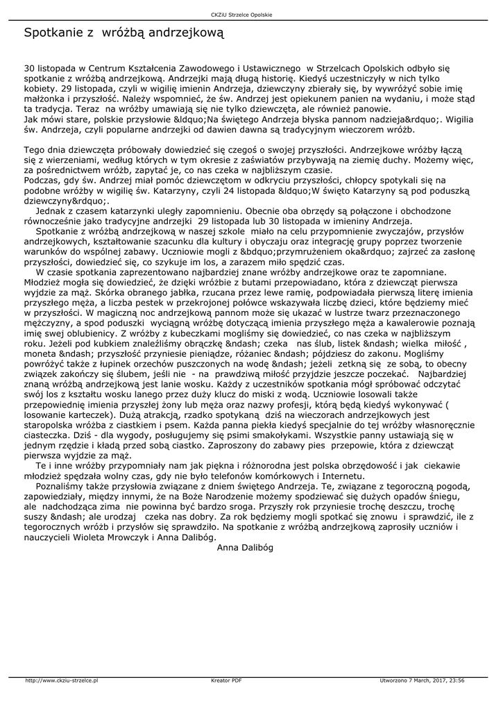 CKZiU Strzelce Opolskie Spotkanie z wróżbą andrzejkową 30 listopada w Centrum Kształcenia Zawodowego i Ustawicznego w Strzelcach Opolskich odbyło się spotkanie z wróżbą andrzejkową. Andrzejki mają długą historię. Kiedyś uczestniczyły w nich tylko kobiety. 29 listopada, czyli w wigilię imienin Andrzeja, dziewczyny zbierały się, by wywróżyć sobie imię małżonka i przyszłość. Należy wspomnieć, że św. Andrzej jest opiekunem panien na wydaniu, i może stąd ta tradycja. Teraz na wróżby umawiają się nie tylko dziewczęta, ale również panowie. Jak mówi stare, polskie przysłowie “Na świętego Andrzeja błyska pannom nadzieja”. Wigilia św. Andrzeja, czyli popularne andrzejki od dawien dawna są tradycyjnym wieczorem wróżb. Tego dnia dziewczęta próbowały dowiedzieć się czegoś o swojej przyszłości. Andrzejkowe wróżby łączą się z wierzeniami, według których w tym okresie z zaświatów przybywają na ziemię duchy. Możemy więc, za pośrednictwem wróżb, zapytać je, co nas czeka w najbliższym czasie. Podczas, gdy św. Andrzej miał pomóc dziewczętom w odkryciu przyszłości, chłopcy spotykali się na podobne wróżby w wigilię św. Katarzyny, czyli 24 listopada “W święto Katarzyny są pod poduszką dziewczyny”. Jednak z czasem katarzynki uległy zapomnieniu. Obecnie oba obrzędy są połączone i obchodzone równocześnie jako tradycyjne andrzejki 29 listopada lub 30 listopada w imieniny Andrzeja. Spotkanie z wróżbą andrzejkową w naszej szkole miało na celu przypomnienie zwyczajów, przysłów andrzejkowych, kształtowanie szacunku dla kultury i obyczaju oraz integrację grupy poprzez tworzenie warunków do wspólnej zabawy. Uczniowie mogli z „przymrużeniem oka” zajrzeć za zasłonę przyszłości, dowiedzieć się, co szykuje im los, a zarazem miło spędzić czas. W czasie spotkania zaprezentowano najbardziej znane wróżby andrzejkowe oraz te zapomniane. Młodzież mogła się dowiedzieć, że dzięki wróżbie z butami przepowiadano, która z dziewcząt pierwsza wyjdzie za mąż. Skórka obranego jabłka, rzucana przez lewe ramię, podpowiadała pierwszą literę imienia przyszłego męża, a liczba pestek w przekrojonej połówce wskazywała liczbę dzieci, które będziemy mieć w przyszłości. W magiczną noc andrzejkową pannom może się ukazać w lustrze twarz przeznaczonego mężczyzny, a spod poduszki wyciągną wróżbę dotyczącą imienia przyszłego męża a kawalerowie poznają imię swej oblubienicy. Z wróżby z kubeczkami mogliśmy się dowiedzieć, co nas czeka w najbliższym roku. Jeżeli pod kubkiem znaleźliśmy obrączkę – czeka nas ślub, listek – wielka miłość , moneta – przyszłość przyniesie pieniądze, różaniec – pójdziesz do zakonu. Mogliśmy powróżyć także z łupinek orzechów puszczonych na wodę – jeżeli zetkną się ze sobą, to obecny związek zakończy się ślubem, jeśli nie - na prawdziwą miłość przyjdzie jeszcze poczekać. Najbardziej znaną wróżbą andrzejkową jest lanie wosku. Każdy z uczestników spotkania mógł spróbować odczytać swój los z kształtu wosku lanego przez duży klucz do miski z wodą. Uczniowie losowali także przepowiednię imienia przyszłej żony lub męża oraz nazwy profesji, którą będą kiedyś wykonywać ( losowanie karteczek). Dużą atrakcją, rzadko spotykaną dziś na wieczorach andrzejkowych jest staropolska wróżba z ciastkiem i psem. Każda panna piekła kiedyś specjalnie do tej wróżby własnoręcznie ciasteczka. Dziś - dla wygody, posługujemy się psimi smakołykami. Wszystkie panny ustawiają się w jednym rzędzie i kładą przed sobą ciastko. Zaproszony do zabawy pies przepowie, która z dziewcząt pierwsza wyjdzie za mąż. Te i inne wróżby przypomniały nam jak piękna i różnorodna jest polska obrzędowość i jak ciekawie młodzież spędzała wolny czas, gdy nie było telefonów komórkowych i Internetu. Poznaliśmy także przysłowia związane z dniem świętego Andrzeja. Te, związane z tegoroczną pogodą, zapowiedziały, między innymi, że na Boże Narodzenie możemy spodziewać się dużych opadów śniegu, ale nadchodząca zima nie powinna być bardzo sroga. Przyszły rok przyniesie trochę deszczu, trochę suszy – ale urodzaj czeka nas dobry. Za rok będziemy mogli spotkać się znowu i sprawdzić, ile z tegorocznych wróżb i przysłów się sprawdziło. Na spotkanie z wróżbą andrzejkową zaprosiły uczniów i nauczycieli Wioleta Mrowczyk i Anna Dalibóg. Anna Dalibóg http://www.ckziu-strzelce.pl Kreator PDF Utworzono 7 March, 2017, 23:56