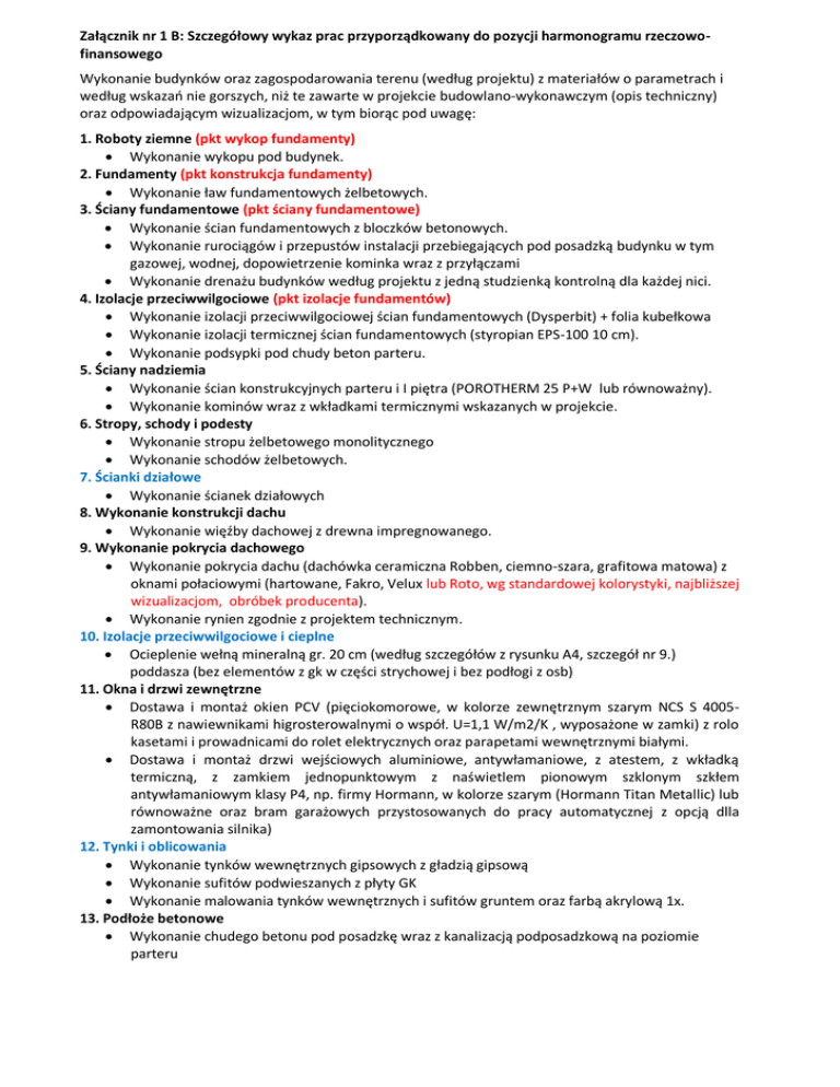 Załącznik nr 1 B: Szczegółowy wykaz prac przyporządkowany do pozycji harmonogramu rzeczowofinansowego Wykonanie budynków oraz zagospodarowania terenu (według projektu) z materiałów o parametrach i według wskazań nie gorszych, niż te zawarte w projekcie budowlano-wykonawczym (opis techniczny) oraz odpowiadającym wizualizacjom, w tym biorąc pod uwagę: 1. Roboty ziemne (pkt wykop fundamenty) Wykonanie wykopu pod budynek. 2. Fundamenty (pkt konstrukcja fundamenty) Wykonanie ław fundamentowych żelbetowych. 3. Ściany fundamentowe (pkt ściany fundamentowe) Wykonanie ścian fundamentowych z bloczków betonowych. Wykonanie rurociągów i przepustów instalacji przebiegających pod posadzką budynku w tym gazowej, wodnej, dopowietrzenie kominka wraz z przyłączami Wykonanie drenażu budynków według projektu z jedną studzienką kontrolną dla każdej nici. 4. Izolacje przeciwwilgociowe (pkt izolacje fundamentów) Wykonanie izolacji przeciwwilgociowej ścian fundamentowych (Dysperbit) + folia kubełkowa Wykonanie izolacji termicznej ścian fundamentowych (styropian EPS-100 10 cm). Wykonanie podsypki pod chudy beton parteru. 5. Ściany nadziemia Wykonanie ścian konstrukcyjnych parteru i I piętra (POROTHERM 25 P+W lub równoważny). Wykonanie kominów wraz z wkładkami termicznymi wskazanych w projekcie. 6. Stropy, schody i podesty Wykonanie stropu żelbetowego monolitycznego Wykonanie schodów żelbetowych. 7. Ścianki działowe Wykonanie ścianek działowych 8. Wykonanie konstrukcji dachu Wykonanie więźby dachowej z drewna impregnowanego. 9. Wykonanie pokrycia dachowego Wykonanie pokrycia dachu (dachówka ceramiczna Robben, ciemno-szara, grafitowa matowa) z oknami połaciowymi (hartowane, Fakro, Velux lub Roto, wg standardowej kolorystyki, najbliższej wizualizacjom, obróbek producenta). Wykonanie rynien zgodnie z projektem technicznym. 10. Izolacje przeciwwilgociowe i cieplne Ocieplenie wełną mineralną gr. 20 cm (według szczegółów z rysunku A4, szczegół nr 9.) poddasza (bez elementów z gk w części strychowej i bez podłogi z osb) 11. Okna i drzwi zewnętrzne Dostawa i montaż okien PCV (pięciokomorowe, w kolorze zewnętrznym szarym NCS S 4005R80B z nawiewnikami higrosterowalnymi o współ. U=1,1 W/m2/K , wyposażone w zamki) z rolo kasetami i prowadnicami do rolet elektrycznych oraz parapetami wewnętrznymi białymi. Dostawa i montaż drzwi wejściowych aluminiowe, antywłamaniowe, z atestem, z wkładką termiczną, z zamkiem jednopunktowym z naświetlem pionowym szklonym szkłem antywłamaniowym klasy P4, np. firmy Hormann, w kolorze szarym (Hormann Titan Metallic) lub równoważne oraz bram garażowych przystosowanych do pracy automatycznej z opcją dlla zamontowania silnika) 12. Tynki i oblicowania Wykonanie tynków wewnętrznych gipsowych z gładzią gipsową Wykonanie sufitów podwieszanych z płyty GK Wykonanie malowania tynków wewnętrznych i sufitów gruntem oraz farbą akrylową 1x. 13. Podłoże betonowe Wykonanie chudego betonu pod posadzkę wraz z kanalizacją podposadzkową na poziomie parteru 14. Podłogi i posadzki Wykonanie posadzek wewnętrznych z izolacją termiczną tak jak w projekcie rys. A4, szczegół nr 6 na parterze oraz na piętrze według przekroju nr 8 (bez warstw wykończeniowych terakota panele itp.). 15. Elewacje Wykonanie podbitki z PCV w kolorze drewnopodobnym Wykonanie elewacji budynku w kolorystyce z P.B. oraz wizualizacji – struktura Baranek 2 mm.docieplenie styropian gr. 15 cm oraz elewacji z płytek klinkierowych według projektu oraz wizualizacji – te same płytki dla całego Obiektu. Montaż parapetów zewnętrznych z blachy powlekanej. Montaż portfenetrów (barierek zaokiennych) malowanych proszkowo w kolorze białego aluminium RAL 9006 (według wizualizacji do ustalenia przed montażem) Wykonanie cokołu budynku – docieplenie styropian gr. 15 cm, płytki ceramiczne według projektu budowlano-wykonawczego oraz wizualizacji Wykonanie rur spustowych wraz z odprowadzeniami według opisu technicznego projektu Kominy – obłożone będą tynkiem strukturalnym. 16. Różne roboty zewnętrzne Wykonanie tarasów na gruncie z kostki betonowej szarej gr. 8 cm. Wykonanie lekkich przegród tarasowych według projektu. 17. Instalacje elektryczne – przyłącze Wykonanie przyłącza elektrycznego 18. Instalacje elektryczne – okablowanie Wykonanie instalacji elektrycznej wewnętrznej Wykonanie instalacji TV (w każdym pokoju antena kablowa, wszystkie łączące się na strychu oraz miejsce do przymocowania anteny na dachu), domofonowej i internetowej (w każdym pokoju podejście) Wykonanie okablowania instalacji alarmowej według obowiązujących standardów 19. Instalacje elektryczne – osprzęt Montaż osprzętu elektrycznego – skrzynka bezpiecznikowa z wyposażeniem, włączniki 3 szt. 20. Instalacje sanitarne – orurowanie Wykonanie instalacji do przyszłego zamontowania solarów na dachu (bez ogniw i zasobnika) Wykonanie instalacji wodno-kanalizacyjnej ( bez osprzętu, montaż dwóch kranów do wody ogrodowej z dwóch stron domu) Wykonanie instalacji C.O. w budynku, w tym ogrzewania podłogowego we wszystkich łazienkach oraz kuchni. WYKONANIE INSTALACJI ODKURZACZA CENTRALNEGO – na etapie stanu surowego zamkniętego zostanie wykonane przez i na koszt Inwestora. 21. Instalacje sanitarne – osprzęt Montaż grzejników panelowych (nie Purmo) w pokojach oraz rozdzielacze 22. Instalacje sanitarne – Szambo Wykonanie kanalizacji sanitarnej zewnętrznej ze zbiornikami bezodpływowymi. 23. Zagospodarowanie terenu Wykonanie kanalizacji deszczowej ze studniami chłonnymi. Wykonanie ogrodzenia z siatki czarnej powlekanej o wys. 1,5 m ze słupkami stalowymi czarnymi ze ścianką na liczniki i konstrukcją ze śmietnikiem lub płot systemowy czarny o podobnych parametrach. Wykonanie drogi wewnętrznej oraz podjazdów do garaży z płyt ażurowych typu MEBA i dojść do budynku z kostki betonowej gr. 8 cm , kolor szary. 