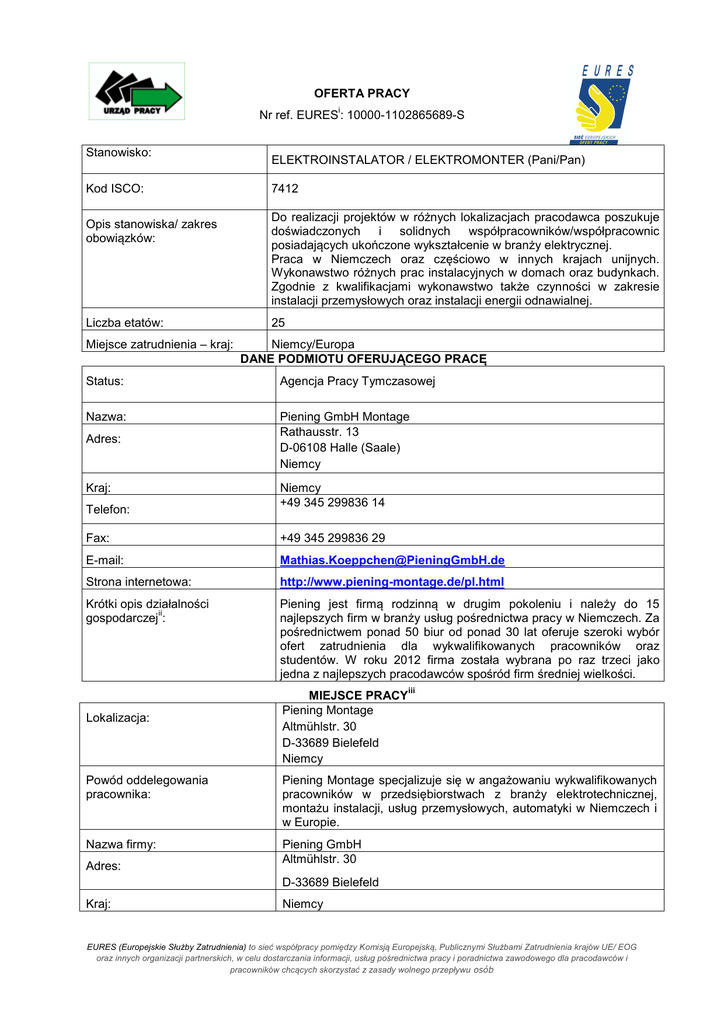 OFERTA PRACY i Nr ref. EURES : 10000-1102865689-S Stanowisko: Kod ISCO: Opis stanowiska/ zakres obowiązków: Liczba etatów: Miejsce zatrudnienia – kraj: ELEKTROINSTALATOR / ELEKTROMONTER (Pani/Pan) 7412 Do realizacji projektów w różnych lokalizacjach pracodawca poszukuje doświadczonych i solidnych współpracowników/współpracownic posiadających ukończone wykształcenie w branży elektrycznej. Praca w Niemczech oraz częściowo w innych krajach unijnych. Wykonawstwo różnych prac instalacyjnych w domach oraz budynkach. Zgodnie z kwalifikacjami wykonawstwo także czynności w zakresie instalacji przemysłowych oraz instalacji energii odnawialnej. 25 Niemcy/Europa DANE PODMIOTU OFERUJĄCEGO PRACĘ Status: Agencja Pracy Tymczasowej Nazwa: Piening GmbH Montage Rathausstr. 13 D-06108 Halle (Saale) Niemcy Adres: Kraj: Telefon: Niemcy +49 345 299836 14 Fax: +49 345 299836 29 E-mail: [email protected] Strona internetowa: http://www.piening-montage.de/pl.html Krótki opis działalności ii gospodarczej : Piening jest firmą rodzinną w drugim pokoleniu i należy do 15 najlepszych firm w branży usług pośrednictwa pracy w Niemczech. Za pośrednictwem ponad 50 biur od ponad 30 lat oferuje szeroki wybór ofert zatrudnienia dla wykwalifikowanych pracowników oraz studentów. W roku 2012 firma została wybrana po raz trzeci jako jedna z najlepszych pracodawców spośród firm średniej wielkości. Lokalizacja: MIEJSCE PRACY Piening Montage Altmühlstr. 30 D-33689 Bielefeld Niemcy iii Powód oddelegowania pracownika: Piening Montage specjalizuje się w angażowaniu wykwalifikowanych pracowników w przedsiębiorstwach z branży elektrotechnicznej, montażu instalacji, usług przemysłowych, automatyki w Niemczech i w Europie. Nazwa firmy: Piening GmbH Altmühlstr. 30 Adres: D-33689 Bielefeld Kraj: Niemcy EURES (Europejskie Służby Zatrudnienia) to sieć współpracy pomiędzy Komisją Europejską, Publicznymi Służbami Zatrudnienia krajów UE/ EOG oraz innych organizacji partnerskich, w celu dostarczania informacji, usług pośrednictwa pracy i poradnictwa zawodowego dla pracodawców i pracowników chcących skorzystać z zasady wolnego przepływu osób WYMAGANIA Wykształcenie: Wymagane wykształcenie w branży elektrotechnicznej. Doświadczenie zawodowe: Mile widziane. Znajomość języków: Język 1. język niemiecki Poziom 1. B1 W przypadku braku znajomości języka istnieje możliwość uczestnictwa w kursie języka niemieckiego przed rozpoczęciem zatrudnienia spełniając określone kryteria kwalifikacji. Uprawnienia/ dyplomy/ dokumenty (np. prawo jazdy): Inne istotne wymagania: Świadectwa, certyfikaty potwierdzające wykształcenie, uprawnienia SEP. Gotowość do nauki języka niemieckiego. WYNAGRODZENIE I WARUNKI ZATRUDNIENIA Wysokość pensji brutto: Atrakcyjne wynagrodzenie zgodnie z taryfikatorami iGZ (Izba branżowa zrzeszająca agencje pracy tymczasowej w Niemczech) /DGB (Niemieckie Zrzeszenie Związków Zawodowych) stosownie do posiadanych kwalifikacji od 10,61 Euro na godzinę brutto, jak również wyrównanie w wysokości 40 Euro na dzień roboczy. Wysokość pensji netto: Waluta, w jakiej wypłacana jest pensja: Euro. Rodzaj stawki wynagrodzenia: Miesięcznie Premie: Możliwe premie, 25% za pracę w nadgodzinach, 25% za pracę w nocy, 50% za pracę w niedziele, 100% za pracę w święta, wynagrodzenie przysługujące za okres świąt oraz urlopu. Dodatkowe świadczenia W przypadku pracy jako monter należy liczyć się z podróżami służbowymi po Niemczech oraz po Europie. Podczas podróży służbowych pracodawca oferuje zakwaterowanie w Niemczech lub zagranicą, przeloty lub wynajem samochodu. Ponadto pracodawca zabezpiecza bezpłatnie ubranie robocze, środki ochrony osobistej oraz środek transportu. Nazwa firmy, z którą zostanie podpisana umowa: Piening GmbH Rodzaj umowy: Umowa o pracę. (umowa o pracę, umowa zlecenia, wolontariat, praktyka zawodowa/ staż, praca zdalna, agencja pracy tymczasowej, inne): Wymiar czasu pracy (praca na pełen etat/ część etatu): Pełny etat. Czas trwania umowy: Umowa na czas nieokreślony. (nieokreślony/ określony) Data wygaśnięcia umowy (w przypadku umowy na czas określony): - EURES (Europejskie Służby Zatrudnienia) to sieć współpracy pomiędzy Komisją Europejską, Publicznymi Służbami Zatrudnienia krajów UE/ EOG oraz innych organizacji partnerskich, w celu dostarczania informacji, usług pośrednictwa pracy i poradnictwa zawodowego dla pracodawców i pracowników chcących skorzystać z zasady wolnego przepływu osób Liczba godzin tygodniowo: Minimum 35 godzin tygodniowo. Co do zasady między 40 a 50 godzin tygodniowo. Ewentualnie możliwa praca w soboty. Zmiany i praca w dni wolne: Według zapotrzebowania. Data rozpoczęcia: Od 01.04.2014 r. lub wcześniej. W Piening Montage do dyspozycji są pracownicy mówiący w języku polskim. Na stronie internetowej http://www.pieningmontage.de/pl.html dostępne są dodatkowe informacje o przedsiębiorstwie w języku polskim oraz niemieckim. Pracodawca pomaga w: − przyjeździe do Niemiec, − poszukiwaniu zakwaterowania, − otwarciu konta bankowego, − zgłoszeniu w urzędzie skarbowym, − organizacji karty podatkowej oraz zasiłku na dzieci, − doradztwie przy ubezpieczeniu zdrowotnym własnym oraz rodziny, − doskonaleniu zawodowym. Inne informacje: SPOSÓB SKŁADANIA WNIOSKU Wymagane dokumenty (list motywacyjny, CV itp.): CV oraz inne dokumenty potwierdzające posiadane kwalifikacje (np. świadectwa) należy przesyłać mailem. Język, w którym muszą być sporządzone przedkładane dokumenty: Do kogo należy wysłać dokumenty: (do pracodawcy/ doradcy EURES) Gdzie należy wysłać dokumenty: (adres, adres e-mail, nr faksu z kodem kraju itp.) Dane teleadresowe doradcy EURES lub przedstawiciela pracodawcy: (nazwisko, adres, telefon, fax, e-mail itp.) Niemiecki lub polski. Data publikacji: Do pracodawcy Na adres e-mail: [email protected] podając w tytule wia