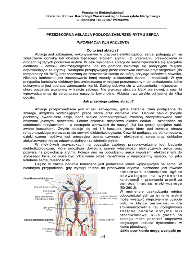 Pracownia Elektrofizjologii I Katedra i Klinika Kardiologii Warszawskiego Uniwersytetu Medycznego ul. Banacha 1a; 02-097 Warszawa ______________________________________________________________________________ PRZEZSKÓRNA ABLACJA PODŁOŻA ZABURZEŃ RYTMU SERCA INFORMACJA DLA PACJENTA Co to jest ablacja? Ablacja jest zabiegiem, wykonywanym w pracowni elektrofizjologii serca, polegającym na zniszczeniu ogniska lub obszaru będącego źródłem arytmii lub przerwaniu przewodzenia w drogach będących podłożem arytmii. W celu wykonania ablacji do serca wprowadza się specjalne elektrody – cewniki elektrofizjologiczne. Za ich pomocą lokalizuje się precyzyjnie miejsce odpowiadające za arytmię. Następnie przepływający przez końcówkę cewnika prąd rozgrzewa (do temperatury 48-70oC) przeznaczoną do zniszczenia tkankę do której przylega końcówka cewnika. Niekiedy konieczne jest zastosowanie innej metody uszkadzania tkanek – krioablacji. W tym przypadku końcówka elektrody jest umieszczana w miejscu przeznaczonym do uszkodzenia, które dokonywane jest poprzez zamrażanie tkanki. Zabieg odbywa się w znieczuleniu miejscowym – chory pozostaje przytomny w trakcie zabiegu. Nie wymaga otwarcia klatki piersiowej, a cewniki wprowadzane są do serca przez naczynia krwionośne. Ablacja trwa zwykle od jednej do kilku godzin. Jak przebiega zabieg ablacji? Ablacja przeprowadzana jest w sali zabiegowej, gdzie zostanie Pan/i podłączona do szeregu urządzeń kontrolujących pracę serca oraz ciśnienie krwi. Okolice nakłuć (zwykle pachwiny, ewentualnie szyja, bądź okolice podobojczykowe) zostaną zdezynfekowane oraz obłożone jałowymi serwetami. Lekarz znieczuli miejscowo okolice nakłuć – oznaczone na schemacie strzykawkami – a następnie wprowadzi do naczyń (żył lub tętnic) specjalne rurki, zwane koszulkami. Zwykle stosuje się od 1-5 koszulek, przez które pod kontrolą obrazu rentgenowskiego wprowadza się cewniki elektrofizjologiczne. Cewniki podłącza się do komputera, dzięki czemu możliwa jest precyzyjna ocena czynności elektrycznej serca oraz dokładne zlokalizowanie miejsc odpowiedzialnych za istnienie arytmii. W niektórych przypadkach na początku zabiegu przeprowadzane jest badanie elektrofizjologiczne, które umożliwia dokładną ocenie właściwości elektrycznych serca oraz pozwala na prowokację arytmii. Polega ono na pobudzaniu serca impulsami elektrycznymi do szybszego bicia, co może być odczuwane przez Pana/Panią w nieprzyjemny sposób, np. jako kołatanie serca, duszność itp. Często w trakcie badania konieczne jest podawanie leków wpływających na serce. W niektórych przypadkach, gdy wystąpi trudna do przerwania arytmia, niezbędne jest również krótkotrwałe znieczulenie ogólne pozwalające na wykonanie Cewniki elektrofizjologiczne kardiowersji – przerwania arytmii za pomocą impulsu elektrycznego (50-360 J). W momencie uszkadzania miejsc odpowiedzialnych za istnienie arytmii może wystąpić nieprzyjemne uczucie bólu w klatce piersiowej – dla zminimalizowania tej dolegliwości zostaną podane dożylne leki przeciwbólowe. Kilka godzin po zabiegu może pozostać stopniowo Cewniki elektrofizjologiczne ustępujące uczucie dyskomfortu w klatce piersiowej. Jakie powikłania mogą wystąpić po —!1/!4— Pracownia Elektrofizjologii I Katedra i Klinika Kardiologii Warszawskiego Uniwersytetu Medycznego ul. Banacha 1a; 02-097 Warszawa ______________________________________________________________________________ ablacji ? W czasie zabiegu lub kilkanaście godzin po nim w miejscach wprowadzenia cewników elektrofizjologicznych istnieje ryzyko wystąpienia krwiaka, przetoki tętniczo-żylnej lub tętniaka rzekomego. Ilość krwi, która przedostanie się z naczyń do otaczających tkanek może być tak duża, że konieczne będzie przetoczenie krwi lub preparatów krwiozastępczych. Wprowadzenie cewników elektrofizjologicznych do serca niesie ze sobą ryzyko przebicia serca lub aorty, gromadzenia się krwi wokół serca, bądź uszkodzenia zastawek serca. Zazwyczaj goi się to samoistnie, ale w rzadkich przypadkach wymaga zabiegu kardiochirurgicznego (z otwarciem klatki piersiowej). Ryzyko takich powikłań, w tym dodatkowo przetoki sercowoprzełykowej oraz zwężenia żył płucnych, jest nieco wyższe u chorych poddawanych ablacji żył płucnych. Innym powikłaniem jest uszkodzenie naturalnego układu elektrycznego serca. Niekiedy wymaga to wszczepienia na stałe układu stymulującego serce (tzw. rozrusznika serca). U chorych przygotowywanych do ablacji łącza przedsionkowo-komorowego uprzednio wszczepia się sztuczny rozrusznik serca na stałe. U niewielkiego odsetka tych chorych może dojść do pogorszenia wydolności krążenia, co wymaga korekty leczenia farmakologicznego lub zmiany trybu stymulacji poprzez odszczepienie dodatkowej elektrody. Ze względu na wytwarzanie wysokiej temperatury w układzie krwionośnym na końcówce cewnika lub ścianie serca może powstać skrzeplina. Tworzeniu skrzepliny przeciwdziała podawana w trakcie zabiegu heparyna, która jednak zwiększa ryzyko krwawień. Mimo to, bardzo rzadko może zdarzyć się, że skrzeplina spowoduje udar mózgu, zawał serca lub uszkodzenie innych organów. Ryzyko zatoru obwodowego jest większe u pacjentów z wszczepionymi sztucznymi zastawkami serca zwłaszcza zastawką mitralną. Zgon jako następstwo powikłań po zabiegu ablacji zdarza się bardzo rzadko, choć w przypadku ablacji pozawałowych częstoskurczów komorowych, zwłaszcza niestabilnych hemodynamicznie może wystąpić u 2,7%. U pacjentów z implantowanym kardiowerterem (ICD) podczas ablacji częstoskurczów komorowych, może zajść potrzeba interwencji z defibrylatora lub wykonania kardiowersji defibrylacji zewnętrznej, wykonania koronarografii w trybie pilnym lub przy pogarszaniu się stanu hemodynamicznego pacjenta założenie balonu wewnątrzaortalnego. Po ablacji istnieje niewielkie ryzyk