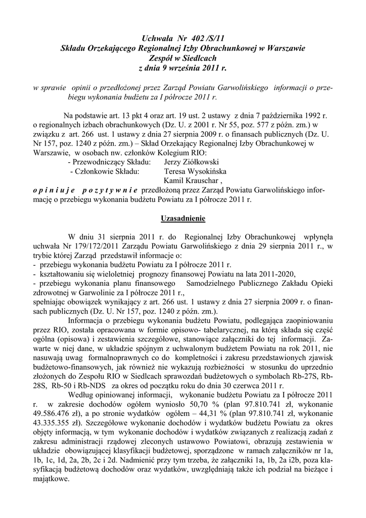 Uchwała Nr 402 /S/11 Składu Orzekającego Regionalnej Izby Obrachunkowej w Warszawie Zespół w Siedlcach z dnia 9 września 2011 r. w sprawie opinii o przedłożonej przez Zarząd Powiatu Garwolińskiego informacji o przebiegu wykonania budżetu za I półrocze 2011 r. Na podstawie art. 13 pkt 4 oraz art. 19 ust. 2 ustawy z dnia 7 października 1992 r. o regionalnych izbach obrachunkowych (Dz. U. z 2001 r. Nr 55, poz. 577 z późn. zm.) w związku z art. 266 ust. 1 ustawy z dnia 27 sierpnia 2009 r. o finansach publicznych (Dz. U. Nr 157, poz. 1240 z późn. zm.) – Skład Orzekający Regionalnej Izby Obrachunkowej w Warszawie, w osobach nw. członków Kolegium RIO: - Przewodniczący Składu: Jerzy Ziółkowski - Członkowie Składu: Teresa Wysokińska Kamil Krauschar , o p i n i u j e p o z y t y w n i e przedłożoną przez Zarząd Powiatu Garwolińskiego informację o przebiegu wykonania budżetu Powiatu za I półrocze 2011 r. Uzasadnienie W dniu 31 sierpnia 2011 r. do Regionalnej Izby Obrachunkowej wpłynęła uchwała Nr 179/172/2011 Zarządu Powiatu Garwolińskiego z dnia 29 sierpnia 2011 r., w trybie której Zarząd przedstawił informacje o: - przebiegu wykonania budżetu Powiatu za I półrocze 2011 r. - kształtowaniu się wieloletniej prognozy finansowej Powiatu na lata 2011-2020, - przebiegu wykonania planu finansowego Samodzielnego Publicznego Zakładu Opieki zdrowotnej w Garwolinie za I półrocze 2011 r., spełniając obowiązek wynikający z art. 266 ust. 1 ustawy z dnia 27 sierpnia 2009 r. o finansach publicznych (Dz. U. Nr 157, poz. 1240 z późn. zm.). Informacja o przebiegu wykonania budżetu Powiatu, podlegająca zaopiniowaniu przez RIO, została opracowana w formie opisowo- tabelarycznej, na którą składa się część ogólna (opisowa) i zestawienia szczegółowe, stanowiące załączniki do tej informacji. Zawarte w niej dane, w układzie spójnym z uchwalonym budżetem Powiatu na rok 2011, nie nasuwają uwag formalnoprawnych co do kompletności i zakresu przedstawionych zjawisk budżetowo-finansowych, jak również nie wykazują rozbieżności w stosunku do uprzednio złożonych do Zespołu RIO w Siedlcach sprawozdań budżetowych o symbolach Rb-27S, Rb28S, Rb-50 i Rb-NDS za okres od początku roku do dnia 30 czerwca 2011 r. Według opiniowanej informacji, wykonanie budżetu Powiatu za I półrocze 2011 r. w zakresie dochodów ogółem wyniosło 50,70 % (plan 97.810.741 zł, wykonanie 49.586.476 zł), a po stronie wydatków ogółem – 44,31 % (plan 97.810.741 zł, wykonanie 43.335.355 zł). Szczegółowe wykonanie dochodów i wydatków budżetu Powiatu za okres objęty informacją, w tym wykonanie dochodów i wydatków związanych z realizacją zadań z zakresu administracji rządowej zleconych ustawowo Powiatowi, obrazują zestawienia w układzie obowiązującej klasyfikacji budżetowej, sporządzone w ramach załączników nr 1a, 1b, 1c, 1d, 2a, 2b, 2c i 2d. Nadmienić przy tym trzeba, że załączniki 1a, 1b, 2a i2b, poza klasyfikacją budżetową dochodów oraz wydatków, uwzględniają także ich podział na bieżące i majątkowe. 2 Porównanie odnotowanych ogólnych kwot – dochodów z wydatkami wskazuje, iż gospodarka budżetowa Powiatu, przy zaplanowanym budżecie na poziomie zrównoważonym, przyniosła za minione półrocze dodatni wynik finansowy, tj. nadwyżkę budżetu w wysokości 6.251.121 zł, co znajduje swoje potwierdzenie w sprawozdaniu Rb-NDS. Na osiągnięcie takiego wyniku finansowego miała przede wszystkim wpływ stosunkowo niska realizacja planu wydatków inwestycyjnych (majątkowych), która – jak wskazują dane zamieszczone na str. 15 przedmiotowej informacji – na koniec I półrocza 2011 r. wyniosła 15,53 % (plan 16.345.585 zł, wykonanie 2.537.936 zł), podczas gdy wykonanie planu wydatków bieżących budżetu Powiatu za ten sam okres ukształtowało się na poziomie 50,08 % (plan 81.465.156 zł wykonanie 40.797.419 zł). Na str. 16 informacji wyjaśniono, że „Niski wskaźnik realizacji wydatków inwestycyjnych wynika z tego, że przy realizacji większości zaplanowanych zadań inwestycyjnych, w I półroczu wykonywane były prace przygotowawcze oraz postępowania przetargowe, natomiast realizacja, zakończenie i rozliczenie zadań głównie w II półroczu”. Z wyjaśnieniem tym można się w zasadzie zgodzić, bowiem powszechnie wiadomo, że półroczna realizacja planu wydatków przeznaczonych na zadania inwestycyjne jeszcze nie przesądza o stopniu rocznego wykonania zaplanowanych w budżecie tego rodzaju zadań, zarówno pod względem kasowym, jak i rzeczowym. Bardzo ważnym elementem opiniowanej informacji, który – zdaniem Składu Orzekającego – winien być wzięty pod uwagę przy merytorycznej analizie i ocenie przebiegu wykonania budżetu oraz możliwości finansowych budżetu, są sprawy dotyczące należności i zobowiązań, o których jest mowa na str. 33 i 34 informacji. Z zawartych tam danych wypada odnotować, że na dzień 30 czerwca 2011 r. zobowiązania Powiatu z tytułu zaciągniętych w latach ubiegłych pożyczek i kredytów wynosiły łącznie 18.617.286 zł (zgodnie ze sprawozdaniem Rb-Z o stanie zobowiązań), stanowiąc – jak się okazuje – 37,55 % zrealizowanych w I półroczu 2011 r. dochodów budżetowych Powiatu. Na uwagę zasługuje przy tym fakt, że Zarząd Powiatu w przedstawionej informacji (str. 34) zdecydowanie sygnalizuje, iż w II półroczu będą zaciągane pożyczki i kredyty, co w sytuacji Powiatu nie jest bez znaczenia. Nie stwierdzając istotnych niedociągnięć, Skład Orzekający przedłożoną informację o przebiegu wykonania budżetu Powiatu opiniuje pozytywnie, uznając zarazem , że przedmiotowa informacja może być wykorzystana przez Radę Powiatu w celu dokonania właściwej oceny realizacji budżetu Powiatu za I półrocze 2011 r. Od niniejszej uchwały służy odwołanie do Kolegium Regionalnej Izby Obrachunkowej w Warszawie, ul. Koszykowa 6a, w t