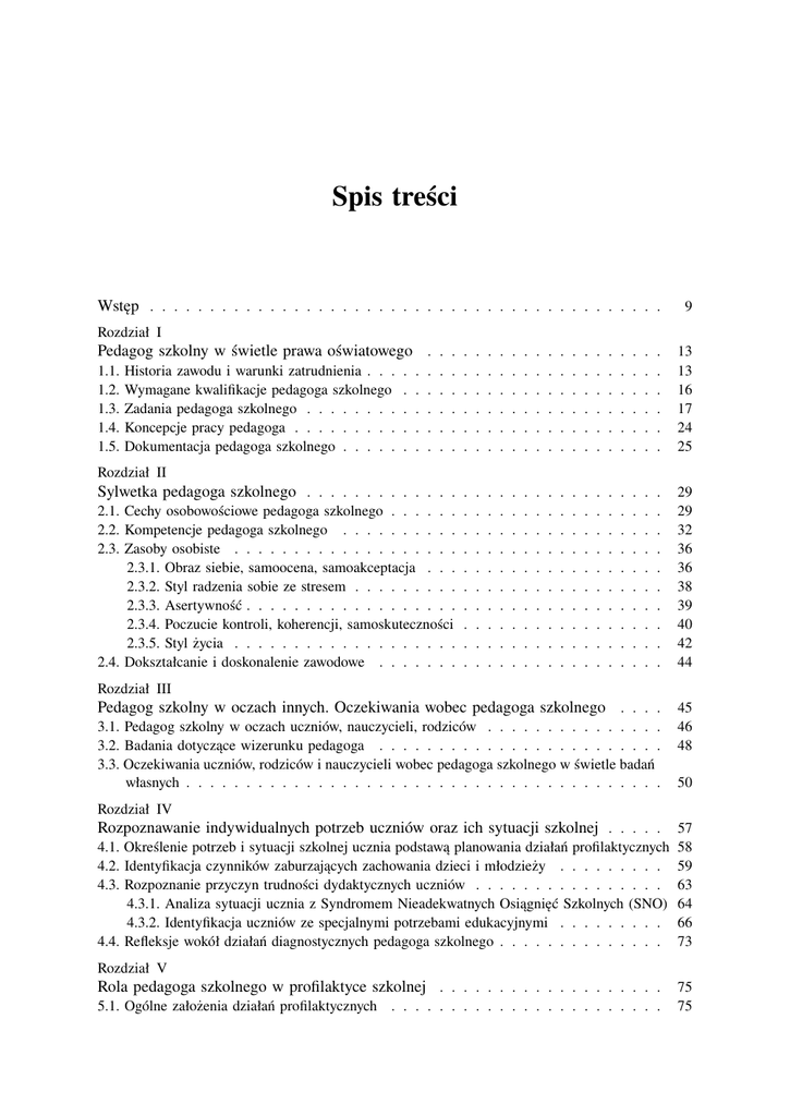 Spis treści Wstęp . . . . . . . . . . . . . . . . . . . . . . . . . . . . . . . . . . . . . . . . . . . 9 Rozdział I Pedagog szkolny w świetle prawa oświatowego . . . . . . . . . . . . . . . . . . . . 1.1. 1.2. 1.3. 1.4. 1.5. Historia zawodu i warunki zatrudnienia . . . Wymagane kwalifikacje pedagoga szkolnego Zadania pedagoga szkolnego . . . . . . . . Koncepcje pracy pedagoga . . . . . . . . . Dokumentacja pedagoga szkolnego . . . . . . . . . . . . . . . . . . . . . . . . . . . . . . . . . . . . . . . . . . . . . . . . . . . . . . . . . . . . . . . . . . . . . . . . . . . . . . . . . . . . . . . . . . . . . . . . . . . . . . . . . . . . . . . . . . . 13 13 16 17 24 25 Rozdział II Sylwetka pedagoga szkolnego . . . . . . . . . . . . . . . . . . . . . . . . . . . . . . 2.1. Cechy osobowościowe pedagoga szkolnego . . . . . . 2.2. Kompetencje pedagoga szkolnego . . . . . . . . . . 2.3. Zasoby osobiste . . . . . . . . . . . . . . . . . . . 2.3.1. Obraz siebie, samoocena, samoakceptacja . . . 2.3.2. Styl radzenia sobie ze stresem . . . . . . . . . 2.3.3. Asertywność . . . . . . . . . . . . . . . . . . 2.3.4. Poczucie kontroli, koherencji, samoskuteczności 2.3.5. Styl życia . . . . . . . . . . . . . . . . . . . 2.4. Dokształcanie i doskonalenie zawodowe . . . . . . . . . . . . . . . . . . . . . . . . . . . . . . . . . . . . . . . . . . . . . . . . . . . . . . . . . . . . . . . . . . . . . . . . . . . . . . . . . . . . . . . . . . . . . . . . . . . . . . . . . . . . . . . . . . . . . . . . . . . . . . . . . . . . . . . . . . . . . . . . . . . . . . . . . . . . . . . . 29 29 32 36 36 38 39 40 42 44 Rozdział III Pedagog szkolny w oczach innych. Oczekiwania wobec pedagoga szkolnego . . . . 3.1. Pedagog szkolny w oczach uczniów, nauczycieli, rodziców . . . . . . . . . . . . . . . 3.2. Badania dotyczące wizerunku pedagoga . . . . . . . . . . . . . . . . . . . . . . . . 3.3. Oczekiwania uczniów, rodziców i nauczycieli wobec pedagoga szkolnego w świetle badań własnych . . . . . . . . . . . . . . . . . . . . . . . . . . . . . . . . . . . . . . . . 45 46 48 50 Rozdział IV Rozpoznawanie indywidualnych potrzeb uczniów oraz ich sytuacji szkolnej . . . . . 4.1. Określenie potrzeb i sytuacji szkolnej ucznia podstawą planowania działań profilaktycznych 4.2. Identyfikacja czynników zaburzających zachowania dzieci i młodzieży . . . . . . . . . 4.3. Rozpoznanie przyczyn trudności dydaktycznych uczniów . . . . . . . . . . . . . . . . 4.3.1. Analiza sytuacji ucznia z Syndromem Nieadekwatnych Osiągnięć Szkolnych (SNO) 4.3.2. Identyfikacja uczniów ze specjalnymi potrzebami edukacyjnymi . . . . . . . . . 4.4. Refleksje wokół działań diagnostycznych pedagoga szkolnego . . . . . . . . . . . . . . 57 58 59 63 64 66 73 Rozdział V Rola pedagoga szkolnego w profilaktyce szkolnej . . . . . . . . . . . . . . . . . . . 5.1. Ogólne założenia działań profilaktycznych . . . . . . . . . . . . . . . . . . . . . . . 75 75 8 Spis treści 5.2. Szkolny program profilaktyki . . . . . . . . . . . . . . . . . . . . . . . . . . . . 5.2.1. Przepisy prawne . . . . . . . . . . . . . . . . . . . . . . . . . . . . . . . 5.2.2. Kontekst teoretyczny . . . . . . . . . . . . . . . . . . . . . . . . . . . . . 5.2.3. Projektowanie, realizacja i ewaluacja szkolnego programu profilaktyki . . . . 5.3. Profesjonalne programy profilaktyczne . . . . . . . . . . . . . . . . . . . . . . . 5.3.1. Programy dla dzieci i młodzieży z grupy niskiego ryzyka . . . . . . . . . . 5.3.2. Programy dla dzieci i młodzieży z grup podwyższonego ryzyka . . . . . . . 5.3.3. Programy dla liderów młodzieżowych . . . . . . . . . . . . . . . . . . . . 5.3.4. Programy edukacyjne dla nauczycieli rozwijające kompetencje wychowawcze 5.4. Refleksje wokół działań pedagoga w zakresie szkolnej profilaktyki . . . . . . . . . . . . . . . . . . . . . . . . . . . . . 81 82 83 84 86 86 89 90 91 93 Działania interwencyjne i mediacyjne w pracy pedagoga szkolnego . . . . . . . . . 95 96 Rozdział VI 6.1. Sytuacje kryzysowe w szkole i interwencja kryzysowa . . . . . . . . . . . 6.2. Działania interwencyjne pedagoga szkolnego podejmowane wobec uczniów z zaburzeniami zachowania . . . . . . . . . . . . . . . . . . . . . . . . . 6.3. Współpraca z rodzicami w zakresie działań interwencyjnych . . . . . . . . 6.4. Współpraca z policją, strażą miejską, kuratorami sądowymi . . . . . . . . . 6.5. Mediacje w pracy pedagoga szkolnego . . . . . . . . . . . . . . . . . . . 6.6. Refleksje wokół działań interwencyjnych i mediacyjnych pedagoga szkolnego . . . . . . . . . . . . . . . . . . . . . . . . . . . . . . . . . . . . 99 101 106 108 114 Rozdział VII Działania pedagoga szkolnego w zakresie wspierania uczniów w rozwoju emocjonalnym i społecznym . . . . . . . . . . . . . . . . . . . . . . . . . . . . . . . 117 7.1. Koncepcja resilience . . . . . . . . . . . . . . . . . . . . . . . . . . . . . . 7.2. Pedagog szkolny jako tutor . . . . . . . . . . . . . . . . . . . . . . . . . . . 7.3. Przeciwdziałanie odrzuceniu rówieśniczemu dzieci i młodzieży . . . . . . . . . 7.4. Wspieranie w rozwoju uczniów zdolnych . . . . . . . . . . . . . . . . . . . . 7.5. Refleksje wokół działań pedagoga wspierających ucznia w rozwoju emocjonalnym i społecznym . . . . . . . . . . . . . . . . . . . . . . . . . . . . . . . . . . . . . . . . . . . . . . . . . . 118 121 122 124 . . . . 129 Rozdział VIII Działania pedagoga szkolnego w zakresie udzielania pomocy psychologicznopedagogicznej . . . . . . . . . . . . . . . . . . . . . . . . . . . . . . . . . . . . . . . 131 8.1. Socjoterapia jako metoda wspierająca działania pedagoga szkolnego w pracy niedostosowanym i zagrożonym niedostosowaniem społecznym . . . . . . . 8.2. Praca z uczniem mającym trudności w nauce . . . . . . . . . . . . . . . . 8.2.1. Praca z uczniem z Syndromem Nieadekwatnych Osiągnięć Szkolnych 8.2.2. Praca z uczniem ze specyficznymi trudnościami w uczeniu się . . . 