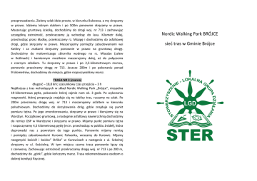 przeprowadzeniu. Zielony szlak idzie prosto, w kierunku Bukowca, a my skręcamy w prawo. Idziemy leśnym duktem i po 500m ponownie skręcamy w prawo. Maszerując gruntową ścieżką, dochodzimy do drogi woj. nr 713 i zachowując szczególną ostrożność, przekraczamy ją wchodząc do lasu. Kilometr dalej, przechodząc przez kładkę, przekraczamy rz. Miazgę i dochodzimy do asfaltowej drogi, gdzie skręcamy w prawo. Maszerujemy pomiędzy zabudowaniami wsi Kotliny i za znakami skręcamy ponownie w prawo na gruntową drogę. Dochodzimy do malowniczego zbiornika wodnego na rz. Miazdze (zalew w Kotlinach) i kamiennym mostkiem maszerujemy dalej, aż do połączenia z czarnym szlakiem. Tu skręcamy w prawo i po 2,5-kilometrowym marszu, ponownie przecinamy drogę nr 713. Jeszcze 200m i po pokonaniu ponad 9 kilometrów, dochodzimy do miejsca, gdzie rozpoczynaliśmy marsz. TRASA NR 3 (czarna) długość – 18,8 km; szacunkowy czas przejścia – 3 h Najdłuższa z tras wchodzących w skład Nordic Walking Park „Brójce”, niespełna 19-kilometrowa pętla, pokonanie której zajmie nam ok. 3 godz. Po wykonaniu rozgrzewki, której propozycja znajduje się na tablicy tras, ruszamy na szlak. Po 200m przecinamy drogę woj. nr 713 i maszerujemy asfaltem w kierunku południowym. Dochodzimy do skrzyżowania dróg, gdzie znajduje się punkt pomiaru tętna. Po jego zmonitorowaniu, skręcamy w prawo i kierujemy się na Wardzyn. Początkowo gruntową, a następnie asfaltową nawierzchnią dochodzimy do remizy OSP w Wardzynie i skręcamy w prawo. Mijamy punkt pomiaru tętna i rozpoczynamy 4,5 kilometrową pętlę (m.in. przechodząc w pobliżu źródeł), która doprowadzi nas z powrotem do tego punktu. Ponownie mijamy remizę i pomiędzy zabudowaniami Kurowic Folwarku, wracamy do Kurowic. Mijamy neogotycki kościół i boiska” Orlika” w Kurowicach a następnie z ul. Szkolnej skręcamy w ul. Kościelną. W tym miejscu czarna trasa ponownie łączy się z czerwoną. Zachowując ostrożność przekraczamy drogę woj. nr 713 i po 200 m, dochodzimy do „górki”, gdzie kończymy marsz. Trasa rekomendowana osobom o dobrej kondycji fizycznej. Nordic Walking Park BRÓJCE sieć tras w Gminie Brójce Nordic Walking Park „Brójce” Nordic Walking Park „Brójce” to jeden z czterech tego typu parków wytyczonych na obszarze działania Stowarzyszenia LGD STER. W skład Parku wchodzą 3 trasy: zielona – pętla o długości 5,1 km; czerwona – pętla o długości 9,1 km i czarna – pętla o długości 18,8 km. Wejście na trasy zlokalizowano w Kurowicach, obok tzw. „górki” – miejsca spotkań miłośników aktywnego wypoczynku na świeżym powietrzu. Trasy poprowadzone są chodnikami, drogami asfaltowymi i gruntowymi oraz leśnymi duktami. Na trasach zamontowano tablice zawierające propozycje ćwiczeń do samodzielnego wykonania oraz punkty pomiaru tętna. Trasy posiadają punkty wspólne, pokrywają się lub krzyżują. Umożliwia to dowolne wydłużanie lub skracanie przejść albo zmianę kierunku marszu. Oferta skierowana jest zarówno do entuzjastów nordic walkingu, jak i do biegaczy, rowerzystów czy narciarzy biegowych. Trzy pozostałe Nordic Walking Parki znajdują się na terenie Gminy Andrespol, Gminy Rokiciny i Gminy Nowosolna. Łącznie długość czterech parków wynosi 124,5 km. TRASA NR 1 (zielona) długość – 5,1 km; szacunkowy czas przejścia – ok. 1’20 h 5,1-kilometrowa pętla poprowadzona w okolicach wsi Kurowice i Bukowiec. Wejście na trasę zlokalizowano w Kurowicach obok tzw. „górki” – miejscu spotkań miłośników aktywnego wypoczynku na świeżym powietrzu. Po wykonaniu rozgrzewki, której propozycje zamieszczono na tablicy z opisem tras, gruntową drogą ruszamy w kierunku Bukowca. Początkowo przebieg trasy pokrywa się z czerwonym szlakiem. Po 700m dochodzimy do tablicy ćwiczeń, gdzie czerwony szlak skręca w prawo, a my maszerujemy dalej prosto. Na 1,5 km trasy, szlak rozdziela się. Wykonujemy niespełna 2-kilometrową pętlę i wracając od strony Bukowca, skręcamy w prawo. Kilometr dalej dochodzimy do ul. Różanej. Na wprost przed nami, widoczny w oddali kościół w Kurowicach, a my schodzimy z asfaltu w lewo, na gruntową drogę. Jeszcze kilkaset metrów i zamykamy zieloną pętlę, kończąc naszą wędrówkę. W sezonie zimowym trasa rekomendowana do narciarstwa biegowego. TRASA NR 2 (czerwona) długość – 9,1 km; szacunkowy czas przejścia – 2 h Ciekawa, poprowadzona w formie 9,1-kilometrowej pętli trasa, przeznaczona zarówno dla początkujących, jak i zaawansowanych piechurów. Ruszamy spod „górki” w Kurowicach i po 700m dochodzimy do tablicy ćwiczeń. Zamieszczone na niej instrukcje wykonywania poszczególnych ćwiczeń, pomogą w sprawnym ich