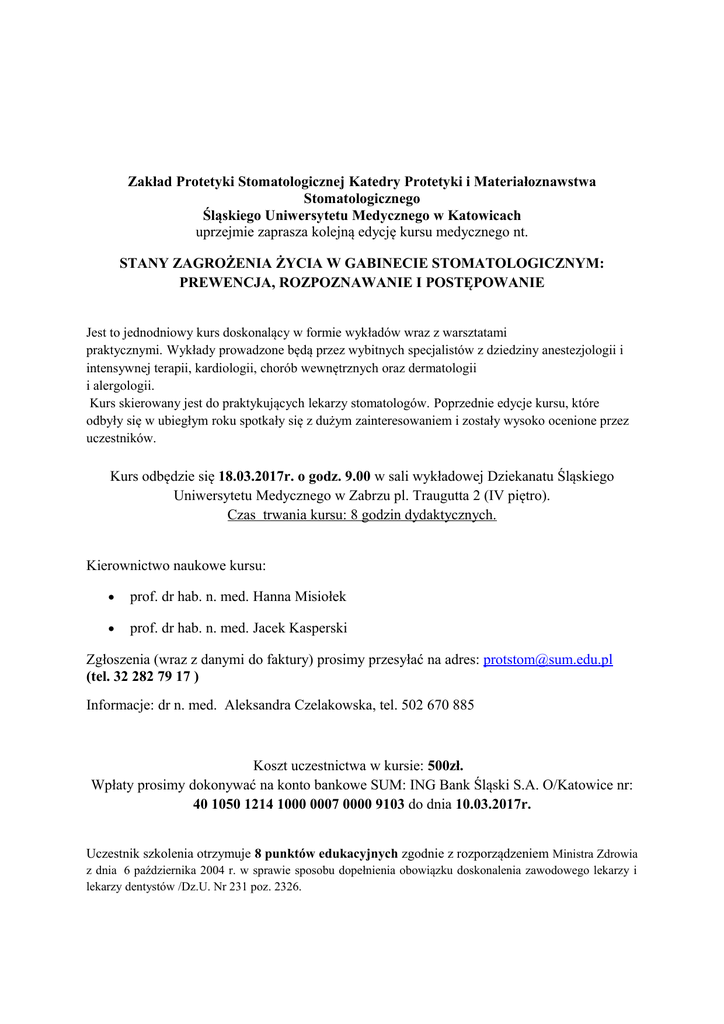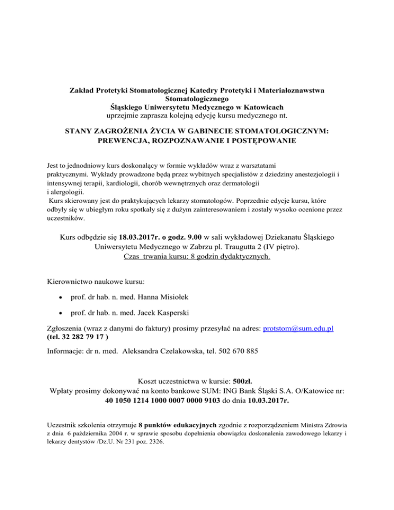 Zakład Protetyki Stomatologicznej Katedry Protetyki i Materiałoznawstwa Stomatologicznego Śląskiego Uniwersytetu Medycznego w Katowicach uprzejmie zaprasza kolejną edycję kursu medycznego nt. STANY ZAGROŻENIA ŻYCIA W GABINECIE STOMATOLOGICZNYM: PREWENCJA, ROZPOZNAWANIE I POSTĘPOWANIE Jest to jednodniowy kurs doskonalący w formie wykładów wraz z warsztatami praktycznymi. Wykłady prowadzone będą przez wybitnych specjalistów z dziedziny anestezjologii i intensywnej terapii, kardiologii, chorób wewnętrznych oraz dermatologii i alergologii. Kurs skierowany jest do praktykujących lekarzy stomatologów. Poprzednie edycje kursu, które odbyły się w ubiegłym roku spotkały się z dużym zainteresowaniem i zostały wysoko ocenione przez uczestników. Kurs odbędzie się 18.03.2017r. o godz. 9.00 w sali wykładowej Dziekanatu Śląskiego Uniwersytetu Medycznego w Zabrzu pl. Traugutta 2 (IV piętro). Czas trwania kursu: 8 godzin dydaktycznych. Kierownictwo naukowe kursu: prof. dr hab. n. med. Hanna Misiołek prof. dr hab. n. med. Jacek Kasperski Zgłoszenia (wraz z danymi do faktury) prosimy przesyłać na adres: [email protected] (tel. 32 282 79 17 ) Informacje: dr n. med. Aleksandra Czelakowska, tel. 502 670 885 Koszt uczestnictwa w kursie: 500zł. Wpłaty prosimy dokonywać na konto bankowe SUM: ING Bank Śląski S.A. O/Katowice nr: 40 1050 1214 1000 0007 0000 9103 do dnia 10.03.2017r. Uczestnik szkolenia otrzymuje 8 punktów edukacyjnych zgodnie z rozporządzeniem Ministra Zdrowia z dnia 6 października 2004 r. w sprawie sposobu dopełnienia obowiązku doskonalenia zawodowego lekarzy i lekarzy dentystów /Dz.U. Nr 231 poz. 2326. Program kursu: WYKŁAD WYKŁADOWCA Wstrząs – definicja, podział, objawy, postępowanie Wybrane stany zagrożenia życia. prof. dr hab. n. med. Hanna Misiołek Znieczulenie w gabinecie stomatologicznym (analgosedacja, znieczulenie ogólne, monitorowany nadzór anestezjologiczny) – konieczne wyposażenie, zagrożenia. Jak bezpiecznie uśmierzać ostry ból po ekstrakcji zęba. Klinika Anestezjologii i Intensywnej Terapii Katedry Anestezjologii, Intensywnej Terapii i Medycyny Ratunkowej w Zabrzu SUM w Katowicach Podstawowe i zaawansowane zabiegi resuscytacyjne (BLS, ALS) – ćwiczenia na fantomach. Pacjent ze wskazaniami do leczenia ppłytkowego/p-krzepliwego w gabinecie stomatologicznym. Co powinniśmy wiedzieć zanim przystąpimy do leczenia i czego wymagać od prowadzącego kardiologa? Profilaktyka antybiotykowa u chorych ze schorzeniami układu sercowo-naczyniowego leczonych stomatologicznie – komu, co i w jaki sposób? Wpływ chorób przyzębia na układ sercowonaczyniowy. Zabiegi implantologiczne u chorych ze schorzeniami kardiologicznymi – zasady kwalifikacji. Nadwrażliwość na środki znieczulenia miejscowego. Zaostrzenie astmy w gabinecie stomatologicznym. Omówienie przypadków sugerujących alergię na środki stomatologiczne. Anafilaksja w praktyce lekarza stomatologa. dr n. med. Szymon Białka dr n. med. Przemysław Trzeciak dr n. med. Mateusz Tajstra III Katedra i Oddział Kliniczny Kardiologii w Zabrzu SUM w Katowicach dr hab. n. med. Alicja Grzanka dr hab. n. med. Radosław Gawlik Katedra i Oddział Kliniczny Chorób Wewnętrznych, Dermatologii i Alergologii w Zabrzu SUM w Katowicach