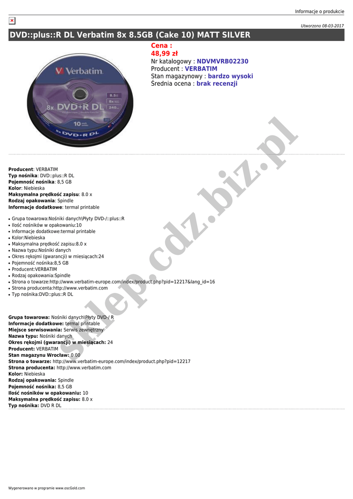 Informacje o produkcie Utworzono 08-03-2017 DVD::plus::R DL Verbatim 8x 8.5GB (Cake 10) MATT SILVER Cena : 48,99 zł iz .p l Nr katalogowy : NDVMVRB02230 Producent : VERBATIM Stan magazynowy : bardzo wysoki Średnia ocena : brak recenzji ● ● ● ● ● ● ● ● ● ● dz ● Grupa towarowa:Nośniki danych\Płyty DVD-/::plus::R Ilość nośników w opakowaniu:10 Informacje dodatkowe:termal printable Kolor:Niebieska Maksymalna prędkość zapisu:8.0 x Nazwa typu:Nośniki danych Okres rękojmi (gwarancji) w miesiącach:24 Pojemność nośnika:8,5 GB Producent:VERBATIM Rodzaj opakowania:Spindle Strona o towarze:http://www.verbatim-europe.com/index/product.php?pid=12217&lang_id=16 Strona producenta:http://www.verbatim.com Typ nośnika:DVD::plus::R DL .c ● le p ● .b Producent: VERBATIM Typ nośnika: DVD::plus::R DL Pojemność nośnika: 8,5 GB Kolor: Niebieska Maksymalna prędkość zapisu: 8.0 x Rodzaj opakowania: Spindle Informacje dodatkowe: termal printable sk Grupa towarowa: Nośniki danych\Płyty DVD-/ R Informacje dodatkowe: termal printable Miejsce serwisowania: Serwis zewnętrzny Nazwa typu: Nośniki danych Okres rękojmi (gwarancji) w miesiącach: 24 Producent: VERBATIM Stan magazynu Wrocław: 0.00 Strona o towarze: http://www.verbatim-europe.com/index/product.php?pid=12217 Strona producenta: http://www.verbatim.com Kolor: Niebieska Rodzaj opakowania: Spindle Pojemność nośnika: 8,5 GB Ilość nośników w opakowaniu: 10 Maksymalna prędkość zapisu: 8.0 x Typ nośnika: DVD R DL Wygenerowano w programie www.oscGold.com