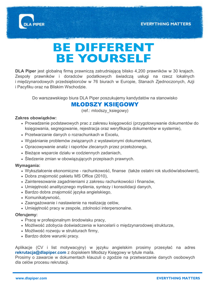DLA Piper jest globalną firmą prawniczą zatrudniającą blisko 4,200 prawników w 30 krajach. Zespoły prawników i doradców podatkowych świadczą usługi na rzecz lokalnych i międzynarodowych przedsiębiorców w 76 biurach w Europie, Stanach Zjednoczonych, Azji i Pacyfiku oraz na Bliskim Wschodzie. Do warszawskiego biura DLA Piper poszukujemy kandydatów na stanowisko MŁODSZY KSIĘGOWY (ref.: mlodszy_ksiegowy) Zakres obowiązków: Prowadzenie podstawowych prac z zakresu księgowości (przygotowywanie dokumentów do księgowania, segregowanie, rejestracja oraz weryfikacja dokumentów w systemie), Przetwarzanie danych o rozrachunkach w Excelu, Wyjaśnianie problemów związanych z wystawionymi dokumentami, Opracowywanie analiz i raportów zlecanych przez przełożonego, Bieżące wsparcie działu w codziennych zadaniach, Śledzenie zmian w obowiązujących przepisach prawnych. Wymagania: Wykształcenie ekonomiczne - rachunkowość, finanse (także ostatni rok studiów/absolwent), Dobra znajomość pakietu MS Office (2010), Zainteresowanie zagadnieniami z zakresu rachunkowości i finansów, Umiejętność analitycznego myślenia, syntezy i konsolidacji danych, Bardzo dobra znajomość języka angielskiego, Komunikatywność, Zaangażowanie i nastawienie na realizację celów, Umiejętność pracy w zespole, zdolności interpersonalne. Oferujemy: Pracę w profesjonalnym środowisku pracy, Możliwość zdobycia doświadczenia w kancelarii o międzynarodowej strukturze, Możliwość rozwoju w strukturach firmy, Bardzo dobre warunki pracy. Aplikacje (CV i list motywacyjny) w języku angielskim prosimy przesyłać na adres [email protected] z dopiskiem Młodszy Księgowy w tytule maila. Prosimy o zawarcie w dokumentach klauzuli o zgodzie na przetwarzanie danych osobowych dla celów procesu rekrutacji. www.dlapiper.com EVERYTHING MATTERS