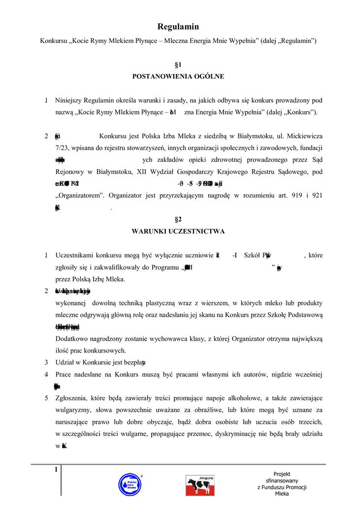 Regulamin Konkursu „Kocie Rymy Mlekiem Płynące – Mleczna Energia Mnie Wypełnia” (dalej „Regulamin”) §1 POSTANOWIENIA OGÓLNE Niniejszy Regulamin określa warunki i zasady, na jakich odbywa się konkurs prowadzony pod 1. nazwą „Kocie Rymy Mlekiem Płynące – ecMl 2. zna Energia Mnie Wypełnia” (dalej „Konkurs”). K onkursu jest Polska Izba Mleka z siedzibą w Białymstoku, ul. Mickiewicza ezmatornigO 7/23, wpisana do rejestru stowarzyszeń, innych organizacji społecznych i zawodowych, fundacji ych zakładów opieki zdrowotnej prowadzonego przez Sąd azor chenyodzilams cznblipu Rejonowy w Białymstoku, XII Wydział Gospodarczy Krajowego Rejestru Sądowego, pod ermnu RSK 0 0 30,75 PNI 45 2 - 30 - 85 - ,19 NGORE 20 21489 , anzw ejdal „Organizatorem”. Organizator jest przyrzekającym nagrodę w rozumieniu art. 919 i 921 eongwilcydksuK . §2 WARUNKI UCZESTNICTWA Uczestnikami konkursu mogą być wyłącznie uczniowie askl I 1. zgłosiły się i zakwalifikowały do Programu „My am otK an ekciuP aMl -I Szkół Pochwoydsta , które ” ozegiwanr przez Polską Izbę Mleka. 2. ctwoisneUz w esrkiuonK aegpol an iuensztwor zepr kaiesUctnz acpry ejcznastypl wykonanej dowolną techniką plastyczną wraz z wierszem, w których mleko lub produkty mleczne odgrywają główną rolę oraz nadesłaniu jej skanu na Konkurs przez Szkołę Podstawową emcl kacjiwfl srkowejun ezpr aztornigO i oegalntuw azniypr .odryagn Dodatkowo nagrodzony zostanie wychowawca klasy, z której Organizator otrzyma największą ilość prac konkursowych. 3. Udział w Konkursie jest bezpłatyn 4. Prace nadesłane na Konkurs muszą być pracami własnymi ich autorów, nigdzie wcześniej .skuroachKnyi mawedstzprionykblu 5. Zgłoszenia, które będą zawierały treści promujące napoje alkoholowe, a także zawierające wulgaryzmy, słowa powszechnie uważane za obraźliwe, lub które mogą być uznane za naruszające prawo lub dobre obyczaje, bądź dobra osobiste lub uczucia osób trzecich, w szczególności treści wulgarne, propagujące przemoc, dyskryminację nie będą brały udziału w e.srikuonK 1 Projekt sfinansowany z Funduszu Promocji Mleka 6. Konkurs prowadzony jest na terenie Rzeczypospolitej Polskiej, za pośrednictwem strony p:th / eko.wMlamchpK ./ §3 ZASADY PROWADZENIA KONKURSU 1. Zgłoszenia chsrowykuapn aidon 2. 01 .0 5 .201 do Konkursu można dokonywać w okresie od dnia 01.04.2016.r 6 .r W Konkursie nie mogą brać udziału pracownicy Organizatora ani ich małżonkowie, wstępni, zstępni, rodzeństwo, przysposobieni, przysposabiający. W przypadku, gdy zwycięzcami okażą się osoby wymienione w niniejszym punkcie, osoby te tracą uprawnienie do nagrody. 3. W celu zapewnienia nadzoru nad prawidłowym przebiegiem Konkursu, Organizator powoła komisję konkursową w trzyosobowym składzie (dalej „Komisja”). Organizator ma prawo odwołać członka Komisji Konkursowej lub wyznaczyć dla niego zastępstwo, jeżeli ze względu na okoliczności członek Komisji Konkursowej nie może sprawować swoich funkcji. Z posiedzeń Komisji Konkursowej zostanie sporządzony protokół, który będzie przechowywany w ebidzs iangOr Komisja Konkursowa podejmuje decyzje większością głosów. az.tor Decyzje Komisji Konkursowej mają charakter uznaniowy. 4. W celu wzięcia udziału w Konkursie Uczestnik powinien w czasie jego trwania spełnić łącznie warunki określone w Regulaminie, w szczególności: a. Z apoznać się z zasadami uczestnictwa w Konkursie i Regulaminem Konkursu b. W esiokr od 01.04 .201 6 .r do nyodzig 23:59 adni 0 1.0 6 .r za pośrednictwem 5 .201 Szkoły przesłać własnoręcznie wykonaną pracę plastyczną wraz z wierszem, w których ekolm blu pr odukty mleczne odgrywają główną rolę w eiormf uansk a n e sr a d eko@lm d.anbr lp , w tytule maila wpisując – „Kocie Rymy Mlekiem Płynące”. W mailu powinny zostać podane imię i nazwisko uczestnika, oznaczenie Szkoły ,wejaodsPt klzaorwichny wcy . Liczy się data wpływu pracy na serwer .aztornigO 5. Szkoła zapewnia Organizatora, że posiada zgodę rodziców bądź opiekunów prawnych Uczestnika na udział w K onkursie i na żądanie Organizatora prześle w terminie 7 dni oświadczenie rodzica/opiekuna prawoegn pod eormyg aickzenwylu acpry kejsuronw z .srkuonK 6. Zgłoszenie pracy do Konkursu jest równoznaczne z zaakceptowaniem Regulamiun srkKo i z nieodpłatnym przeniesieniem na Organizatora prawa majątkowego i osobistego do ejanzprkcy ao eldziu 2 eniem przez autora Organizatorowi nieodpłatnej, nieograniczonej Projekt sfinansowany z Funduszu Promocji Mleka terytorialnie licencji wyłącznej na wykorzystanie pracy konkursowej na wszystkich w e s i a cz .cjioatsplekhynz 7. Każdy Uczestnik Konkursu może dokonać Zgłoszenia w trakcie Konkursu wielokrotnie, może także otrzymać więcej niż jedną nagrodę w całym Konkursie. 8. W przypadku nadesłania przez różnych Uczestników lub tego samego Uczestnika Zgłoszenia zawierającego identyczną Pracę konkursową, w Konkursie bierze udział Uczestnik, który dokonał pierwszego chronologicznie Zgłoszenia. Organizator ma prawo kontaktowania się z Uczestnikami za pomocą cejizntyopkrl zaor poprzez przekazane Organizatorowi przez Uczestników kanały komunikacji. §4 ZASADY WYŁANIANIA ZWYCIĘZCÓW I NAGRODY 1. Nagrody będą przyznawane na następujących zasadach: Spośród carP a) konkursowych przesłanych w ramach Zgłoszeń w Konkursie sjaioKm Konkursowa wyłoni 3 (słownie: zytr ) r P ace srokun we . zytoruA chtaki a cr P ch zostają Zwycięzcami, a Szkoła której są uczniami, jeskuzy awopr srowykun do .odyragn Przy przyznawaniu Nagród Komisja weźmie pod uwagę następujące kryteria: )b .i i kreatywność pracy plastycznej, w tym jej oryginalność, jakość E kastey wykonania, niepowtarzalność zast,kintechjasow K reatywność i poprawność formy literackiej w tym: bezbłędność, staranność, .i orumehcipz 2. W Konkursie przyznawane będą następ