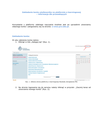 Zakładanie konta użytkownika na platformie e-learningowej – informacja dla prowadzących Korzystanie z platformy zdalnego nauczania możliwe jest po uprzednim utworzeniu własnego konta i zalogowaniu się na stronie: e-ziwz.prz.edu.pl. Zakładanie konta: W celu założenia konta należy: 1. Kliknąć w link „Zaloguj się” (Rys. 1). Rys. 1. Główna strona platformy e-learningowej Wydziału Zarządzania PRz 2. Na stronie logowania się do serwisu należy kliknąć w przycisk: „Zacznij teraz od utworzenia nowego konta” (Rys. 2). Rys. 2. Strona logowania do serwisu e-ziwz.prz.edu.pl 3. Na kolejnej stronie należy wypełnić wszystkie pola formularza oznaczone * (Rys. 3), wg poniższych zaleceń: Rys. 3. Formularz rejestracyjny do platformy e-learningowej Wydziału Zarządzania PPrz Nazwa użytkownika: nazwisko_imie (nazwę użytkownika wprowadzamy łącząc nazwisko i imię znakiem podkreślenia „_”, używając małych liter, bez polskich znaków) Hasło: musi zawierać co najmniej 8 znaków, przynajmniej: 1 liczbę, 1 małą literę, 1 wielką literę, 1 znak niealfabetyczny (np.: !, $, #, %) E-mail: w polu tym należy podać adres Konta Pocztowego Pracownika Politechniki Rzeszowskiej o domenie prz.edu.pl Nazwisko: Nazwisko pisane z użyciem polskich znaków, rozpoczynające się wielką literą Imię: Imię pisane z użyciem polskich znaków, rozpoczynające się wielką literą Miasto: Miasto pisane z użyciem polskich znaków, rozpoczynające się wielką literą. 4. Po wypełnieniu formularza należy kliknąć w przycisk: „Utwórz moje nowe konto”. 5. System wyśle mail aktywujący konto na podany w formularzu rejestracyjnym adres e-mail. Zawiera on prostą instrukcję, jak dokończyć rejestrację. Aby potwierdzić zamiar utworzenia konta, należy kliknąć na przesłany link. W ten sposób można utworzyć konto użytkownika na platformie e-learningowej Wydziału Zarządzania PRz. Domyślnie każdy nowy uczestnik przypisywany jest do grupy użytkowników typu: student, który po zalogowaniu posiada uprawnienia do korzystania z zasobów kursu, na który jest zapisany. Aby nabyć prawo do modyfikacji zawartości kursu należy uzyskać uprawnienia: Prowadzącego. W tym celu, na adres: [email protected] należy wysłać prośbę o nadanie uprawnień Prowadzącego oraz nazwę proponowanego kursu z jego lokalizacją. Kiedy administrator systemu wyśle zawiadomienie w e-mailu zwrotnym o nadaniu praw oraz utworzeniu odpowiedniego kursu, wówczas będzie można modyfikować jego zawartość i pełnić aktywną rolę wobec studentów.