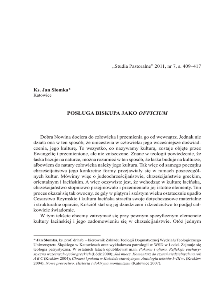 „Studia Pastoralne” 2011, nr 7, s. 409–417 Ks. Jan Słomka* Katowice POSŁUGA BISKUPA JAKO OFFICIUM Dobra Nowina dociera do człowieka i przemienia go od wewnątrz. Jednak nie działa ona w ten sposób, że unicestwia w człowieku jego wcześniejsze doświadczenia, jego kulturę. To wszystko, co nazywamy kulturą, zostaje objęte przez Ewangelię i przemienione, ale nie zniszczone. Znane w teologii powiedzenie, że łaska bazuje na naturze, można rozumieć w ten sposób, że łaska buduje na kulturze, albowiem do natury człowieka należy jego kultura. Tak więc od samego początku chrześcijaństwa jego konkretne formy przejawiały się w ramach poszczególnych kultur. Mówimy więc o judeochrześcijaństwie, chrześcijaństwie greckim, orientalnym i łacińskim. A więc oczywiste jest, że wchodząc w kulturę łacińską, chrześcijaństwo stopniowo przejmowało i przemieniało jej istotne elementy. Ten proces okazał się tak owocny, że gdy w piątym i szóstym wieku ostatecznie upadło Cesarstwo Rzymskie i kultura łacińska straciła swoje dotychczasowe materialne i strukturalne oparcie, Kościół stał się jej dziedzicem i dziedzictwo to podjął całkowicie świadomie. W tym tekście chcemy zatrzymać się przy pewnym specyficznym elemencie kultury łacińskiej i jego zadomowieniu się w chrześcijaństwie. Otóż jednym * Jan Słomka, ks. prof. dr hab. – kierownik Zakładu Teologii Dogmatycznej Wydziału Teologicznego Uniwersytetu Śląskiego w Katowicach oraz wykładowca patrologii w WSD w Łodzi. Zajmuje się teologią patrystyczną. W ostatnich latach opublikował m.in. Pokarm i ofiara. Refleksja eucharystyczna wczesnych ojców greckich (Łódź 2000); Jak miecz. Komentarz do czytań niedzielnych na rok A B C (Kraków 2004); Chrzest i pokuta w Kościele starożytnym. Antologia tekstów I–III w. (Kraków 2004); Nowe proroctwo. Historia i doktryna montanizmu (Katowice 2007). 410 KS. JAN SŁOMKA z przykładów przyjmowania i przemieniania dziedzictwa łacińskiego przez Kościół jest proces przejmowania na użytek praktyki i teologii posługi biskupiej rzymskiego pojmowania urzędu – officium. Łacińskie pojęcie officium oznacza przede wszystkim obowiązek, powinność. Ale jego znaczenie nie dotyczy wyłącznie wąsko pojmowanej – jak byśmy to dzisiaj powiedzieli – „etyki zawodowej”. Właśnie w tym słowie język łaciński wyraził rzymską wersję stoickiego ideału doskonałości, pełni człowieczeństwa. Ale też bardzo szybko zaczęto go używać na określenie urzędu w administracji rzymskiej. Rzymianin spełniał swoje życie w służbie państwu, społeczności. Podstawowym wyrazem tej służby było właśnie officium, podjęcie i ofiarne wywiązywanie się z obowiązków wynikających z pełnionego urzędu. Ten ideał Rzymianina został bodaj najdobitniej przedstawiony przez Cycerona (106–43 przed Chr.) w dziele noszącym tytuł właśnie De officiis. Ideał ów opiera się na czterech cnotach, które kilka wieków później św. Ambroży nazwie cnotami kardynalnymi. Kościoły zachodnie, łacińskie, w pierwszych wiekach chętnie powoływały na biskupów ludzi z doświadczeniem urzędniczym. Jednym z pierwszych był św. Cyprian (zm. 14 IX 258), wybrany na biskupa Kartaginy w 248 roku. Jak wiadomo, nawrócił się on już jako dorosły człowiek, prawdopodobnie w roku 246 lub 247. Pochodzący z arystokratycznej rodziny, był od dzieciństwa kształcony i przygotowywany do zajmowania ważnych stanowisk w administracji rzymskiej. Faktycznie też zaczął te urzędy sprawować. A więc gdy wkrótce po nawróceniu został wybrany na biskupa Kartaginy1, przyniósł ze sobą całe doświadczenie urzędnika rzymskiego. Jednym ze świadectw praktycznego zastosowania tego doświadczenia jest doskonale zachowany zbiór korespondencji: kancelarię i archiwum biskupie Cyprian zorganizował na wzór rzymski. Cyprian nie prowadził teoretycznych rozważań na temat sposobu i zakresu adaptacji kultury rzymskiej przez chrześcijaństwo. Był on człowiekiem praktyki, a więc to w działaniu, w podejmowaniu kolejnych decyzji wyrażała się jego formacja i jego stanowisko w tych kwestiach. Ale podjął refleksję nad naturą Kościoła i znaczeniem biskupa dla Kościoła. Jego rzymska formacja i rzymskie pojmowanie urzędu – officium – w znaczący sposób ukształtowały tę właśnie refleksję. To, jak Cyprian rozumie rolę biskupa w Kościele, najdobitniej ujawnia się podczas kolejnych sporów, jakie przyszyło mu toczyć, a zwłaszcza w ramach sporu z biskupem Rzymu – Stefanem. Z pewnością przy jego wyborze miały znaczenie wcześniejsze urzędy i wynikające z nich doświadczenie, gdyż Kościół w Kartaginie był już wtedy dużym, dojrzałym Kościołem. Było tam wielu doświadczonych i zasłużonych prezbiterów. Dlatego znamienne jest, że wybierający wyżej od nich ocenili nowo nawróconego Cypriana jako kandydata na ich biskupa. Jego gorliwość w wierze na pewno miała znaczenie, ale nie mogła być ona decydująca. Na pewno podczas wyboru Cypriana na biskupa musiano jakoś odnieść się do słów św. Pawła z Pierwszego Listu do Tymoteusza 3,6-7 o tym, aby nie wybierać na biskupa „świeżo ochrzczonego”. A więc sama gorliwość w wierze Cypriana nie mogła być decydującym argumentem za wyborem, ta wszak nie była niczym niezwykłym u neofitów. 1 POSŁUGA BISKUPA JAKO OFFICIUM 411 Powszechnie znane jest jego stwierdzenie, że „poza Kościołem nie ma zbawienia”. Sformułował je w Liście 73., poświęconym głównie problemowi ważności chrztu heretyków. Jak wiadomo, Cyprian stał na stanowisku, że tylko chrzest udzielony w Kościele, a więc w jedności z biskupem, jest ważny, to znaczy przynosi odpuszczenie grzechów i otwiera drogę do zbawienia. Swoją argumentację opierał przede wszystkim na przekonaniu, że to biskupi, jako następcy apostołów, są jedynymi szafarzami darów, jakie Chrystus zosta