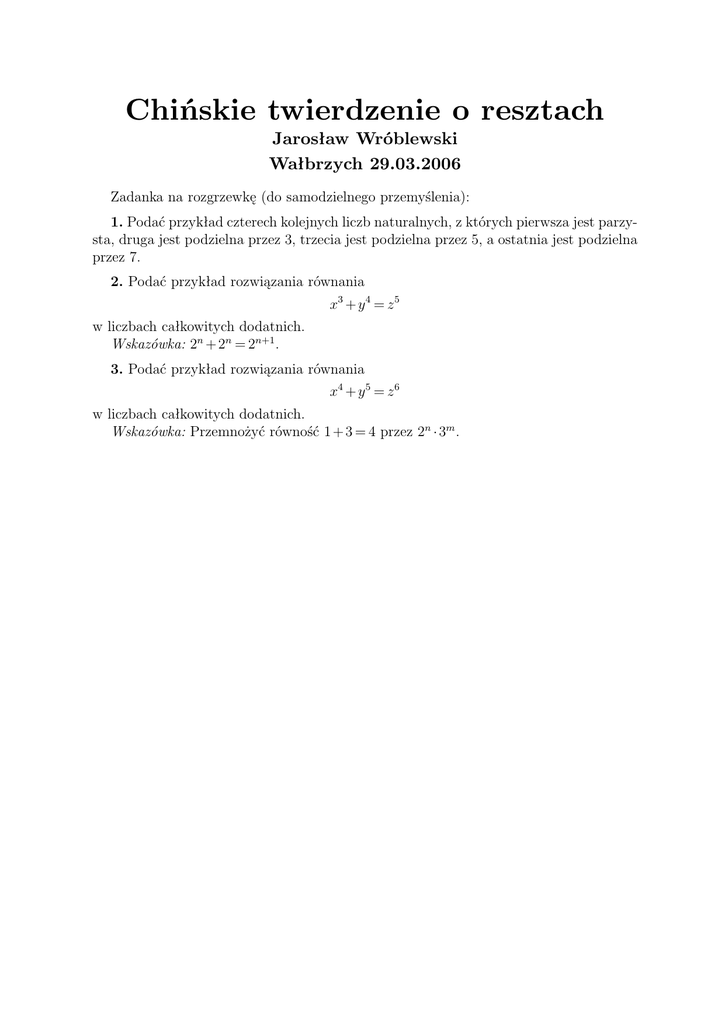 Chińskie twierdzenie o resztach Jarosław Wróblewski Wałbrzych 29.03.2006 Zadanka na rozgrzewkę (do samodzielnego przemyślenia): 1. Podać przykład czterech kolejnych liczb naturalnych, z których pierwsza jest parzysta, druga jest podzielna przez 3, trzecia jest podzielna przez 5, a ostatnia jest podzielna przez 7. 2. Podać przykład rozwiązania równania x3 + y 4 = z 5 w liczbach całkowitych dodatnich. Wskazówka: 2n + 2n = 2n+1 . 3. Podać przykład rozwiązania równania x4 + y 5 = z 6 w liczbach całkowitych dodatnich. Wskazówka: Przemnożyć równość 1 + 3 = 4 przez 2n · 3m . Twierdzenie chińskie o resztach mówi, że dla dowolnych liczb całkowitych r1 ,r2 ,...,rn i naturalnych q1 ,q2 ,...,qn (0 nie jest u nas liczbą naturalną) istnieje takie r, że q1 |r − r1 q2 |r − r2 ....................... qn |r − rn o ile dla dowolnych 1 ¬ i < j ¬ n zachodzi podzielność N W D(qi ,qj )|ri − rj . Ten ostatni warunek jest spełniony na przykład wtedy, gdy liczby q1 ,q2 ,...,qn są parami względnie pierwsze, gdyż wówczas N W D(qi ,qj ) = 1 dla i 6= j. Innymi słowy możemy zawsze znaleźć liczbę r, która spełnia ustalone przez nas postulaty typu: ”niech r dzieli się przez qi z resztą ri ”, jeśli tylko między tymi postulatami nie ma oczywistej sprzeczności. Nie sposób bowiem żądać, aby liczba dzieliła się przez 6 z resztą 2 i jednocześnie przez 10 z resztą 3, bo to oznaczałoby, że na pytanie czy liczba ma być parzysta odpowiadamy, że jesteśmy za, a nawet przeciw. 8 = 22 · 2 9 = 32 48 = 42 · 3 49 = 72 50 = 52 · 2 242 = 112 · 2 243 = 92 · 3 244 = 22 · 61 245 = 72 · 5 844 = 22 · 211 845 = 132 · 5 846 = 32 · 94 847 = 112 · 7 848 = 42 · 53 Dowieść, że istnieje 2006 kolejnych liczb naturalnych, z których każda jest podzielna przez kwadrat liczby naturalnej. Zadanie 4: 4|n 9|n + 1 25|n + 2 49|n + 3 121|n + 4 ....................... p2k |n + k − 1 ....................... p22006|n + 2005 14 = 2 · 7 15 = 3 · 5 644 = 22 · 7 · 23 645 = 3 · 5 · 43 646 = 2 · 17 · 19 134043 = 3 · 7 · 13 · 491 134044 = 22 · 23 · 31 · 47 134045 = 5 · 17 · 19 · 83 134046 = 2 · 32 · 11 · 677 Dowieść, że istnieje 2006 kolejnych liczb naturalnych, z których każda ma co najmniej 2006 dzielników pierwszych. Zadanie 5: Dowieść, że istnieje 1000001 kolejnych liczb naturalnych, z których żadna nie jest sumą 2 kwadratów liczb całkowitych. Zadanie 6: Rozwiązanie: Skorzystamy z charakteryzacji liczb będących sumami 2 kwadratów. Otóż liczba naturalna jest sumą 2 kwadratów liczb całkowitych wtedy i tylko wtedy, gdy w rozkładzie na czynniki pierwsze liczby pierwsze postaci 4k + 3 występują tylko w parzystych potęgach. Tak naprawdę wystarczy wiedzieć, że jeżeli q = 4k + 3 jest liczbą pierwszą, to liczba podzielna przez q, ale niepodzielna przez q 2 nie może być sumą 2 kwadratów. Niech q1 = 3, q2 = 7, q3 = 11, q4 = 19, ..., q1000000 = 32445143, q1000001 = 32445191 będą liczbami pierwszymi podzielnymi przez 4 z resztą 3. Zażądamy, aby n + k − 1 ≡ qk (mod qk2 ) dla k = 1,2,3,...,1000001. Spełnienie takiego układu warunków zapewnia, że liczby n,n + 1,n + 2,...,n + 1000000 nie są sumami 2 kwadratów. Następujące pytanie zostało postawione prelegentowi przez Jacka Świątkowskiego w czasie wieczornego spaceru po wsi Mysłów (woj. jeleniogórskie): Na płaszczyźnie dany jest pionowy odcinek długości 1995 nie zawierający żadnych punktów kratowych (t.j. punktów o obu współrzędnych całkowitych). Czy można tak poruszać tym odcinkiem, aby w żadnym momencie nie zawierał on punktów kratowych, a po zakończeniu ruchu był położony poziomo? Zadanie 7: Rozwiązanie: Skorzystamy z wyniku poprzedniego zadania. Niech n będzie takie, że liczby n,n + 1,n + 2,...,n + 1000000 nie są sumami 2 kwadratów. Rozważmy okręgi o środku w √ √ początku układu współrzędnychi promieniach r = n i R = n + 1000000. Z własności liczby n wynika, że na żadnym z tych okręgów, ani w pierścieniu między nimi nie ma punktów kratowych - na tych okręgach są co prawda punkty kratowe, ale między nimi nie ma). Z twierdzenia √ Pitagorasa łatwo wyliczamy, że między okręgami można umieścić odcinek długości 2 R2 − r2 = 2000 Obrót wokół początku układu współrzędnych jest żądanym ruchem. Po wykonaniu obrotu o 90o odcinek stanie się poziomy, a po drodze nie napotka na punkty kratowe, gdyż ruch odbywa się w pierścieniowym obszarze, w którym takowych punktów nie ma. Zadanie na pożegnanie. Dowieść, że równanie x2005 + y 2006 + z 2007 = t2010 ma rozwiązanie w liczbach naturalnych x,y,z,t.