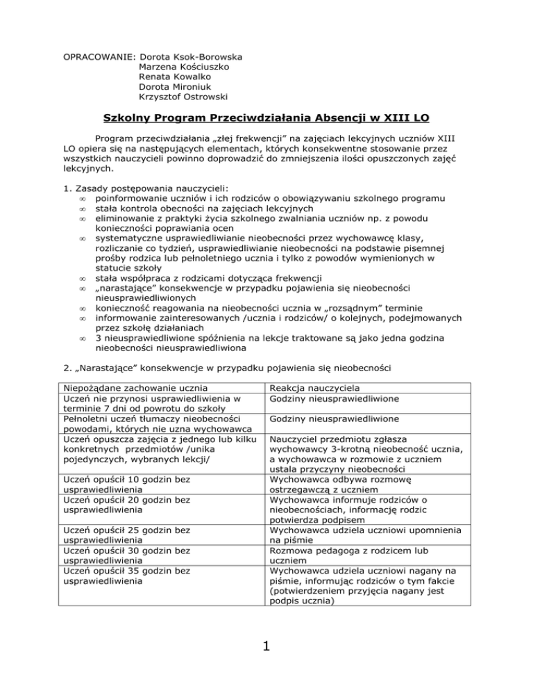 OPRACOWANIE: Dorota Ksok-Borowska Marzena Kościuszko Renata Kowalko Dorota Mironiuk Krzysztof Ostrowski Szkolny Program Przeciwdziałania Absencji w XIII LO Program przeciwdziałania „złej frekwencji” na zajęciach lekcyjnych uczniów XIII LO opiera się na następujących elementach, których konsekwentne stosowanie przez wszystkich nauczycieli powinno doprowadzić do zmniejszenia ilości opuszczonych zajęć lekcyjnych. 1. Zasady postępowania nauczycieli: • poinformowanie uczniów i ich rodziców o obowiązywaniu szkolnego programu • stała kontrola obecności na zajęciach lekcyjnych • eliminowanie z praktyki Ŝycia szkolnego zwalniania uczniów np. z powodu konieczności poprawiania ocen • systematyczne usprawiedliwianie nieobecności przez wychowawcę klasy, rozliczanie co tydzień, usprawiedliwianie nieobecności na podstawie pisemnej prośby rodzica lub pełnoletniego ucznia i tylko z powodów wymienionych w statucie szkoły • stała współpraca z rodzicami dotycząca frekwencji • „narastające” konsekwencje w przypadku pojawienia się nieobecności nieusprawiedliwionych • konieczność reagowania na nieobecności ucznia w „rozsądnym” terminie • informowanie zainteresowanych /ucznia i rodziców/ o kolejnych, podejmowanych przez szkołę działaniach • 3 nieusprawiedliwione spóźnienia na lekcje traktowane są jako jedna godzina nieobecności nieusprawiedliwiona 2. „Narastające” konsekwencje w przypadku pojawienia się nieobecności NiepoŜądane zachowanie ucznia Uczeń nie przynosi usprawiedliwienia w terminie 7 dni od powrotu do szkoły Pełnoletni uczeń tłumaczy nieobecności powodami, których nie uzna wychowawca Uczeń opuszcza zajęcia z jednego lub kilku konkretnych przedmiotów /unika pojedynczych, wybranych lekcji/ Uczeń opuścił 10 godzin bez usprawiedliwienia Uczeń opuścił 20 godzin bez usprawiedliwienia Uczeń opuścił 25 godzin bez usprawiedliwienia Uczeń opuścił 30 godzin bez usprawiedliwienia Uczeń opuścił 35 godzin bez usprawiedliwienia Reakcja nauczyciela Godziny nieusprawiedliwione Godziny nieusprawiedliwione Nauczyciel przedmiotu zgłasza wychowawcy 3-krotną nieobecność ucznia, a wychowawca w rozmowie z uczniem ustala przyczyny nieobecności Wychowawca odbywa rozmowę ostrzegawczą z uczniem Wychowawca informuje rodziców o nieobecnościach, informację rodzic potwierdza podpisem Wychowawca udziela uczniowi upomnienia na piśmie Rozmowa pedagoga z rodzicem lub uczniem Wychowawca udziela uczniowi nagany na piśmie, informując rodziców o tym fakcie (potwierdzeniem przyjęcia nagany jest podpis ucznia) 1 Uczeń opuścił 40 godzin bez usprawiedliwienia Dyrektor udziela uczniowi nagany na piśmie Uczeń nadal opuszcza zajęcia bez usprawiedliwienia - Wniosek o skreślenie z listy uczniów lub - wniosek do sądu rodzinnego i nieletnich o zainteresowanie się sytuacją ucznia w przypadku ucznia niepełnoletniego - wniosek opracowuje wychowawca klasy z pedagogiem szkolnym - Dyrektor ZSOMS moŜe zawiesić decyzję o skreśleniu, gdy uczeń podpisze zobowiązanie o poprawie i otrzyma poręczenie wychowawcy lub Samorządu Szkolnego Rodzic nie kontaktuje się ze szkołą na prośbę wychowawcy lub pedagoga bez podania przyczyn Rodzic nie kontaktuje się ze szkołą mimo pisemnego wezwania pedagoga szkolnego Rodzic nie zgłasza się mimo pisemnego wezwania dyrektora szkoły Pisemne wezwanie podpisane przez pedagoga szkolnego Rodzic bezkrytycznie usprawiedliwia nieobecności dziecka /bez uzasadnionej przyczyny np. choroba/, a ich ilość niepokoi wychowawcę Uczeń opuścił ponad 50% godzin Pisemne wezwanie podpisane przez dyrektora szkoły Wniosek do sądu rodzinnego i nieletnich o zainteresowanie się sytuacją rodzinną ucznia Rozmowa z pedagogiem MoŜe skutkować brakiem klasyfikacji z jednego lub kilku przedmiotów – egzamin klasyfikacyjny 3. JeŜeli zostały spełnione warunki do zastosowania kary statutowej wyŜszego rzędu, dopuszcza się jej wymierzenie bez konieczności stosowania kar niŜszych. 4. Monitoring realizacji szkolnego programu analiza frekwencji uczniów dokonywana przez wychowawcę raz w tygodniu i do 8 dnia następnego miesiąca zestawienie frekwencji uczniów według dzienników lekcyjnych dokonywane przez pedagoga szkolnego raz w miesiącu do 10 dnia kaŜdego miesiąca ustalenie przyczyn nieobecności uczniów klas, w których zanotowano najniŜszą frekwencję ilość kar statutowych i ich skuteczność zestawienie wysłanych pism o opuszczaniu zajęć lekcyjnych do rodziców zestawienie ilości indywidualnych kontaktów z rodzicami /z wychowawcą, pedagogiem/ dotyczących opuszczania zajęć lekcyjnych. 2