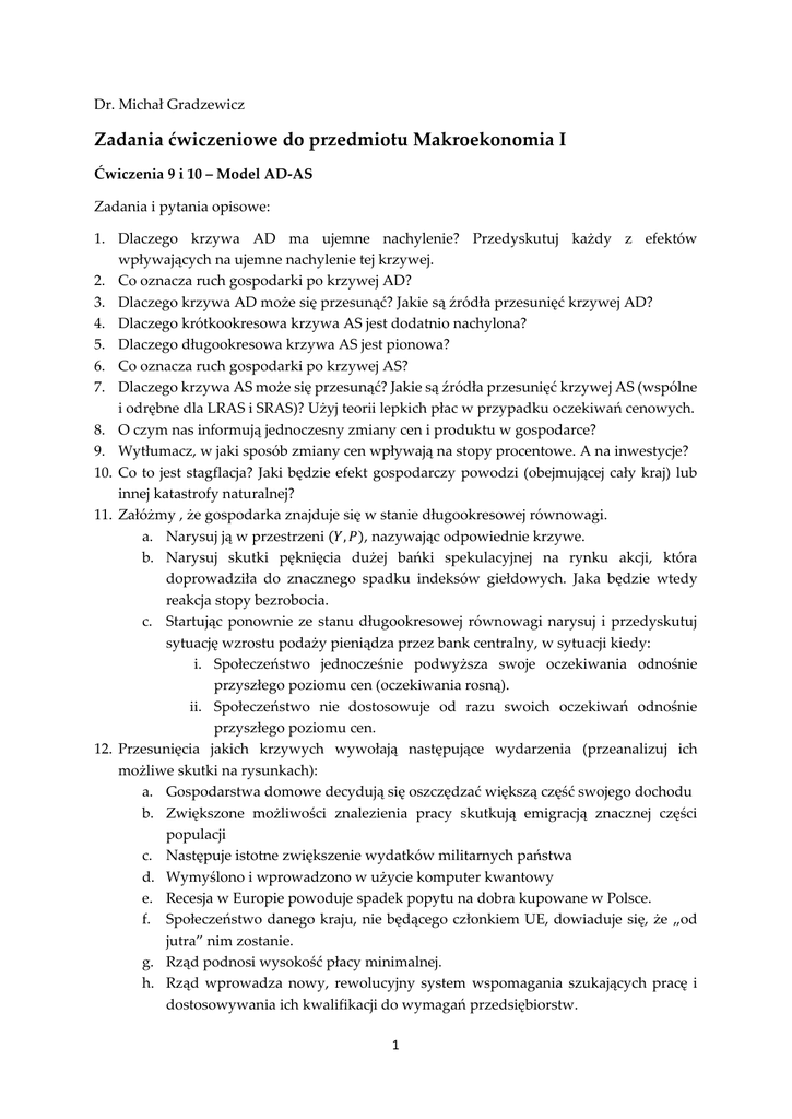 Dr. Michał Gradzewicz Zadania ćwiczeniowe do przedmiotu Makroekonomia I Ćwiczenia 9 i 10 – Model AD-AS Zadania i pytania opisowe: 1. Dlaczego krzywa AD ma ujemne nachylenie? Przedyskutuj każdy z efektów wpływających na ujemne nachylenie tej krzywej. 2. Co oznacza ruch gospodarki po krzywej AD? 3. Dlaczego krzywa AD może się przesunąć? Jakie są źródła przesunięć krzywej AD? 4. Dlaczego krótkookresowa krzywa AS jest dodatnio nachylona? 5. Dlaczego długookresowa krzywa AS jest pionowa? 6. Co oznacza ruch gospodarki po krzywej AS? 7. Dlaczego krzywa AS może się przesunąć? Jakie są źródła przesunięć krzywej AS (wspólne i odrębne dla LRAS i SRAS)? Użyj teorii lepkich płac w przypadku oczekiwań cenowych. 8. O czym nas informują jednoczesny zmiany cen i produktu w gospodarce? 9. Wytłumacz, w jaki sposób zmiany cen wpływają na stopy procentowe. A na inwestycje? 10. Co to jest stagflacja? Jaki będzie efekt gospodarczy powodzi (obejmującej cały kraj) lub innej katastrofy naturalnej? 11. Załóżmy , że gospodarka znajduje się w stanie długookresowej równowagi. a. Narysuj ją w przestrzeni (𝑌, 𝑃), nazywając odpowiednie krzywe. b. Narysuj skutki pęknięcia dużej bańki spekulacyjnej na rynku akcji, która doprowadziła do znacznego spadku indeksów giełdowych. Jaka będzie wtedy reakcja stopy bezrobocia. c. Startując ponownie ze stanu długookresowej równowagi narysuj i przedyskutuj sytuację wzrostu podaży pieniądza przez bank centralny, w sytuacji kiedy: i. Społeczeństwo jednocześnie podwyższa swoje oczekiwania odnośnie przyszłego poziomu cen (oczekiwania rosną). ii. Społeczeństwo nie dostosowuje od razu swoich oczekiwań odnośnie przyszłego poziomu cen. 12. Przesunięcia jakich krzywych wywołają następujące wydarzenia (przeanalizuj ich możliwe skutki na rysunkach): a. Gospodarstwa domowe decydują się oszczędzać większą część swojego dochodu b. Zwiększone możliwości znalezienia pracy skutkują emigracją znacznej części populacji c. Następuje istotne zwiększenie wydatków militarnych państwa d. Wymyślono i wprowadzono w użycie komputer kwantowy e. Recesja w Europie powoduje spadek popytu na dobra kupowane w Polsce. f. Społeczeństwo danego kraju, nie będącego członkiem UE, dowiaduje się, że „od jutra” nim zostanie. g. Rząd podnosi wysokość płacy minimalnej. h. Rząd wprowadza nowy, rewolucyjny system wspomagania szukających pracę i dostosowywania ich kwalifikacji do wymagań przedsiębiorstw. 1 13. Rozważmy gospodarkę opisaną następującymi równaniami (jest to zbliżona gospodarka do tej, którą omawialiśmy na ćwiczeniach z IS-LM, zadanie 11): 𝑌 = 𝐶 + 𝐼 + 𝐺 (tożsamość dochodu) 𝐶 = 200 + 0.9𝑌𝑑 (konsumpcja) 𝐼 = 200 − 500𝑅 (inwestycje) 𝑀 = (0.8𝑌 − 200𝑅)𝑃 (popyt na pieniądz) gdzie stawka podatkowa 𝑡 = 0.2. a) Znajdź (z krzywej LM) równanie definiujące produkt jako funkcję realnej podaży pieniądza i stopy procentowej b) Znajdź (z krzywej LM) stopę procentową jako funkcję dochodu i wydatków rządowych c) Wyprowadź krzywą zagregowanego popytu (produkt jako funkcję realnej podaży pieniądza i wydatków rządowych). d) Jaki będzie wpływ na produkt (przy stałym poziomie cen) wzrostu wydatków rządowych o 10 mld zł? Jak to się ma do prostego mnożnika wydatków rządowych i jakie jest źródło różnicy? e) Jaki jest wpływ na zagregowany popyt wzrostu podaży pieniądza o 10 mld zł (przy stałym poziomie cen)? 14. Rozważmy gospodarkę opisaną następującymi równaniami (jest to ta sama gospodarka, która omawialiśmy na ćwiczeniach z IS-LM, zadanie 11): 𝑌 = 𝐶 + 𝐼 + 𝐺 (tożsamość dochodu) 𝐶 = 400 + 0.8𝑌𝑑 (konsumpcja) 𝐼 = 400 − 1000𝑅 (inwestycje) 𝑀 = (0.4𝑌 − 1000𝑅)𝑃 (popyt na pieniądz) gdzie stawka podatkowa 𝑡 = 0.5. f) Wyprowadź krzywą zagregowanego popytu (produkt jako funkcję realnej podaży pieniądza i wydatków rządowych). g) Jaki będzie wpływ na produkt (przy stałym poziomie cen) wzrostu wydatków rządowych o 10 mld zł? Przedyskutuj wynik na tle prostego mnożnika wydatków rządowych. h) Jaki jest wpływ na zagregowany popyt wzrostu podaży pieniądza o 10 mld zł (przy stałym poziomie cen)? 15. W gospodarce istnieją dwa warianty uzgodnień płacowych: (I) Połowa pracowników może renegocjować warunki płacowe swoich kontraktów o pracę na okres roczny w styczniu, a druga połowa w lipcu; (II) wszyscy pracownicy mogą renegocjować w styczniu warunki płacowe swoich kontraktów o pracę na okres roczny a. Który system zapewni większą giętkość płac w krótszym i dłuższym okresie b. Jak będzie wyglądał efekt wzrostu cen w lutym danego roku na płace w bardzo krótkim okresie, w horyzoncie pół roku, roku i dłuższym? 16. Poniżej skonfrontowano z sobą pewne rozwiązania instytucjonalne wpływające na elastyczność dostosowywania się płac i cen w gospodarce, a nazywanych sztywnościami. Które rozwiązania można scharakteryzować jako wprowadzające większe sztywności? Jakie są makroekonomiczne konsekwencje tych sztywności? 2 a. b. c. d. e. Płace są ustalane w formie nominalnej versus płace są automatycznie indeksowane bieżącą inflacją Na rynku pracy dominują (kodeksowe) umowy o pracę vs. na rynku pracy dominują umowy o dzieło/zlecenie Przedsiębiorstwa związane są z odbiorcami swoich produktów kontraktami długookresowymi vs. przedsiębiorstwa stosują techniki lean production (czasami nazywane też just-in-time-production) Przedsiębiorstwa na bieżąco analizują warunki popytowo-podażowe na rynku vs. przedsiębiorstwa nie przeznaczają dużych zasobów na analizy warunków rynkowych i rzadko podejmują decyzje o zmianie warunków produkcji W gospodarce jest bardzo dużo przedsiębiorstw oferujących swoje produkty wyłącznie w sieci vs. w gospodarce jest bardzo dużo przedsiębiorstw kontaktujących się